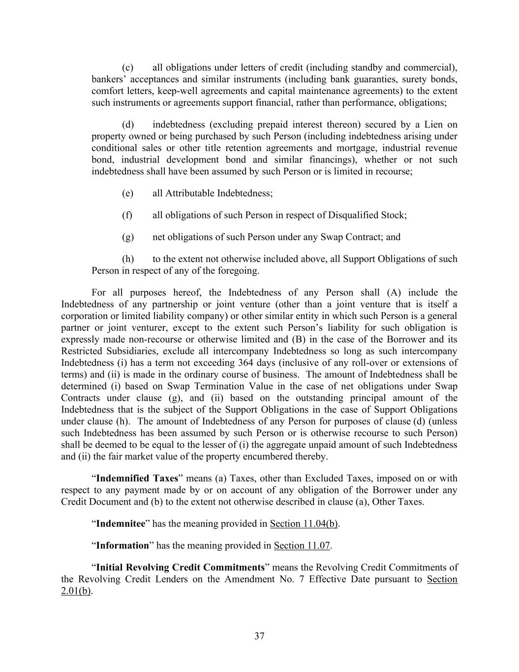 37 (c) all obligations under letters of credit (including standby and commercial), bankers’ acceptances and similar instruments (including bank guaranties, surety bonds, comfort letters, keep-well agreements and capital maintenance agreements) to the extent such instruments or agreements support financial, rather than performance, obligations; (d) indebtedness (excluding prepaid interest thereon) secured by a Lien on property owned or being purchased by such Person (including indebtedness arising under conditional sales or other title retention agreements and mortgage, industrial revenue bond, industrial development bond and similar financings), whether or not such indebtedness shall have been assumed by such Person or is limited in recourse; (e) all Attributable Indebtedness; (f) all obligations of such Person in respect of Disqualified Stock; (g) net obligations of such Person under any Swap Contract; and (h) to the extent not otherwise included above, all Support Obligations of such Person in respect of any of the foregoing. For all purposes hereof, the Indebtedness of any Person shall (A) include the Indebtedness of any partnership or joint venture (other than a joint venture that is itself a corporation or limited liability company) or other similar entity in which such Person is a general partner or joint venturer, except to the extent such Person’s liability for such obligation is expressly made non-recourse or otherwise limited and (B) in the case of the Borrower and its Restricted Subsidiaries, exclude all intercompany Indebtedness so long as such intercompany Indebtedness (i) has a term not exceeding 364 days (inclusive of any roll-over or extensions of terms) and (ii) is made in the ordinary course of business. The amount of Indebtedness shall be determined (i) based on Swap Termination Value in the case of net obligations under Swap Contracts under clause (g), and (ii) based on the outstanding principal amount of the Indebtedness that is the subject of the Support Obligations in the case of Support Obligations under clause (h). The amount of Indebtedness of any Person for purposes of clause (d) (unless such Indebtedness has been assumed by such Person or is otherwise recourse to such Person) shall be deemed to be equal to the lesser of (i) the aggregate unpaid amount of such Indebtedness and (ii) the fair market value of the property encumbered thereby. “Indemnified Taxes” means (a) Taxes, other than Excluded Taxes, imposed on or with respect to any payment made by or on account of any obligation of the Borrower under any Credit Document and (b) to the extent not otherwise described in clause (a), Other Taxes. “Indemnitee” has the meaning provided in Section 11.04(b). “Information” has the meaning provided in Section 11.07. “Initial Revolving Credit Commitments” means the Revolving Credit Commitments of the Revolving Credit Lenders on the Amendment No. 7 Effective Date pursuant to Section 2.01(b).