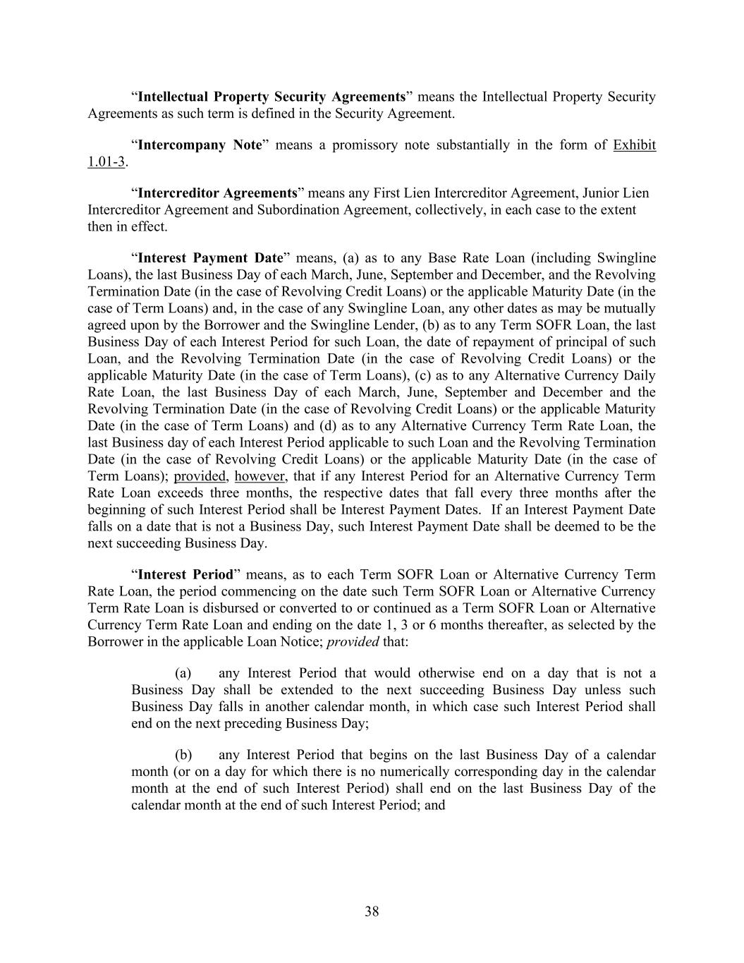 38 “Intellectual Property Security Agreements” means the Intellectual Property Security Agreements as such term is defined in the Security Agreement. “Intercompany Note” means a promissory note substantially in the form of Exhibit 1.01-3. “Intercreditor Agreements” means any First Lien Intercreditor Agreement, Junior Lien Intercreditor Agreement and Subordination Agreement, collectively, in each case to the extent then in effect. “Interest Payment Date” means, (a) as to any Base Rate Loan (including Swingline Loans), the last Business Day of each March, June, September and December, and the Revolving Termination Date (in the case of Revolving Credit Loans) or the applicable Maturity Date (in the case of Term Loans) and, in the case of any Swingline Loan, any other dates as may be mutually agreed upon by the Borrower and the Swingline Lender, (b) as to any Term SOFR Loan, the last Business Day of each Interest Period for such Loan, the date of repayment of principal of such Loan, and the Revolving Termination Date (in the case of Revolving Credit Loans) or the applicable Maturity Date (in the case of Term Loans), (c) as to any Alternative Currency Daily Rate Loan, the last Business Day of each March, June, September and December and the Revolving Termination Date (in the case of Revolving Credit Loans) or the applicable Maturity Date (in the case of Term Loans) and (d) as to any Alternative Currency Term Rate Loan, the last Business day of each Interest Period applicable to such Loan and the Revolving Termination Date (in the case of Revolving Credit Loans) or the applicable Maturity Date (in the case of Term Loans); provided, however, that if any Interest Period for an Alternative Currency Term Rate Loan exceeds three months, the respective dates that fall every three months after the beginning of such Interest Period shall be Interest Payment Dates. If an Interest Payment Date falls on a date that is not a Business Day, such Interest Payment Date shall be deemed to be the next succeeding Business Day. “Interest Period” means, as to each Term SOFR Loan or Alternative Currency Term Rate Loan, the period commencing on the date such Term SOFR Loan or Alternative Currency Term Rate Loan is disbursed or converted to or continued as a Term SOFR Loan or Alternative Currency Term Rate Loan and ending on the date 1, 3 or 6 months thereafter, as selected by the Borrower in the applicable Loan Notice; provided that: (a) any Interest Period that would otherwise end on a day that is not a Business Day shall be extended to the next succeeding Business Day unless such Business Day falls in another calendar month, in which case such Interest Period shall end on the next preceding Business Day; (b) any Interest Period that begins on the last Business Day of a calendar month (or on a day for which there is no numerically corresponding day in the calendar month at the end of such Interest Period) shall end on the last Business Day of the calendar month at the end of such Interest Period; and