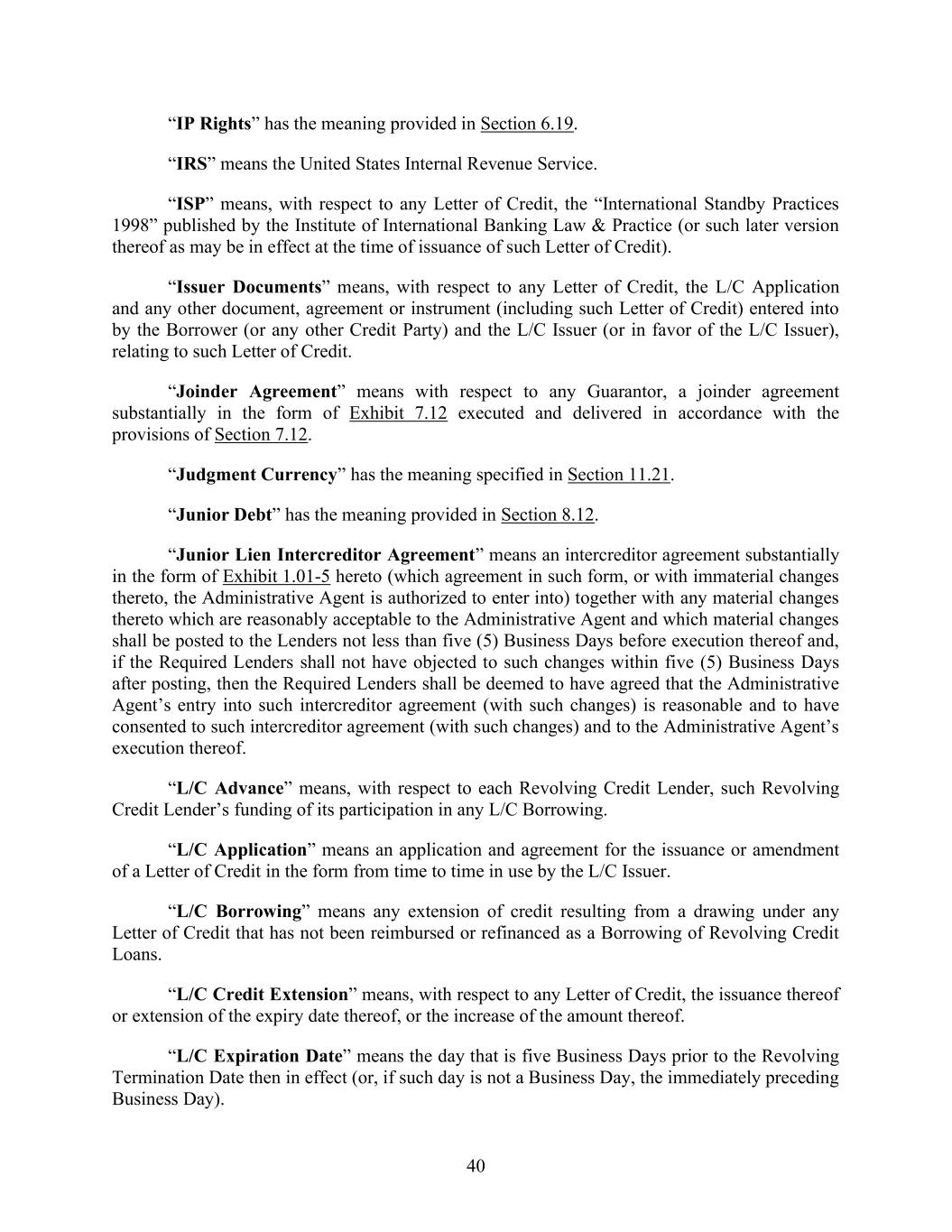 40 “IP Rights” has the meaning provided in Section 6.19. “IRS” means the United States Internal Revenue Service. “ISP” means, with respect to any Letter of Credit, the “International Standby Practices 1998” published by the Institute of International Banking Law & Practice (or such later version thereof as may be in effect at the time of issuance of such Letter of Credit). “Issuer Documents” means, with respect to any Letter of Credit, the L/C Application and any other document, agreement or instrument (including such Letter of Credit) entered into by the Borrower (or any other Credit Party) and the L/C Issuer (or in favor of the L/C Issuer), relating to such Letter of Credit. “Joinder Agreement” means with respect to any Guarantor, a joinder agreement substantially in the form of Exhibit 7.12 executed and delivered in accordance with the provisions of Section 7.12. “Judgment Currency” has the meaning specified in Section 11.21. “Junior Debt” has the meaning provided in Section 8.12. “Junior Lien Intercreditor Agreement” means an intercreditor agreement substantially in the form of Exhibit 1.01-5 hereto (which agreement in such form, or with immaterial changes thereto, the Administrative Agent is authorized to enter into) together with any material changes thereto which are reasonably acceptable to the Administrative Agent and which material changes shall be posted to the Lenders not less than five (5) Business Days before execution thereof and, if the Required Lenders shall not have objected to such changes within five (5) Business Days after posting, then the Required Lenders shall be deemed to have agreed that the Administrative Agent’s entry into such intercreditor agreement (with such changes) is reasonable and to have consented to such intercreditor agreement (with such changes) and to the Administrative Agent’s execution thereof. “L/C Advance” means, with respect to each Revolving Credit Lender, such Revolving Credit Lender’s funding of its participation in any L/C Borrowing. “L/C Application” means an application and agreement for the issuance or amendment of a Letter of Credit in the form from time to time in use by the L/C Issuer. “L/C Borrowing” means any extension of credit resulting from a drawing under any Letter of Credit that has not been reimbursed or refinanced as a Borrowing of Revolving Credit Loans. “L/C Credit Extension” means, with respect to any Letter of Credit, the issuance thereof or extension of the expiry date thereof, or the increase of the amount thereof. “L/C Expiration Date” means the day that is five Business Days prior to the Revolving Termination Date then in effect (or, if such day is not a Business Day, the immediately preceding Business Day).
