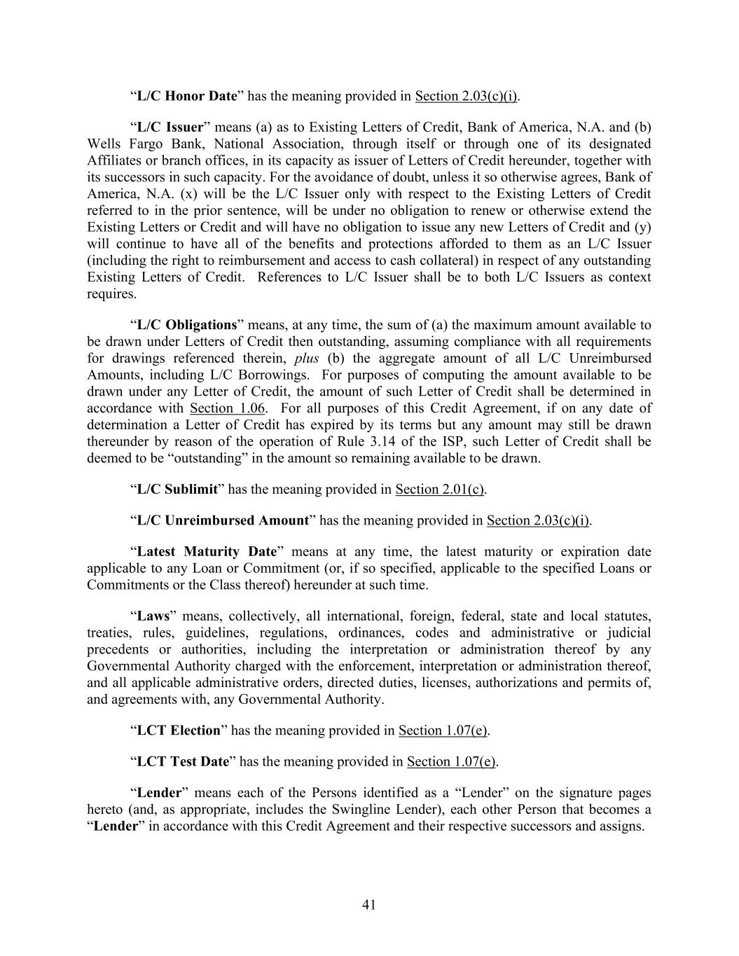 41 “L/C Honor Date” has the meaning provided in Section 2.03(c)(i). “L/C Issuer” means (a) as to Existing Letters of Credit, Bank of America, N.A. and (b) Wells Fargo Bank, National Association, through itself or through one of its designated Affiliates or branch offices, in its capacity as issuer of Letters of Credit hereunder, together with its successors in such capacity. For the avoidance of doubt, unless it so otherwise agrees, Bank of America, N.A. (x) will be the L/C Issuer only with respect to the Existing Letters of Credit referred to in the prior sentence, will be under no obligation to renew or otherwise extend the Existing Letters or Credit and will have no obligation to issue any new Letters of Credit and (y) will continue to have all of the benefits and protections afforded to them as an L/C Issuer (including the right to reimbursement and access to cash collateral) in respect of any outstanding Existing Letters of Credit. References to L/C Issuer shall be to both L/C Issuers as context requires. “L/C Obligations” means, at any time, the sum of (a) the maximum amount available to be drawn under Letters of Credit then outstanding, assuming compliance with all requirements for drawings referenced therein, plus (b) the aggregate amount of all L/C Unreimbursed Amounts, including L/C Borrowings. For purposes of computing the amount available to be drawn under any Letter of Credit, the amount of such Letter of Credit shall be determined in accordance with Section 1.06. For all purposes of this Credit Agreement, if on any date of determination a Letter of Credit has expired by its terms but any amount may still be drawn thereunder by reason of the operation of Rule 3.14 of the ISP, such Letter of Credit shall be deemed to be “outstanding” in the amount so remaining available to be drawn. “L/C Sublimit” has the meaning provided in Section 2.01(c). “L/C Unreimbursed Amount” has the meaning provided in Section 2.03(c)(i). “Latest Maturity Date” means at any time, the latest maturity or expiration date applicable to any Loan or Commitment (or, if so specified, applicable to the specified Loans or Commitments or the Class thereof) hereunder at such time. “Laws” means, collectively, all international, foreign, federal, state and local statutes, treaties, rules, guidelines, regulations, ordinances, codes and administrative or judicial precedents or authorities, including the interpretation or administration thereof by any Governmental Authority charged with the enforcement, interpretation or administration thereof, and all applicable administrative orders, directed duties, licenses, authorizations and permits of, and agreements with, any Governmental Authority. “LCT Election” has the meaning provided in Section 1.07(e). “LCT Test Date” has the meaning provided in Section 1.07(e). “Lender” means each of the Persons identified as a “Lender” on the signature pages hereto (and, as appropriate, includes the Swingline Lender), each other Person that becomes a “Lender” in accordance with this Credit Agreement and their respective successors and assigns.