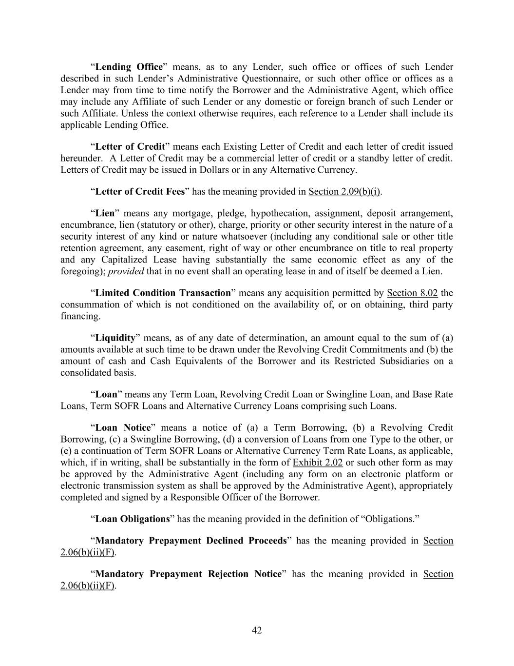 42 “Lending Office” means, as to any Lender, such office or offices of such Lender described in such Lender’s Administrative Questionnaire, or such other office or offices as a Lender may from time to time notify the Borrower and the Administrative Agent, which office may include any Affiliate of such Lender or any domestic or foreign branch of such Lender or such Affiliate. Unless the context otherwise requires, each reference to a Lender shall include its applicable Lending Office. “Letter of Credit” means each Existing Letter of Credit and each letter of credit issued hereunder. A Letter of Credit may be a commercial letter of credit or a standby letter of credit. Letters of Credit may be issued in Dollars or in any Alternative Currency. “Letter of Credit Fees” has the meaning provided in Section 2.09(b)(i). “Lien” means any mortgage, pledge, hypothecation, assignment, deposit arrangement, encumbrance, lien (statutory or other), charge, priority or other security interest in the nature of a security interest of any kind or nature whatsoever (including any conditional sale or other title retention agreement, any easement, right of way or other encumbrance on title to real property and any Capitalized Lease having substantially the same economic effect as any of the foregoing); provided that in no event shall an operating lease in and of itself be deemed a Lien. “Limited Condition Transaction” means any acquisition permitted by Section 8.02 the consummation of which is not conditioned on the availability of, or on obtaining, third party financing. “Liquidity” means, as of any date of determination, an amount equal to the sum of (a) amounts available at such time to be drawn under the Revolving Credit Commitments and (b) the amount of cash and Cash Equivalents of the Borrower and its Restricted Subsidiaries on a consolidated basis. “Loan” means any Term Loan, Revolving Credit Loan or Swingline Loan, and Base Rate Loans, Term SOFR Loans and Alternative Currency Loans comprising such Loans. “Loan Notice” means a notice of (a) a Term Borrowing, (b) a Revolving Credit Borrowing, (c) a Swingline Borrowing, (d) a conversion of Loans from one Type to the other, or (e) a continuation of Term SOFR Loans or Alternative Currency Term Rate Loans, as applicable, which, if in writing, shall be substantially in the form of Exhibit 2.02 or such other form as may be approved by the Administrative Agent (including any form on an electronic platform or electronic transmission system as shall be approved by the Administrative Agent), appropriately completed and signed by a Responsible Officer of the Borrower. “Loan Obligations” has the meaning provided in the definition of “Obligations.” “Mandatory Prepayment Declined Proceeds” has the meaning provided in Section 2.06(b)(ii)(F). “Mandatory Prepayment Rejection Notice” has the meaning provided in Section 2.06(b)(ii)(F).