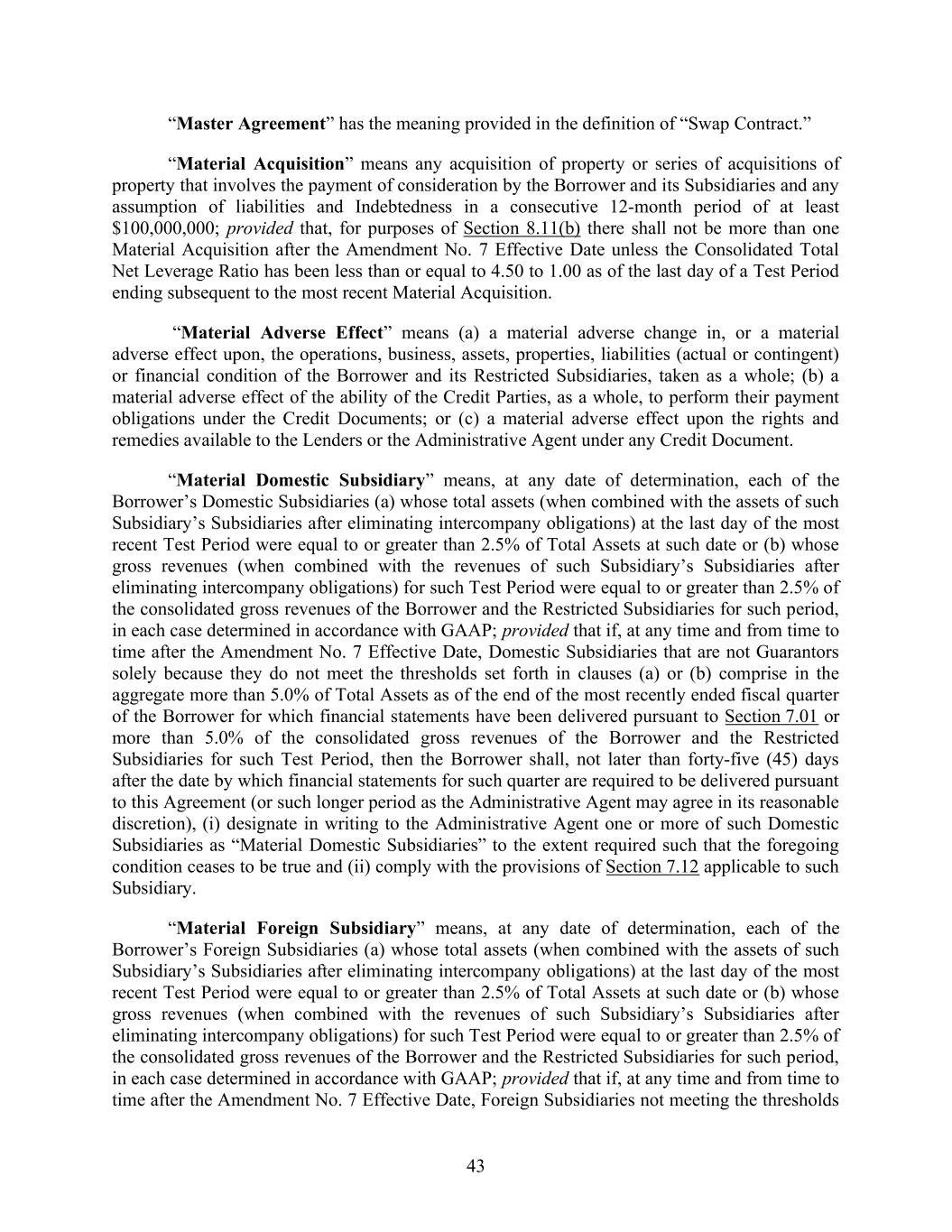43 “Master Agreement” has the meaning provided in the definition of “Swap Contract.” “Material Acquisition” means any acquisition of property or series of acquisitions of property that involves the payment of consideration by the Borrower and its Subsidiaries and any assumption of liabilities and Indebtedness in a consecutive 12-month period of at least $100,000,000; provided that, for purposes of Section 8.11(b) there shall not be more than one Material Acquisition after the Amendment No. 7 Effective Date unless the Consolidated Total Net Leverage Ratio has been less than or equal to 4.50 to 1.00 as of the last day of a Test Period ending subsequent to the most recent Material Acquisition. “Material Adverse Effect” means (a) a material adverse change in, or a material adverse effect upon, the operations, business, assets, properties, liabilities (actual or contingent) or financial condition of the Borrower and its Restricted Subsidiaries, taken as a whole; (b) a material adverse effect of the ability of the Credit Parties, as a whole, to perform their payment obligations under the Credit Documents; or (c) a material adverse effect upon the rights and remedies available to the Lenders or the Administrative Agent under any Credit Document. “Material Domestic Subsidiary” means, at any date of determination, each of the Borrower’s Domestic Subsidiaries (a) whose total assets (when combined with the assets of such Subsidiary’s Subsidiaries after eliminating intercompany obligations) at the last day of the most recent Test Period were equal to or greater than 2.5% of Total Assets at such date or (b) whose gross revenues (when combined with the revenues of such Subsidiary’s Subsidiaries after eliminating intercompany obligations) for such Test Period were equal to or greater than 2.5% of the consolidated gross revenues of the Borrower and the Restricted Subsidiaries for such period, in each case determined in accordance with GAAP; provided that if, at any time and from time to time after the Amendment No. 7 Effective Date, Domestic Subsidiaries that are not Guarantors solely because they do not meet the thresholds set forth in clauses (a) or (b) comprise in the aggregate more than 5.0% of Total Assets as of the end of the most recently ended fiscal quarter of the Borrower for which financial statements have been delivered pursuant to Section 7.01 or more than 5.0% of the consolidated gross revenues of the Borrower and the Restricted Subsidiaries for such Test Period, then the Borrower shall, not later than forty-five (45) days after the date by which financial statements for such quarter are required to be delivered pursuant to this Agreement (or such longer period as the Administrative Agent may agree in its reasonable discretion), (i) designate in writing to the Administrative Agent one or more of such Domestic Subsidiaries as “Material Domestic Subsidiaries” to the extent required such that the foregoing condition ceases to be true and (ii) comply with the provisions of Section 7.12 applicable to such Subsidiary. “Material Foreign Subsidiary” means, at any date of determination, each of the Borrower’s Foreign Subsidiaries (a) whose total assets (when combined with the assets of such Subsidiary’s Subsidiaries after eliminating intercompany obligations) at the last day of the most recent Test Period were equal to or greater than 2.5% of Total Assets at such date or (b) whose gross revenues (when combined with the revenues of such Subsidiary’s Subsidiaries after eliminating intercompany obligations) for such Test Period were equal to or greater than 2.5% of the consolidated gross revenues of the Borrower and the Restricted Subsidiaries for such period, in each case determined in accordance with GAAP; provided that if, at any time and from time to time after the Amendment No. 7 Effective Date, Foreign Subsidiaries not meeting the thresholds