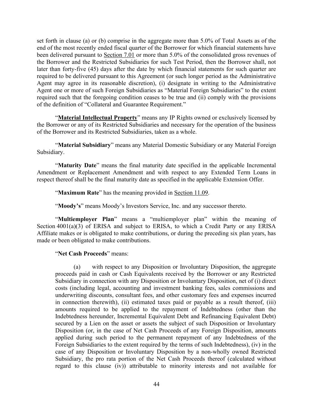 44 set forth in clause (a) or (b) comprise in the aggregate more than 5.0% of Total Assets as of the end of the most recently ended fiscal quarter of the Borrower for which financial statements have been delivered pursuant to Section 7.01 or more than 5.0% of the consolidated gross revenues of the Borrower and the Restricted Subsidiaries for such Test Period, then the Borrower shall, not later than forty-five (45) days after the date by which financial statements for such quarter are required to be delivered pursuant to this Agreement (or such longer period as the Administrative Agent may agree in its reasonable discretion), (i) designate in writing to the Administrative Agent one or more of such Foreign Subsidiaries as “Material Foreign Subsidiaries” to the extent required such that the foregoing condition ceases to be true and (ii) comply with the provisions of the definition of “Collateral and Guarantee Requirement.” “Material Intellectual Property” means any IP Rights owned or exclusively licensed by the Borrower or any of its Restricted Subsidiaries and necessary for the operation of the business of the Borrower and its Restricted Subsidiaries, taken as a whole. “Material Subsidiary” means any Material Domestic Subsidiary or any Material Foreign Subsidiary. “Maturity Date” means the final maturity date specified in the applicable Incremental Amendment or Replacement Amendment and with respect to any Extended Term Loans in respect thereof shall be the final maturity date as specified in the applicable Extension Offer. “Maximum Rate” has the meaning provided in Section 11.09. “Moody’s” means Moody’s Investors Service, Inc. and any successor thereto. “Multiemployer Plan” means a “multiemployer plan” within the meaning of Section 4001(a)(3) of ERISA and subject to ERISA, to which a Credit Party or any ERISA Affiliate makes or is obligated to make contributions, or during the preceding six plan years, has made or been obligated to make contributions. “Net Cash Proceeds” means: (a) with respect to any Disposition or Involuntary Disposition, the aggregate proceeds paid in cash or Cash Equivalents received by the Borrower or any Restricted Subsidiary in connection with any Disposition or Involuntary Disposition, net of (i) direct costs (including legal, accounting and investment banking fees, sales commissions and underwriting discounts, consultant fees, and other customary fees and expenses incurred in connection therewith), (ii) estimated taxes paid or payable as a result thereof, (iii) amounts required to be applied to the repayment of Indebtedness (other than the Indebtedness hereunder, Incremental Equivalent Debt and Refinancing Equivalent Debt) secured by a Lien on the asset or assets the subject of such Disposition or Involuntary Disposition (or, in the case of Net Cash Proceeds of any Foreign Disposition, amounts applied during such period to the permanent repayment of any Indebtedness of the Foreign Subsidiaries to the extent required by the terms of such Indebtedness), (iv) in the case of any Disposition or Involuntary Disposition by a non-wholly owned Restricted Subsidiary, the pro rata portion of the Net Cash Proceeds thereof (calculated without regard to this clause (iv)) attributable to minority interests and not available for