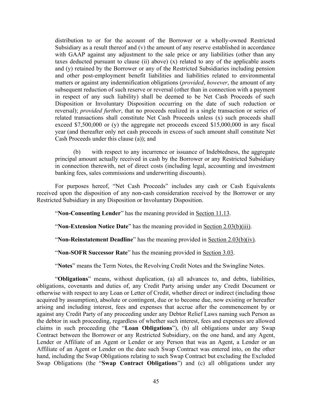 45 distribution to or for the account of the Borrower or a wholly-owned Restricted Subsidiary as a result thereof and (v) the amount of any reserve established in accordance with GAAP against any adjustment to the sale price or any liabilities (other than any taxes deducted pursuant to clause (ii) above) (x) related to any of the applicable assets and (y) retained by the Borrower or any of the Restricted Subsidiaries including pension and other post-employment benefit liabilities and liabilities related to environmental matters or against any indemnification obligations (provided, however, the amount of any subsequent reduction of such reserve or reversal (other than in connection with a payment in respect of any such liability) shall be deemed to be Net Cash Proceeds of such Disposition or Involuntary Disposition occurring on the date of such reduction or reversal); provided further, that no proceeds realized in a single transaction or series of related transactions shall constitute Net Cash Proceeds unless (x) such proceeds shall exceed $7,500,000 or (y) the aggregate net proceeds exceed $15,000,000 in any fiscal year (and thereafter only net cash proceeds in excess of such amount shall constitute Net Cash Proceeds under this clause (a)); and (b) with respect to any incurrence or issuance of Indebtedness, the aggregate principal amount actually received in cash by the Borrower or any Restricted Subsidiary in connection therewith, net of direct costs (including legal, accounting and investment banking fees, sales commissions and underwriting discounts). For purposes hereof, “Net Cash Proceeds” includes any cash or Cash Equivalents received upon the disposition of any non-cash consideration received by the Borrower or any Restricted Subsidiary in any Disposition or Involuntary Disposition. “Non-Consenting Lender” has the meaning provided in Section 11.13. “Non-Extension Notice Date” has the meaning provided in Section 2.03(b)(iii). “Non-Reinstatement Deadline” has the meaning provided in Section 2.03(b)(iv). “Non-SOFR Successor Rate” has the meaning provided in Section 3.03. “Notes” means the Term Notes, the Revolving Credit Notes and the Swingline Notes. “Obligations” means, without duplication, (a) all advances to, and debts, liabilities, obligations, covenants and duties of, any Credit Party arising under any Credit Document or otherwise with respect to any Loan or Letter of Credit, whether direct or indirect (including those acquired by assumption), absolute or contingent, due or to become due, now existing or hereafter arising and including interest, fees and expenses that accrue after the commencement by or against any Credit Party of any proceeding under any Debtor Relief Laws naming such Person as the debtor in such proceeding, regardless of whether such interest, fees and expenses are allowed claims in such proceeding (the “Loan Obligations”), (b) all obligations under any Swap Contract between the Borrower or any Restricted Subsidiary, on the one hand, and any Agent, Lender or Affiliate of an Agent or Lender or any Person that was an Agent, a Lender or an Affiliate of an Agent or Lender on the date such Swap Contract was entered into, on the other hand, including the Swap Obligations relating to such Swap Contract but excluding the Excluded Swap Obligations (the “Swap Contract Obligations”) and (c) all obligations under any