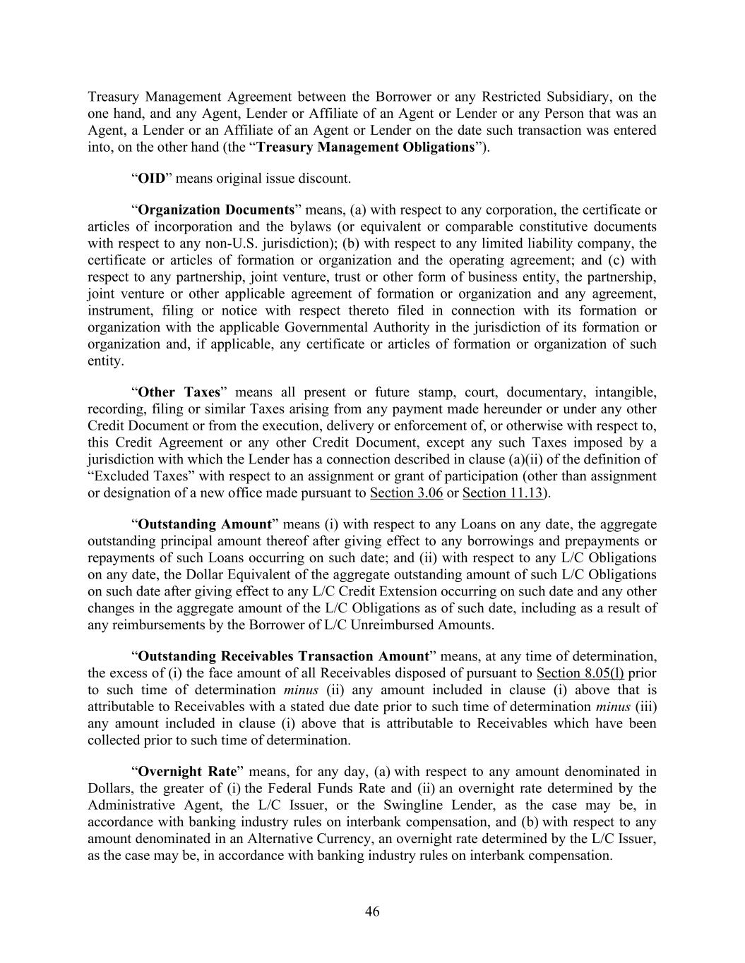 46 Treasury Management Agreement between the Borrower or any Restricted Subsidiary, on the one hand, and any Agent, Lender or Affiliate of an Agent or Lender or any Person that was an Agent, a Lender or an Affiliate of an Agent or Lender on the date such transaction was entered into, on the other hand (the “Treasury Management Obligations”). “OID” means original issue discount. “Organization Documents” means, (a) with respect to any corporation, the certificate or articles of incorporation and the bylaws (or equivalent or comparable constitutive documents with respect to any non-U.S. jurisdiction); (b) with respect to any limited liability company, the certificate or articles of formation or organization and the operating agreement; and (c) with respect to any partnership, joint venture, trust or other form of business entity, the partnership, joint venture or other applicable agreement of formation or organization and any agreement, instrument, filing or notice with respect thereto filed in connection with its formation or organization with the applicable Governmental Authority in the jurisdiction of its formation or organization and, if applicable, any certificate or articles of formation or organization of such entity. “Other Taxes” means all present or future stamp, court, documentary, intangible, recording, filing or similar Taxes arising from any payment made hereunder or under any other Credit Document or from the execution, delivery or enforcement of, or otherwise with respect to, this Credit Agreement or any other Credit Document, except any such Taxes imposed by a jurisdiction with which the Lender has a connection described in clause (a)(ii) of the definition of “Excluded Taxes” with respect to an assignment or grant of participation (other than assignment or designation of a new office made pursuant to Section 3.06 or Section 11.13). “Outstanding Amount” means (i) with respect to any Loans on any date, the aggregate outstanding principal amount thereof after giving effect to any borrowings and prepayments or repayments of such Loans occurring on such date; and (ii) with respect to any L/C Obligations on any date, the Dollar Equivalent of the aggregate outstanding amount of such L/C Obligations on such date after giving effect to any L/C Credit Extension occurring on such date and any other changes in the aggregate amount of the L/C Obligations as of such date, including as a result of any reimbursements by the Borrower of L/C Unreimbursed Amounts. “Outstanding Receivables Transaction Amount” means, at any time of determination, the excess of (i) the face amount of all Receivables disposed of pursuant to Section 8.05(l) prior to such time of determination minus (ii) any amount included in clause (i) above that is attributable to Receivables with a stated due date prior to such time of determination minus (iii) any amount included in clause (i) above that is attributable to Receivables which have been collected prior to such time of determination. “Overnight Rate” means, for any day, (a) with respect to any amount denominated in Dollars, the greater of (i) the Federal Funds Rate and (ii) an overnight rate determined by the Administrative Agent, the L/C Issuer, or the Swingline Lender, as the case may be, in accordance with banking industry rules on interbank compensation, and (b) with respect to any amount denominated in an Alternative Currency, an overnight rate determined by the L/C Issuer, as the case may be, in accordance with banking industry rules on interbank compensation.
