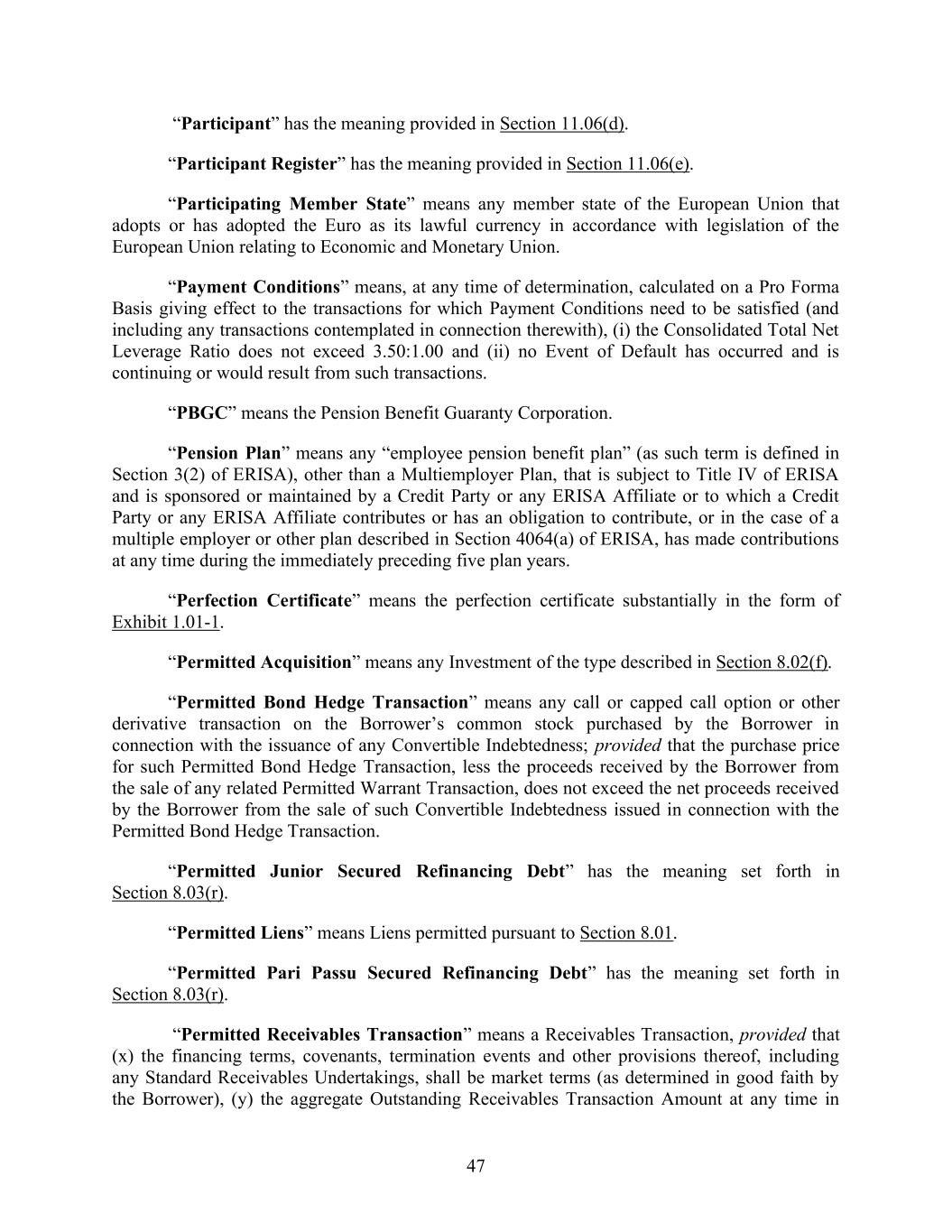 47 “Participant” has the meaning provided in Section 11.06(d). “Participant Register” has the meaning provided in Section 11.06(e). “Participating Member State” means any member state of the European Union that adopts or has adopted the Euro as its lawful currency in accordance with legislation of the European Union relating to Economic and Monetary Union. “Payment Conditions” means, at any time of determination, calculated on a Pro Forma Basis giving effect to the transactions for which Payment Conditions need to be satisfied (and including any transactions contemplated in connection therewith), (i) the Consolidated Total Net Leverage Ratio does not exceed 3.50:1.00 and (ii) no Event of Default has occurred and is continuing or would result from such transactions. “PBGC” means the Pension Benefit Guaranty Corporation. “Pension Plan” means any “employee pension benefit plan” (as such term is defined in Section 3(2) of ERISA), other than a Multiemployer Plan, that is subject to Title IV of ERISA and is sponsored or maintained by a Credit Party or any ERISA Affiliate or to which a Credit Party or any ERISA Affiliate contributes or has an obligation to contribute, or in the case of a multiple employer or other plan described in Section 4064(a) of ERISA, has made contributions at any time during the immediately preceding five plan years. “Perfection Certificate” means the perfection certificate substantially in the form of Exhibit 1.01-1. “Permitted Acquisition” means any Investment of the type described in Section 8.02(f). “Permitted Bond Hedge Transaction” means any call or capped call option or other derivative transaction on the Borrower’s common stock purchased by the Borrower in connection with the issuance of any Convertible Indebtedness; provided that the purchase price for such Permitted Bond Hedge Transaction, less the proceeds received by the Borrower from the sale of any related Permitted Warrant Transaction, does not exceed the net proceeds received by the Borrower from the sale of such Convertible Indebtedness issued in connection with the Permitted Bond Hedge Transaction. “Permitted Junior Secured Refinancing Debt” has the meaning set forth in Section 8.03(r). “Permitted Liens” means Liens permitted pursuant to Section 8.01. “Permitted Pari Passu Secured Refinancing Debt” has the meaning set forth in Section 8.03(r). “Permitted Receivables Transaction” means a Receivables Transaction, provided that (x) the financing terms, covenants, termination events and other provisions thereof, including any Standard Receivables Undertakings, shall be market terms (as determined in good faith by the Borrower), (y) the aggregate Outstanding Receivables Transaction Amount at any time in