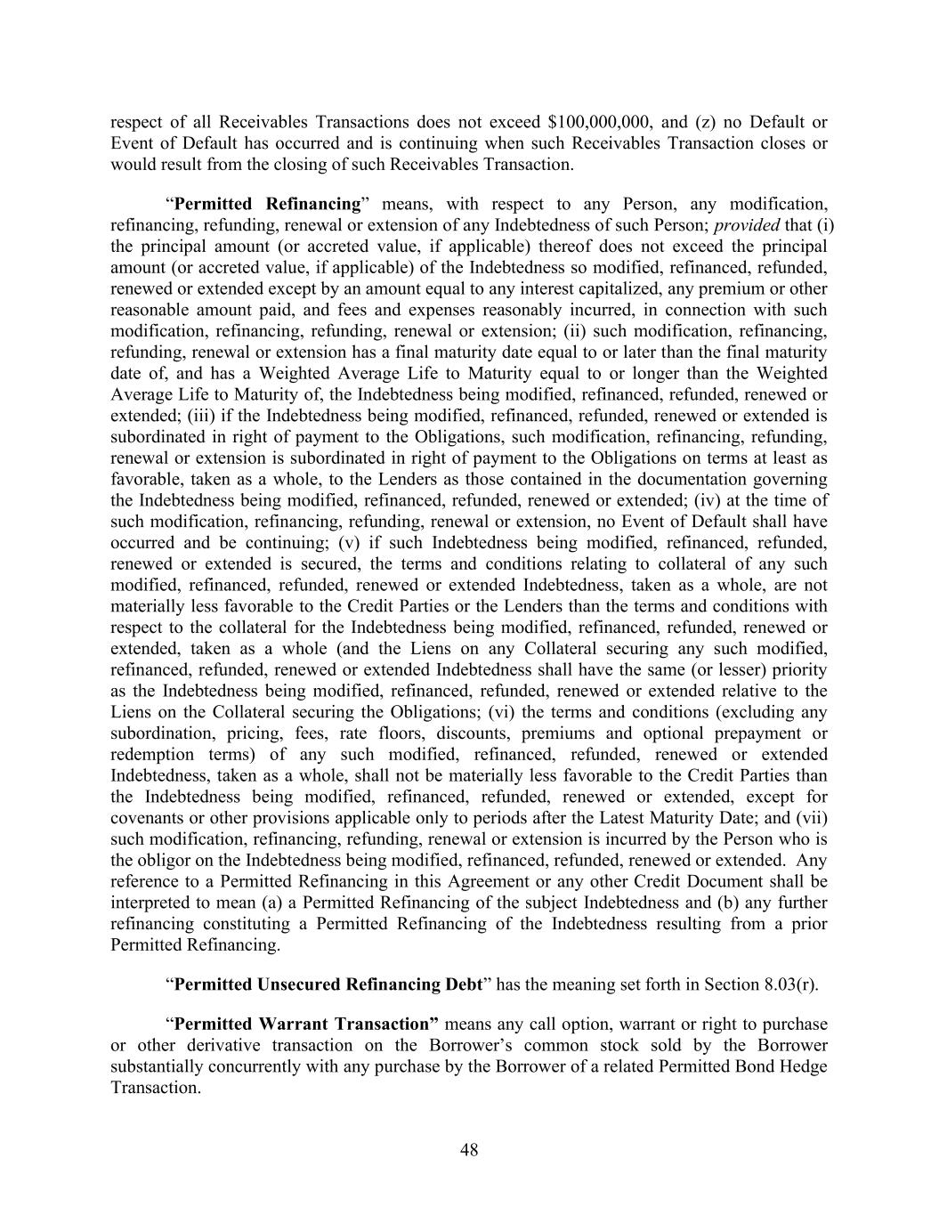 48 respect of all Receivables Transactions does not exceed $100,000,000, and (z) no Default or Event of Default has occurred and is continuing when such Receivables Transaction closes or would result from the closing of such Receivables Transaction. “Permitted Refinancing” means, with respect to any Person, any modification, refinancing, refunding, renewal or extension of any Indebtedness of such Person; provided that (i) the principal amount (or accreted value, if applicable) thereof does not exceed the principal amount (or accreted value, if applicable) of the Indebtedness so modified, refinanced, refunded, renewed or extended except by an amount equal to any interest capitalized, any premium or other reasonable amount paid, and fees and expenses reasonably incurred, in connection with such modification, refinancing, refunding, renewal or extension; (ii) such modification, refinancing, refunding, renewal or extension has a final maturity date equal to or later than the final maturity date of, and has a Weighted Average Life to Maturity equal to or longer than the Weighted Average Life to Maturity of, the Indebtedness being modified, refinanced, refunded, renewed or extended; (iii) if the Indebtedness being modified, refinanced, refunded, renewed or extended is subordinated in right of payment to the Obligations, such modification, refinancing, refunding, renewal or extension is subordinated in right of payment to the Obligations on terms at least as favorable, taken as a whole, to the Lenders as those contained in the documentation governing the Indebtedness being modified, refinanced, refunded, renewed or extended; (iv) at the time of such modification, refinancing, refunding, renewal or extension, no Event of Default shall have occurred and be continuing; (v) if such Indebtedness being modified, refinanced, refunded, renewed or extended is secured, the terms and conditions relating to collateral of any such modified, refinanced, refunded, renewed or extended Indebtedness, taken as a whole, are not materially less favorable to the Credit Parties or the Lenders than the terms and conditions with respect to the collateral for the Indebtedness being modified, refinanced, refunded, renewed or extended, taken as a whole (and the Liens on any Collateral securing any such modified, refinanced, refunded, renewed or extended Indebtedness shall have the same (or lesser) priority as the Indebtedness being modified, refinanced, refunded, renewed or extended relative to the Liens on the Collateral securing the Obligations; (vi) the terms and conditions (excluding any subordination, pricing, fees, rate floors, discounts, premiums and optional prepayment or redemption terms) of any such modified, refinanced, refunded, renewed or extended Indebtedness, taken as a whole, shall not be materially less favorable to the Credit Parties than the Indebtedness being modified, refinanced, refunded, renewed or extended, except for covenants or other provisions applicable only to periods after the Latest Maturity Date; and (vii) such modification, refinancing, refunding, renewal or extension is incurred by the Person who is the obligor on the Indebtedness being modified, refinanced, refunded, renewed or extended. Any reference to a Permitted Refinancing in this Agreement or any other Credit Document shall be interpreted to mean (a) a Permitted Refinancing of the subject Indebtedness and (b) any further refinancing constituting a Permitted Refinancing of the Indebtedness resulting from a prior Permitted Refinancing. “Permitted Unsecured Refinancing Debt” has the meaning set forth in Section 8.03(r). “Permitted Warrant Transaction” means any call option, warrant or right to purchase or other derivative transaction on the Borrower’s common stock sold by the Borrower substantially concurrently with any purchase by the Borrower of a related Permitted Bond Hedge Transaction.