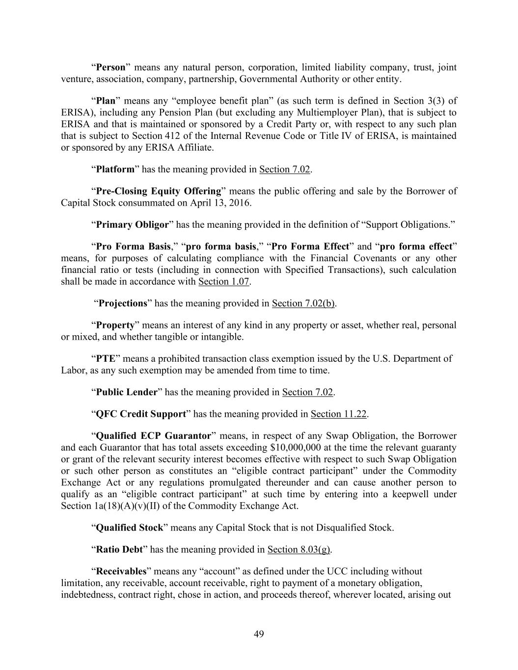 49 “Person” means any natural person, corporation, limited liability company, trust, joint venture, association, company, partnership, Governmental Authority or other entity. “Plan” means any “employee benefit plan” (as such term is defined in Section 3(3) of ERISA), including any Pension Plan (but excluding any Multiemployer Plan), that is subject to ERISA and that is maintained or sponsored by a Credit Party or, with respect to any such plan that is subject to Section 412 of the Internal Revenue Code or Title IV of ERISA, is maintained or sponsored by any ERISA Affiliate. “Platform” has the meaning provided in Section 7.02. “Pre-Closing Equity Offering” means the public offering and sale by the Borrower of Capital Stock consummated on April 13, 2016. “Primary Obligor” has the meaning provided in the definition of “Support Obligations.” “Pro Forma Basis,” “pro forma basis,” “Pro Forma Effect” and “pro forma effect” means, for purposes of calculating compliance with the Financial Covenants or any other financial ratio or tests (including in connection with Specified Transactions), such calculation shall be made in accordance with Section 1.07. “Projections” has the meaning provided in Section 7.02(b). “Property” means an interest of any kind in any property or asset, whether real, personal or mixed, and whether tangible or intangible. “PTE” means a prohibited transaction class exemption issued by the U.S. Department of Labor, as any such exemption may be amended from time to time. “Public Lender” has the meaning provided in Section 7.02. “QFC Credit Support” has the meaning provided in Section 11.22. “Qualified ECP Guarantor” means, in respect of any Swap Obligation, the Borrower and each Guarantor that has total assets exceeding $10,000,000 at the time the relevant guaranty or grant of the relevant security interest becomes effective with respect to such Swap Obligation or such other person as constitutes an “eligible contract participant” under the Commodity Exchange Act or any regulations promulgated thereunder and can cause another person to qualify as an “eligible contract participant” at such time by entering into a keepwell under Section 1a(18)(A)(v)(II) of the Commodity Exchange Act. “Qualified Stock” means any Capital Stock that is not Disqualified Stock. “Ratio Debt” has the meaning provided in Section 8.03(g). “Receivables” means any “account” as defined under the UCC including without limitation, any receivable, account receivable, right to payment of a monetary obligation, indebtedness, contract right, chose in action, and proceeds thereof, wherever located, arising out