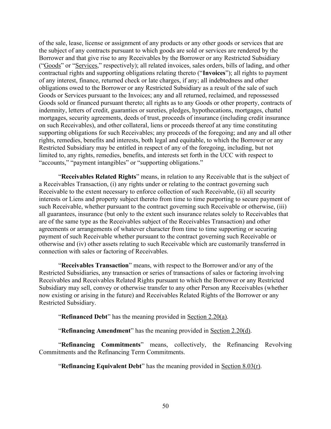 50 of the sale, lease, license or assignment of any products or any other goods or services that are the subject of any contracts pursuant to which goods are sold or services are rendered by the Borrower and that give rise to any Receivables by the Borrower or any Restricted Subsidiary (“Goods” or “Services,” respectively); all related invoices, sales orders, bills of lading, and other contractual rights and supporting obligations relating thereto (“Invoices”); all rights to payment of any interest, finance, returned check or late charges, if any; all indebtedness and other obligations owed to the Borrower or any Restricted Subsidiary as a result of the sale of such Goods or Services pursuant to the Invoices; any and all returned, reclaimed, and repossessed Goods sold or financed pursuant thereto; all rights as to any Goods or other property, contracts of indemnity, letters of credit, guaranties or sureties, pledges, hypothecations, mortgages, chattel mortgages, security agreements, deeds of trust, proceeds of insurance (including credit insurance on such Receivables), and other collateral, liens or proceeds thereof at any time constituting supporting obligations for such Receivables; any proceeds of the foregoing; and any and all other rights, remedies, benefits and interests, both legal and equitable, to which the Borrower or any Restricted Subsidiary may be entitled in respect of any of the foregoing, including, but not limited to, any rights, remedies, benefits, and interests set forth in the UCC with respect to “accounts,” “payment intangibles” or “supporting obligations.” “Receivables Related Rights” means, in relation to any Receivable that is the subject of a Receivables Transaction, (i) any rights under or relating to the contract governing such Receivable to the extent necessary to enforce collection of such Receivable, (ii) all security interests or Liens and property subject thereto from time to time purporting to secure payment of such Receivable, whether pursuant to the contract governing such Receivable or otherwise, (iii) all guarantees, insurance (but only to the extent such insurance relates solely to Receivables that are of the same type as the Receivables subject of the Receivables Transaction) and other agreements or arrangements of whatever character from time to time supporting or securing payment of such Receivable whether pursuant to the contract governing such Receivable or otherwise and (iv) other assets relating to such Receivable which are customarily transferred in connection with sales or factoring of Receivables. “Receivables Transaction” means, with respect to the Borrower and/or any of the Restricted Subsidiaries, any transaction or series of transactions of sales or factoring involving Receivables and Receivables Related Rights pursuant to which the Borrower or any Restricted Subsidiary may sell, convey or otherwise transfer to any other Person any Receivables (whether now existing or arising in the future) and Receivables Related Rights of the Borrower or any Restricted Subsidiary. “Refinanced Debt” has the meaning provided in Section 2.20(a). “Refinancing Amendment” has the meaning provided in Section 2.20(d). “Refinancing Commitments” means, collectively, the Refinancing Revolving Commitments and the Refinancing Term Commitments. “Refinancing Equivalent Debt” has the meaning provided in Section 8.03(r).