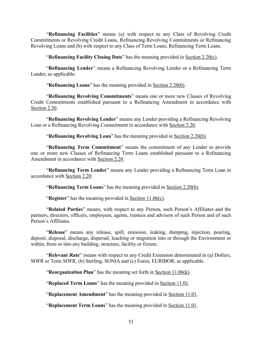 51 “Refinancing Facilities” means (a) with respect to any Class of Revolving Credit Commitments or Revolving Credit Loans, Refinancing Revolving Commitments or Refinancing Revolving Loans and (b) with respect to any Class of Term Loans, Refinancing Term Loans. “Refinancing Facility Closing Date” has the meaning provided in Section 2.20(c). “Refinancing Lender” means a Refinancing Revolving Lender or a Refinancing Term Lender, as applicable. “Refinancing Loans” has the meaning provided in Section 2.20(b). “Refinancing Revolving Commitments” means one or more new Classes of Revolving Credit Commitments established pursuant to a Refinancing Amendment in accordance with Section 2.20. “Refinancing Revolving Lender” means any Lender providing a Refinancing Revolving Loan or a Refinancing Revolving Commitment in accordance with Section 2.20. “Refinancing Revolving Loan” has the meaning provided in Section 2.20(b). “Refinancing Term Commitment” means the commitment of any Lender to provide one or more new Classes of Refinancing Term Loans established pursuant to a Refinancing Amendment in accordance with Section 2.20. “Refinancing Term Lender” means any Lender providing a Refinancing Term Loan in accordance with Section 2.20. “Refinancing Term Loans” has the meaning provided in Section 2.20(b). “Register” has the meaning provided in Section 11.06(c). “Related Parties” means, with respect to any Person, such Person’s Affiliates and the partners, directors, officers, employees, agents, trustees and advisors of such Person and of such Person’s Affiliates. “Release” means any release, spill, emission, leaking, dumping, injection, pouring, deposit, disposal, discharge, dispersal, leaching or migration into or through the Environment or within, from or into any building, structure, facility or fixture. “Relevant Rate” means with respect to any Credit Extension denominated in (a) Dollars, SOFR or Term SOFR, (b) Sterling, SONIA and (c) Euros, EURIBOR, as applicable. “Reorganization Plan” has the meaning set forth in Section 11.06(k). “Replaced Term Loans” has the meaning provided in Section 11.01. “Replacement Amendment” has the meaning provided in Section 11.01. “Replacement Term Loans” has the meaning provided in Section 11.01.