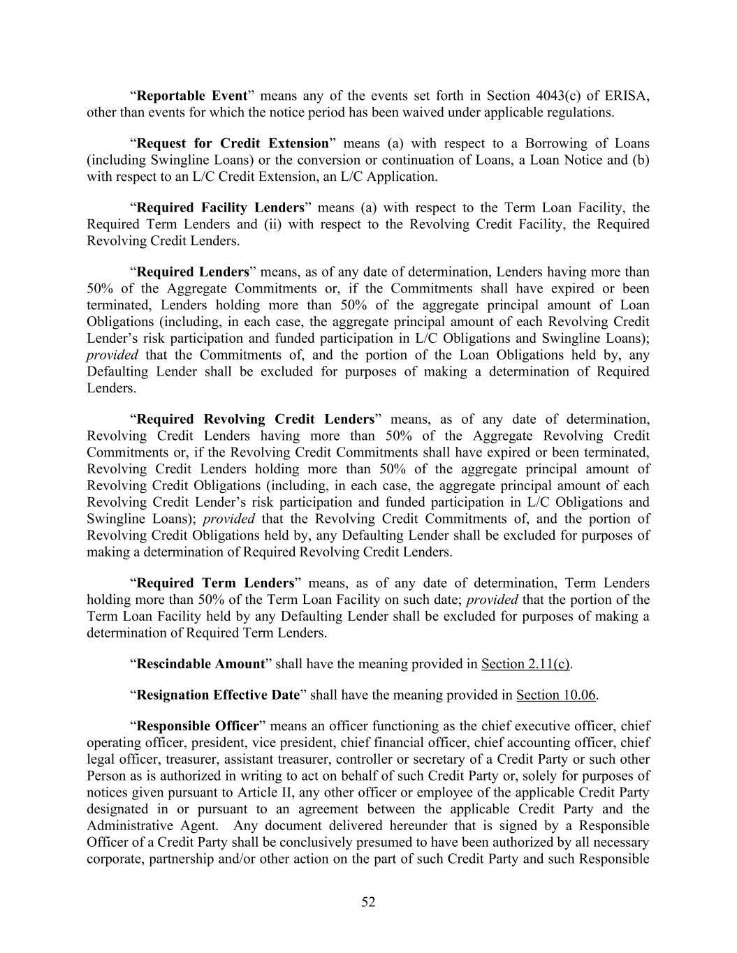 52 “Reportable Event” means any of the events set forth in Section 4043(c) of ERISA, other than events for which the notice period has been waived under applicable regulations. “Request for Credit Extension” means (a) with respect to a Borrowing of Loans (including Swingline Loans) or the conversion or continuation of Loans, a Loan Notice and (b) with respect to an L/C Credit Extension, an L/C Application. “Required Facility Lenders” means (a) with respect to the Term Loan Facility, the Required Term Lenders and (ii) with respect to the Revolving Credit Facility, the Required Revolving Credit Lenders. “Required Lenders” means, as of any date of determination, Lenders having more than 50% of the Aggregate Commitments or, if the Commitments shall have expired or been terminated, Lenders holding more than 50% of the aggregate principal amount of Loan Obligations (including, in each case, the aggregate principal amount of each Revolving Credit Lender’s risk participation and funded participation in L/C Obligations and Swingline Loans); provided that the Commitments of, and the portion of the Loan Obligations held by, any Defaulting Lender shall be excluded for purposes of making a determination of Required Lenders. “Required Revolving Credit Lenders” means, as of any date of determination, Revolving Credit Lenders having more than 50% of the Aggregate Revolving Credit Commitments or, if the Revolving Credit Commitments shall have expired or been terminated, Revolving Credit Lenders holding more than 50% of the aggregate principal amount of Revolving Credit Obligations (including, in each case, the aggregate principal amount of each Revolving Credit Lender’s risk participation and funded participation in L/C Obligations and Swingline Loans); provided that the Revolving Credit Commitments of, and the portion of Revolving Credit Obligations held by, any Defaulting Lender shall be excluded for purposes of making a determination of Required Revolving Credit Lenders. “Required Term Lenders” means, as of any date of determination, Term Lenders holding more than 50% of the Term Loan Facility on such date; provided that the portion of the Term Loan Facility held by any Defaulting Lender shall be excluded for purposes of making a determination of Required Term Lenders. “Rescindable Amount” shall have the meaning provided in Section 2.11(c). “Resignation Effective Date” shall have the meaning provided in Section 10.06. “Responsible Officer” means an officer functioning as the chief executive officer, chief operating officer, president, vice president, chief financial officer, chief accounting officer, chief legal officer, treasurer, assistant treasurer, controller or secretary of a Credit Party or such other Person as is authorized in writing to act on behalf of such Credit Party or, solely for purposes of notices given pursuant to Article II, any other officer or employee of the applicable Credit Party designated in or pursuant to an agreement between the applicable Credit Party and the Administrative Agent. Any document delivered hereunder that is signed by a Responsible Officer of a Credit Party shall be conclusively presumed to have been authorized by all necessary corporate, partnership and/or other action on the part of such Credit Party and such Responsible