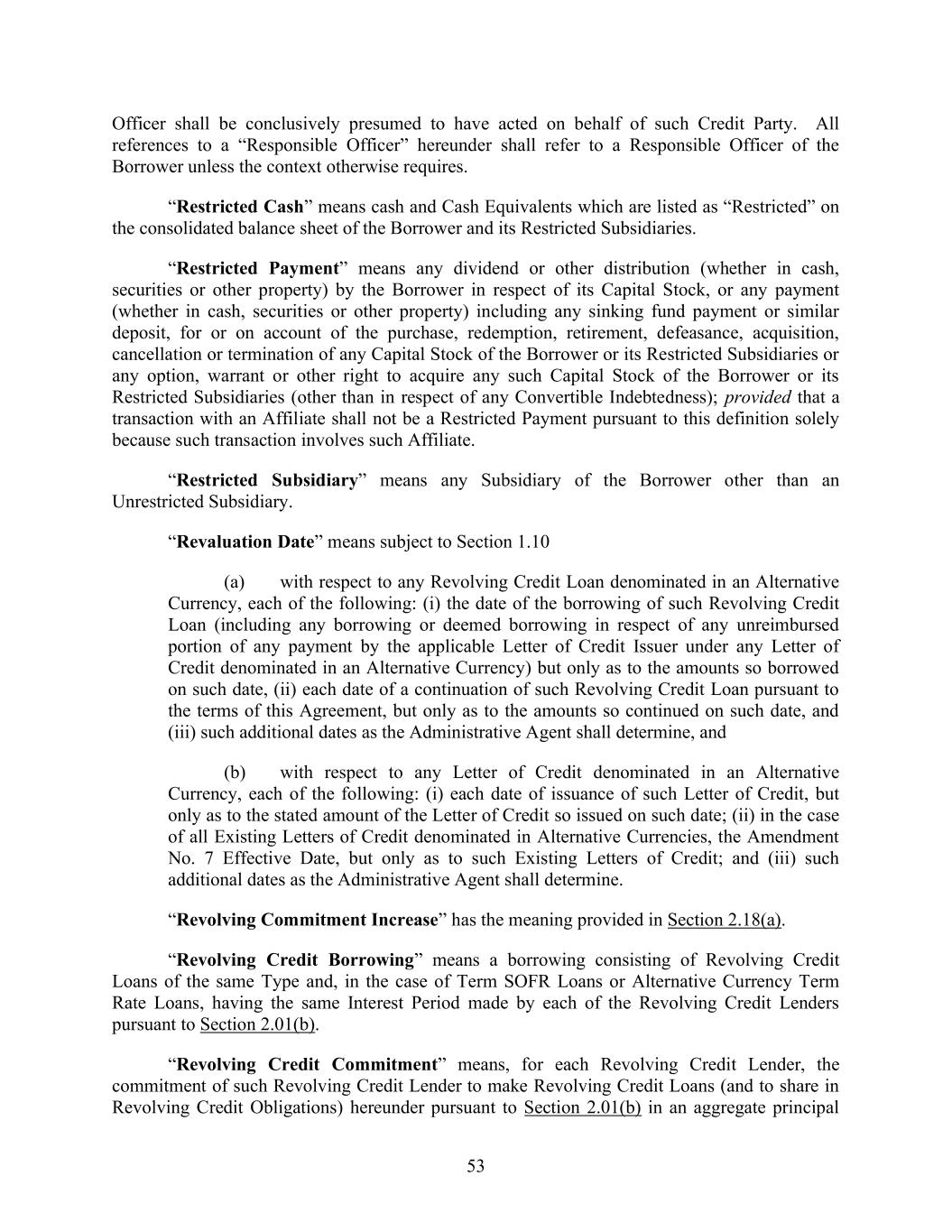 53 Officer shall be conclusively presumed to have acted on behalf of such Credit Party. All references to a “Responsible Officer” hereunder shall refer to a Responsible Officer of the Borrower unless the context otherwise requires. “Restricted Cash” means cash and Cash Equivalents which are listed as “Restricted” on the consolidated balance sheet of the Borrower and its Restricted Subsidiaries. “Restricted Payment” means any dividend or other distribution (whether in cash, securities or other property) by the Borrower in respect of its Capital Stock, or any payment (whether in cash, securities or other property) including any sinking fund payment or similar deposit, for or on account of the purchase, redemption, retirement, defeasance, acquisition, cancellation or termination of any Capital Stock of the Borrower or its Restricted Subsidiaries or any option, warrant or other right to acquire any such Capital Stock of the Borrower or its Restricted Subsidiaries (other than in respect of any Convertible Indebtedness); provided that a transaction with an Affiliate shall not be a Restricted Payment pursuant to this definition solely because such transaction involves such Affiliate. “Restricted Subsidiary” means any Subsidiary of the Borrower other than an Unrestricted Subsidiary. “Revaluation Date” means subject to Section 1.10 (a) with respect to any Revolving Credit Loan denominated in an Alternative Currency, each of the following: (i) the date of the borrowing of such Revolving Credit Loan (including any borrowing or deemed borrowing in respect of any unreimbursed portion of any payment by the applicable Letter of Credit Issuer under any Letter of Credit denominated in an Alternative Currency) but only as to the amounts so borrowed on such date, (ii) each date of a continuation of such Revolving Credit Loan pursuant to the terms of this Agreement, but only as to the amounts so continued on such date, and (iii) such additional dates as the Administrative Agent shall determine, and (b) with respect to any Letter of Credit denominated in an Alternative Currency, each of the following: (i) each date of issuance of such Letter of Credit, but only as to the stated amount of the Letter of Credit so issued on such date; (ii) in the case of all Existing Letters of Credit denominated in Alternative Currencies, the Amendment No. 7 Effective Date, but only as to such Existing Letters of Credit; and (iii) such additional dates as the Administrative Agent shall determine. “Revolving Commitment Increase” has the meaning provided in Section 2.18(a). “Revolving Credit Borrowing” means a borrowing consisting of Revolving Credit Loans of the same Type and, in the case of Term SOFR Loans or Alternative Currency Term Rate Loans, having the same Interest Period made by each of the Revolving Credit Lenders pursuant to Section 2.01(b). “Revolving Credit Commitment” means, for each Revolving Credit Lender, the commitment of such Revolving Credit Lender to make Revolving Credit Loans (and to share in Revolving Credit Obligations) hereunder pursuant to Section 2.01(b) in an aggregate principal