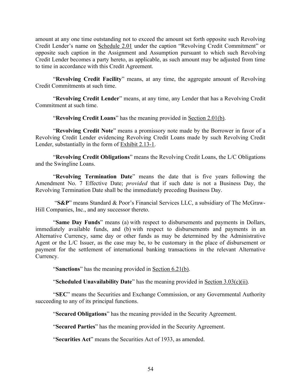 54 amount at any one time outstanding not to exceed the amount set forth opposite such Revolving Credit Lender’s name on Schedule 2.01 under the caption “Revolving Credit Commitment” or opposite such caption in the Assignment and Assumption pursuant to which such Revolving Credit Lender becomes a party hereto, as applicable, as such amount may be adjusted from time to time in accordance with this Credit Agreement. “Revolving Credit Facility” means, at any time, the aggregate amount of Revolving Credit Commitments at such time. “Revolving Credit Lender” means, at any time, any Lender that has a Revolving Credit Commitment at such time. “Revolving Credit Loans” has the meaning provided in Section 2.01(b). “Revolving Credit Note” means a promissory note made by the Borrower in favor of a Revolving Credit Lender evidencing Revolving Credit Loans made by such Revolving Credit Lender, substantially in the form of Exhibit 2.13-1. “Revolving Credit Obligations” means the Revolving Credit Loans, the L/C Obligations and the Swingline Loans. “Revolving Termination Date” means the date that is five years following the Amendment No. 7 Effective Date; provided that if such date is not a Business Day, the Revolving Termination Date shall be the immediately preceding Business Day. “S&P” means Standard & Poor’s Financial Services LLC, a subsidiary of The McGraw- Hill Companies, Inc., and any successor thereto. “Same Day Funds” means (a) with respect to disbursements and payments in Dollars, immediately available funds, and (b) with respect to disbursements and payments in an Alternative Currency, same day or other funds as may be determined by the Administrative Agent or the L/C Issuer, as the case may be, to be customary in the place of disbursement or payment for the settlement of international banking transactions in the relevant Alternative Currency. “Sanctions” has the meaning provided in Section 6.21(b). “Scheduled Unavailability Date” has the meaning provided in Section 3.03(c)(ii). “SEC” means the Securities and Exchange Commission, or any Governmental Authority succeeding to any of its principal functions. “Secured Obligations” has the meaning provided in the Security Agreement. “Secured Parties” has the meaning provided in the Security Agreement. “Securities Act” means the Securities Act of 1933, as amended.