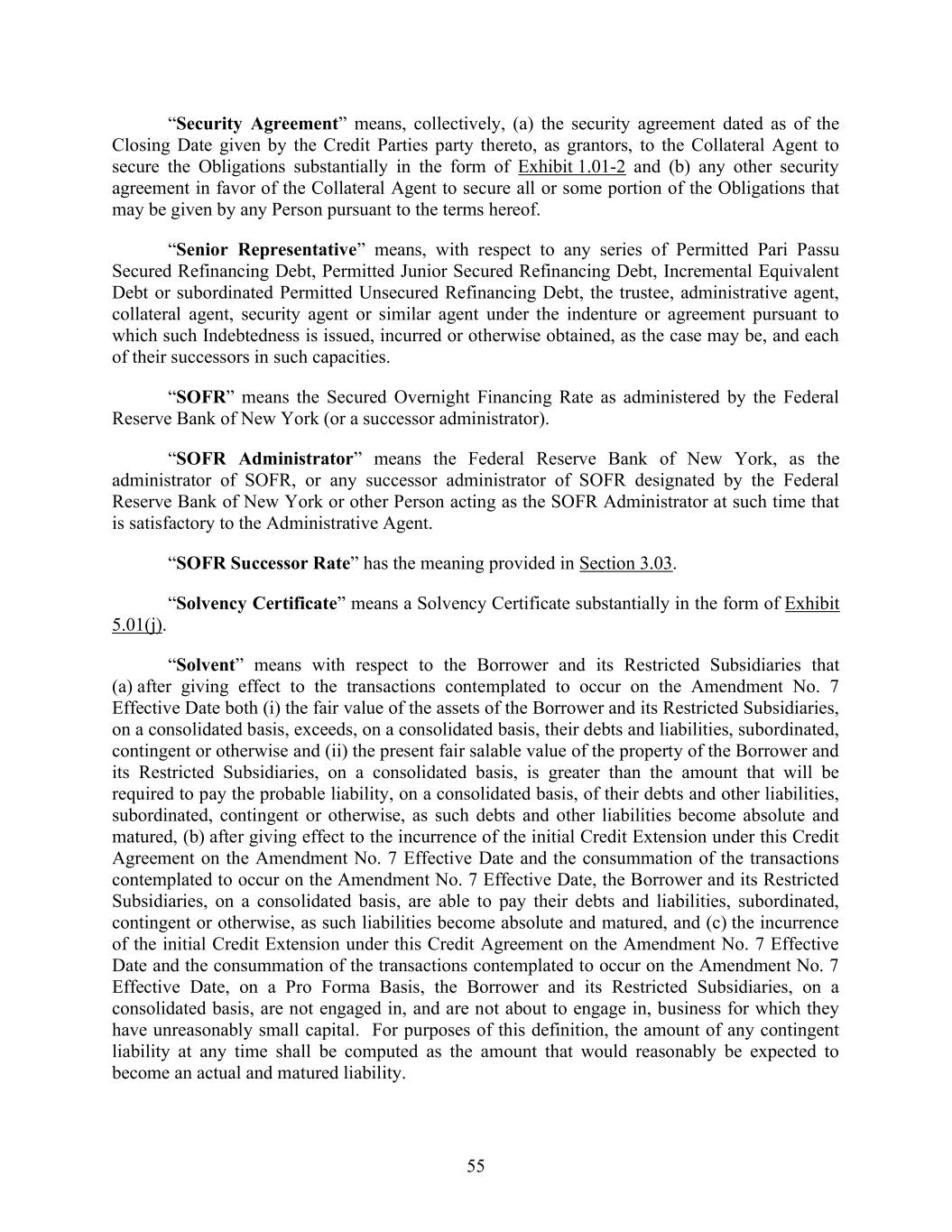 55 “Security Agreement” means, collectively, (a) the security agreement dated as of the Closing Date given by the Credit Parties party thereto, as grantors, to the Collateral Agent to secure the Obligations substantially in the form of Exhibit 1.01-2 and (b) any other security agreement in favor of the Collateral Agent to secure all or some portion of the Obligations that may be given by any Person pursuant to the terms hereof. “Senior Representative” means, with respect to any series of Permitted Pari Passu Secured Refinancing Debt, Permitted Junior Secured Refinancing Debt, Incremental Equivalent Debt or subordinated Permitted Unsecured Refinancing Debt, the trustee, administrative agent, collateral agent, security agent or similar agent under the indenture or agreement pursuant to which such Indebtedness is issued, incurred or otherwise obtained, as the case may be, and each of their successors in such capacities. “SOFR” means the Secured Overnight Financing Rate as administered by the Federal Reserve Bank of New York (or a successor administrator). “SOFR Administrator” means the Federal Reserve Bank of New York, as the administrator of SOFR, or any successor administrator of SOFR designated by the Federal Reserve Bank of New York or other Person acting as the SOFR Administrator at such time that is satisfactory to the Administrative Agent. “SOFR Successor Rate” has the meaning provided in Section 3.03. “Solvency Certificate” means a Solvency Certificate substantially in the form of Exhibit 5.01(j). “Solvent” means with respect to the Borrower and its Restricted Subsidiaries that (a) after giving effect to the transactions contemplated to occur on the Amendment No. 7 Effective Date both (i) the fair value of the assets of the Borrower and its Restricted Subsidiaries, on a consolidated basis, exceeds, on a consolidated basis, their debts and liabilities, subordinated, contingent or otherwise and (ii) the present fair salable value of the property of the Borrower and its Restricted Subsidiaries, on a consolidated basis, is greater than the amount that will be required to pay the probable liability, on a consolidated basis, of their debts and other liabilities, subordinated, contingent or otherwise, as such debts and other liabilities become absolute and matured, (b) after giving effect to the incurrence of the initial Credit Extension under this Credit Agreement on the Amendment No. 7 Effective Date and the consummation of the transactions contemplated to occur on the Amendment No. 7 Effective Date, the Borrower and its Restricted Subsidiaries, on a consolidated basis, are able to pay their debts and liabilities, subordinated, contingent or otherwise, as such liabilities become absolute and matured, and (c) the incurrence of the initial Credit Extension under this Credit Agreement on the Amendment No. 7 Effective Date and the consummation of the transactions contemplated to occur on the Amendment No. 7 Effective Date, on a Pro Forma Basis, the Borrower and its Restricted Subsidiaries, on a consolidated basis, are not engaged in, and are not about to engage in, business for which they have unreasonably small capital. For purposes of this definition, the amount of any contingent liability at any time shall be computed as the amount that would reasonably be expected to become an actual and matured liability.
