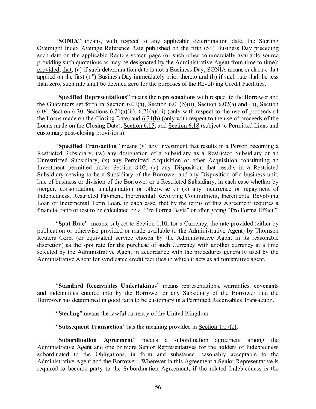 56 “SONIA” means, with respect to any applicable determination date, the Sterling Overnight Index Average Reference Rate published on the fifth (5th) Business Day preceding such date on the applicable Reuters screen page (or such other commercially available source providing such quotations as may be designated by the Administrative Agent from time to time); provided, that, (a) if such determination date is not a Business Day, SONIA means such rate that applied on the first (1st) Business Day immediately prior thereto and (b) if such rate shall be less than zero, such rate shall be deemed zero for the purposes of the Revolving Credit Facilities. “Specified Representations” means the representations with respect to the Borrower and the Guarantors set forth in Section 6.01(a), Section 6.01(b)(ii), Section 6.02(a) and (b), Section 6.04, Section 6.20, Sections 6.21(a)(ii), 6.21(a)(iii) (only with respect to the use of proceeds of the Loans made on the Closing Date) and 6.21(b) (only with respect to the use of proceeds of the Loans made on the Closing Date), Section 6.15, and Section 6.18 (subject to Permitted Liens and customary post-closing provisions). “Specified Transaction” means (v) any Investment that results in a Person becoming a Restricted Subsidiary, (w) any designation of a Subsidiary as a Restricted Subsidiary or an Unrestricted Subsidiary, (x) any Permitted Acquisition or other Acquisition constituting an Investment permitted under Section 8.02, (y) any Disposition that results in a Restricted Subsidiary ceasing to be a Subsidiary of the Borrower and any Disposition of a business unit, line of business or division of the Borrower or a Restricted Subsidiary, in each case whether by merger, consolidation, amalgamation or otherwise or (z) any incurrence or repayment of Indebtedness, Restricted Payment, Incremental Revolving Commitment, Incremental Revolving Loan or Incremental Term Loan, in each case, that by the terms of this Agreement requires a financial ratio or test to be calculated on a “Pro Forma Basis” or after giving “Pro Forma Effect.” “Spot Rate” means, subject to Section 1.10, for a Currency, the rate provided (either by publication or otherwise provided or made available to the Administrative Agent) by Thomson Reuters Corp. (or equivalent service chosen by the Administrative Agent in its reasonable discretion) as the spot rate for the purchase of such Currency with another currency at a time selected by the Administrative Agent in accordance with the procedures generally used by the Administrative Agent for syndicated credit facilities in which it acts as administrative agent. “Standard Receivables Undertakings” means representations, warranties, covenants and indemnities entered into by the Borrower or any Subsidiary of the Borrower that the Borrower has determined in good faith to be customary in a Permitted Receivables Transaction. “Sterling” means the lawful currency of the United Kingdom. “Subsequent Transaction” has the meaning provided in Section 1.07(e). “Subordination Agreement” means a subordination agreement among the Administrative Agent and one or more Senior Representatives for the holders of Indebtedness subordinated to the Obligations, in form and substance reasonably acceptable to the Administrative Agent and the Borrower. Wherever in this Agreement a Senior Representative is required to become party to the Subordination Agreement, if the related Indebtedness is the