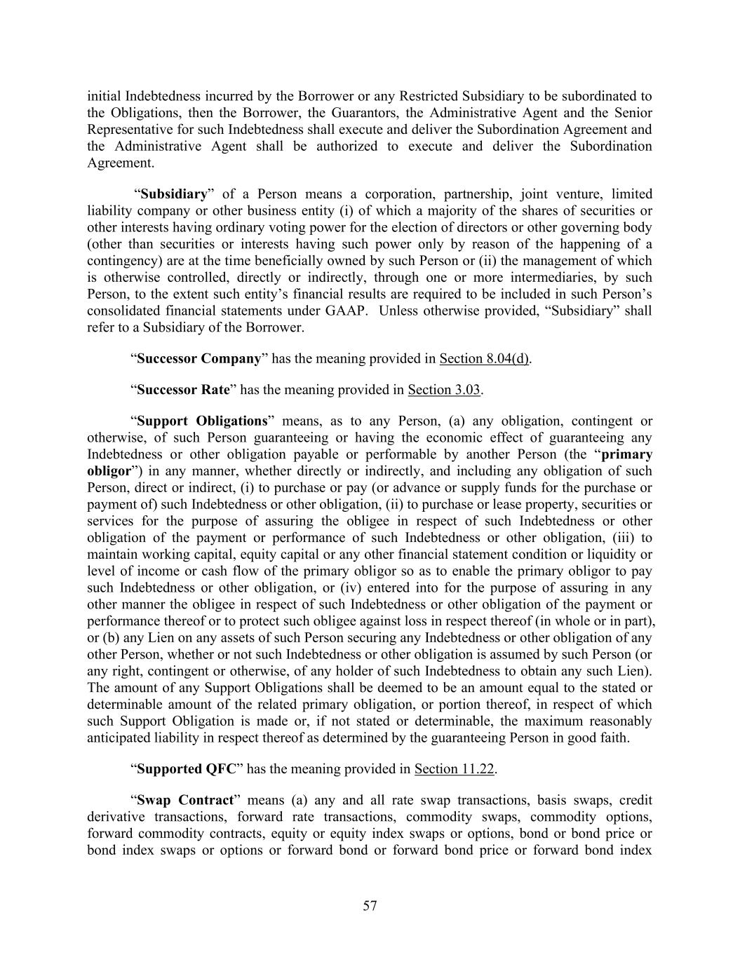 57 initial Indebtedness incurred by the Borrower or any Restricted Subsidiary to be subordinated to the Obligations, then the Borrower, the Guarantors, the Administrative Agent and the Senior Representative for such Indebtedness shall execute and deliver the Subordination Agreement and the Administrative Agent shall be authorized to execute and deliver the Subordination Agreement. “Subsidiary” of a Person means a corporation, partnership, joint venture, limited liability company or other business entity (i) of which a majority of the shares of securities or other interests having ordinary voting power for the election of directors or other governing body (other than securities or interests having such power only by reason of the happening of a contingency) are at the time beneficially owned by such Person or (ii) the management of which is otherwise controlled, directly or indirectly, through one or more intermediaries, by such Person, to the extent such entity’s financial results are required to be included in such Person’s consolidated financial statements under GAAP. Unless otherwise provided, “Subsidiary” shall refer to a Subsidiary of the Borrower. “Successor Company” has the meaning provided in Section 8.04(d). “Successor Rate” has the meaning provided in Section 3.03. “Support Obligations” means, as to any Person, (a) any obligation, contingent or otherwise, of such Person guaranteeing or having the economic effect of guaranteeing any Indebtedness or other obligation payable or performable by another Person (the “primary obligor”) in any manner, whether directly or indirectly, and including any obligation of such Person, direct or indirect, (i) to purchase or pay (or advance or supply funds for the purchase or payment of) such Indebtedness or other obligation, (ii) to purchase or lease property, securities or services for the purpose of assuring the obligee in respect of such Indebtedness or other obligation of the payment or performance of such Indebtedness or other obligation, (iii) to maintain working capital, equity capital or any other financial statement condition or liquidity or level of income or cash flow of the primary obligor so as to enable the primary obligor to pay such Indebtedness or other obligation, or (iv) entered into for the purpose of assuring in any other manner the obligee in respect of such Indebtedness or other obligation of the payment or performance thereof or to protect such obligee against loss in respect thereof (in whole or in part), or (b) any Lien on any assets of such Person securing any Indebtedness or other obligation of any other Person, whether or not such Indebtedness or other obligation is assumed by such Person (or any right, contingent or otherwise, of any holder of such Indebtedness to obtain any such Lien). The amount of any Support Obligations shall be deemed to be an amount equal to the stated or determinable amount of the related primary obligation, or portion thereof, in respect of which such Support Obligation is made or, if not stated or determinable, the maximum reasonably anticipated liability in respect thereof as determined by the guaranteeing Person in good faith. “Supported QFC” has the meaning provided in Section 11.22. “Swap Contract” means (a) any and all rate swap transactions, basis swaps, credit derivative transactions, forward rate transactions, commodity swaps, commodity options, forward commodity contracts, equity or equity index swaps or options, bond or bond price or bond index swaps or options or forward bond or forward bond price or forward bond index