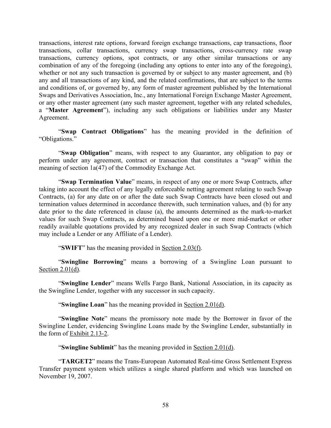58 transactions, interest rate options, forward foreign exchange transactions, cap transactions, floor transactions, collar transactions, currency swap transactions, cross-currency rate swap transactions, currency options, spot contracts, or any other similar transactions or any combination of any of the foregoing (including any options to enter into any of the foregoing), whether or not any such transaction is governed by or subject to any master agreement, and (b) any and all transactions of any kind, and the related confirmations, that are subject to the terms and conditions of, or governed by, any form of master agreement published by the International Swaps and Derivatives Association, Inc., any International Foreign Exchange Master Agreement, or any other master agreement (any such master agreement, together with any related schedules, a “Master Agreement”), including any such obligations or liabilities under any Master Agreement. “Swap Contract Obligations” has the meaning provided in the definition of “Obligations.” “Swap Obligation” means, with respect to any Guarantor, any obligation to pay or perform under any agreement, contract or transaction that constitutes a “swap” within the meaning of section 1a(47) of the Commodity Exchange Act. “Swap Termination Value” means, in respect of any one or more Swap Contracts, after taking into account the effect of any legally enforceable netting agreement relating to such Swap Contracts, (a) for any date on or after the date such Swap Contracts have been closed out and termination values determined in accordance therewith, such termination values, and (b) for any date prior to the date referenced in clause (a), the amounts determined as the mark-to-market values for such Swap Contracts, as determined based upon one or more mid-market or other readily available quotations provided by any recognized dealer in such Swap Contracts (which may include a Lender or any Affiliate of a Lender). “SWIFT” has the meaning provided in Section 2.03(f). “Swingline Borrowing” means a borrowing of a Swingline Loan pursuant to Section 2.01(d). “Swingline Lender” means Wells Fargo Bank, National Association, in its capacity as the Swingline Lender, together with any successor in such capacity. “Swingline Loan” has the meaning provided in Section 2.01(d). “Swingline Note” means the promissory note made by the Borrower in favor of the Swingline Lender, evidencing Swingline Loans made by the Swingline Lender, substantially in the form of Exhibit 2.13-2. “Swingline Sublimit” has the meaning provided in Section 2.01(d). “TARGET2” means the Trans-European Automated Real-time Gross Settlement Express Transfer payment system which utilizes a single shared platform and which was launched on November 19, 2007.