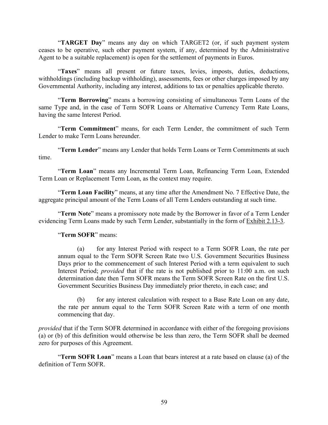 59 “TARGET Day” means any day on which TARGET2 (or, if such payment system ceases to be operative, such other payment system, if any, determined by the Administrative Agent to be a suitable replacement) is open for the settlement of payments in Euros. “Taxes” means all present or future taxes, levies, imposts, duties, deductions, withholdings (including backup withholding), assessments, fees or other charges imposed by any Governmental Authority, including any interest, additions to tax or penalties applicable thereto. “Term Borrowing” means a borrowing consisting of simultaneous Term Loans of the same Type and, in the case of Term SOFR Loans or Alternative Currency Term Rate Loans, having the same Interest Period. “Term Commitment” means, for each Term Lender, the commitment of such Term Lender to make Term Loans hereunder. “Term Lender” means any Lender that holds Term Loans or Term Commitments at such time. “Term Loan” means any Incremental Term Loan, Refinancing Term Loan, Extended Term Loan or Replacement Term Loan, as the context may require. “Term Loan Facility” means, at any time after the Amendment No. 7 Effective Date, the aggregate principal amount of the Term Loans of all Term Lenders outstanding at such time. “Term Note” means a promissory note made by the Borrower in favor of a Term Lender evidencing Term Loans made by such Term Lender, substantially in the form of Exhibit 2.13-3. “Term SOFR” means: (a) for any Interest Period with respect to a Term SOFR Loan, the rate per annum equal to the Term SOFR Screen Rate two U.S. Government Securities Business Days prior to the commencement of such Interest Period with a term equivalent to such Interest Period; provided that if the rate is not published prior to 11:00 a.m. on such determination date then Term SOFR means the Term SOFR Screen Rate on the first U.S. Government Securities Business Day immediately prior thereto, in each case; and (b) for any interest calculation with respect to a Base Rate Loan on any date, the rate per annum equal to the Term SOFR Screen Rate with a term of one month commencing that day. provided that if the Term SOFR determined in accordance with either of the foregoing provisions (a) or (b) of this definition would otherwise be less than zero, the Term SOFR shall be deemed zero for purposes of this Agreement. “Term SOFR Loan” means a Loan that bears interest at a rate based on clause (a) of the definition of Term SOFR.