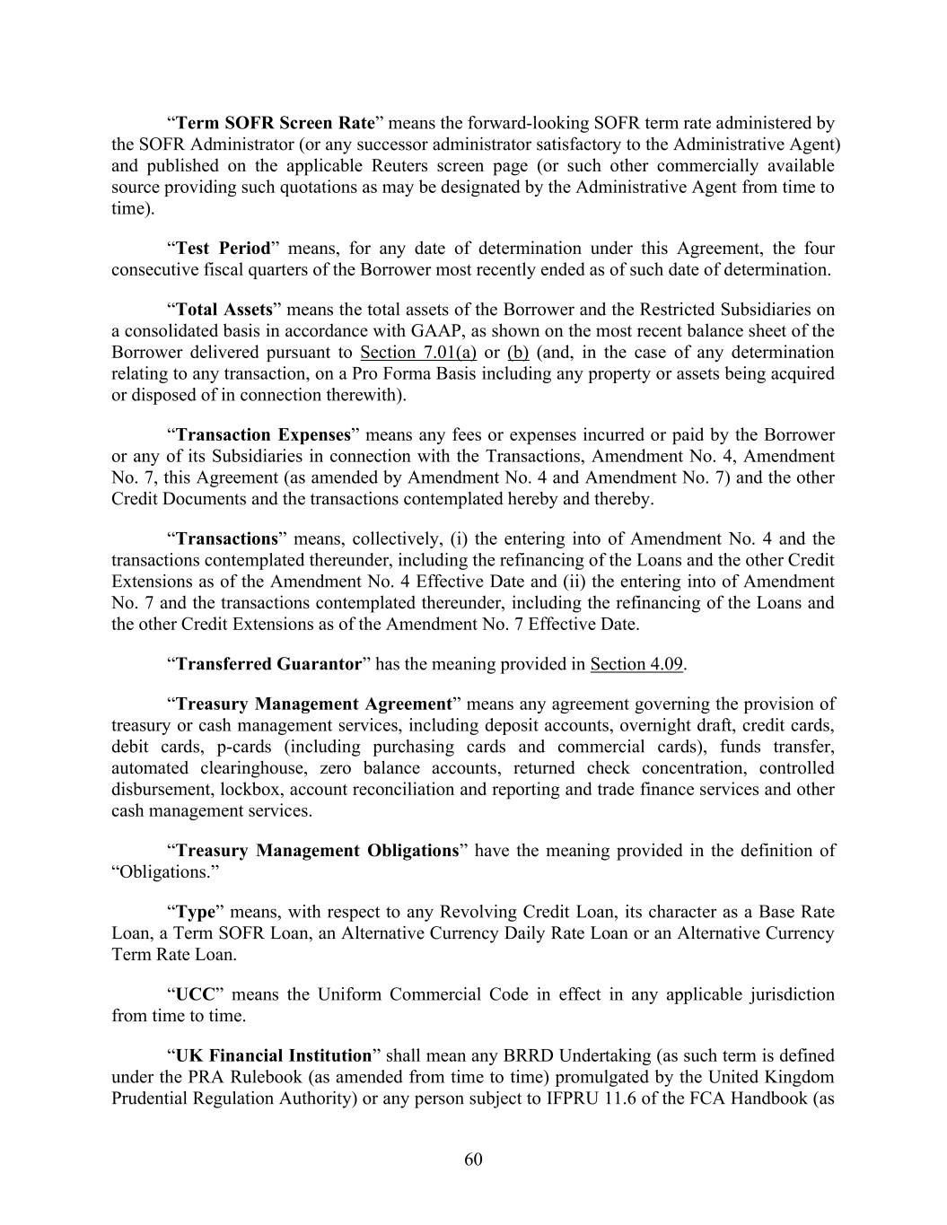 60 “Term SOFR Screen Rate” means the forward-looking SOFR term rate administered by the SOFR Administrator (or any successor administrator satisfactory to the Administrative Agent) and published on the applicable Reuters screen page (or such other commercially available source providing such quotations as may be designated by the Administrative Agent from time to time). “Test Period” means, for any date of determination under this Agreement, the four consecutive fiscal quarters of the Borrower most recently ended as of such date of determination. “Total Assets” means the total assets of the Borrower and the Restricted Subsidiaries on a consolidated basis in accordance with GAAP, as shown on the most recent balance sheet of the Borrower delivered pursuant to Section 7.01(a) or (b) (and, in the case of any determination relating to any transaction, on a Pro Forma Basis including any property or assets being acquired or disposed of in connection therewith). “Transaction Expenses” means any fees or expenses incurred or paid by the Borrower or any of its Subsidiaries in connection with the Transactions, Amendment No. 4, Amendment No. 7, this Agreement (as amended by Amendment No. 4 and Amendment No. 7) and the other Credit Documents and the transactions contemplated hereby and thereby. “Transactions” means, collectively, (i) the entering into of Amendment No. 4 and the transactions contemplated thereunder, including the refinancing of the Loans and the other Credit Extensions as of the Amendment No. 4 Effective Date and (ii) the entering into of Amendment No. 7 and the transactions contemplated thereunder, including the refinancing of the Loans and the other Credit Extensions as of the Amendment No. 7 Effective Date. “Transferred Guarantor” has the meaning provided in Section 4.09. “Treasury Management Agreement” means any agreement governing the provision of treasury or cash management services, including deposit accounts, overnight draft, credit cards, debit cards, p-cards (including purchasing cards and commercial cards), funds transfer, automated clearinghouse, zero balance accounts, returned check concentration, controlled disbursement, lockbox, account reconciliation and reporting and trade finance services and other cash management services. “Treasury Management Obligations” have the meaning provided in the definition of “Obligations.” “Type” means, with respect to any Revolving Credit Loan, its character as a Base Rate Loan, a Term SOFR Loan, an Alternative Currency Daily Rate Loan or an Alternative Currency Term Rate Loan. “UCC” means the Uniform Commercial Code in effect in any applicable jurisdiction from time to time. “UK Financial Institution” shall mean any BRRD Undertaking (as such term is defined under the PRA Rulebook (as amended from time to time) promulgated by the United Kingdom Prudential Regulation Authority) or any person subject to IFPRU 11.6 of the FCA Handbook (as