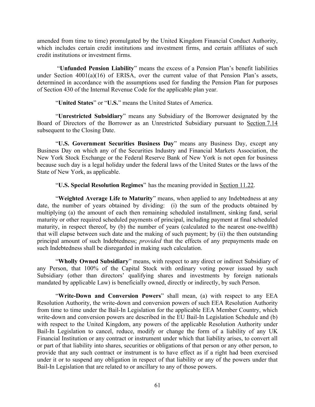 61 amended from time to time) promulgated by the United Kingdom Financial Conduct Authority, which includes certain credit institutions and investment firms, and certain affiliates of such credit institutions or investment firms. “Unfunded Pension Liability” means the excess of a Pension Plan’s benefit liabilities under Section 4001(a)(16) of ERISA, over the current value of that Pension Plan’s assets, determined in accordance with the assumptions used for funding the Pension Plan for purposes of Section 430 of the Internal Revenue Code for the applicable plan year. “United States” or “U.S.” means the United States of America. “Unrestricted Subsidiary” means any Subsidiary of the Borrower designated by the Board of Directors of the Borrower as an Unrestricted Subsidiary pursuant to Section 7.14 subsequent to the Closing Date. “U.S. Government Securities Business Day” means any Business Day, except any Business Day on which any of the Securities Industry and Financial Markets Association, the New York Stock Exchange or the Federal Reserve Bank of New York is not open for business because such day is a legal holiday under the federal laws of the United States or the laws of the State of New York, as applicable. “U.S. Special Resolution Regimes” has the meaning provided in Section 11.22. “Weighted Average Life to Maturity” means, when applied to any Indebtedness at any date, the number of years obtained by dividing: (i) the sum of the products obtained by multiplying (a) the amount of each then remaining scheduled installment, sinking fund, serial maturity or other required scheduled payments of principal, including payment at final scheduled maturity, in respect thereof, by (b) the number of years (calculated to the nearest one-twelfth) that will elapse between such date and the making of such payment; by (ii) the then outstanding principal amount of such Indebtedness; provided that the effects of any prepayments made on such Indebtedness shall be disregarded in making such calculation. “Wholly Owned Subsidiary” means, with respect to any direct or indirect Subsidiary of any Person, that 100% of the Capital Stock with ordinary voting power issued by such Subsidiary (other than directors’ qualifying shares and investments by foreign nationals mandated by applicable Law) is beneficially owned, directly or indirectly, by such Person. “Write-Down and Conversion Powers” shall mean, (a) with respect to any EEA Resolution Authority, the write-down and conversion powers of such EEA Resolution Authority from time to time under the Bail-In Legislation for the applicable EEA Member Country, which write-down and conversion powers are described in the EU Bail-In Legislation Schedule and (b) with respect to the United Kingdom, any powers of the applicable Resolution Authority under Bail-In Legislation to cancel, reduce, modify or change the form of a liability of any UK Financial Institution or any contract or instrument under which that liability arises, to convert all or part of that liability into shares, securities or obligations of that person or any other person, to provide that any such contract or instrument is to have effect as if a right had been exercised under it or to suspend any obligation in respect of that liability or any of the powers under that Bail-In Legislation that are related to or ancillary to any of those powers.