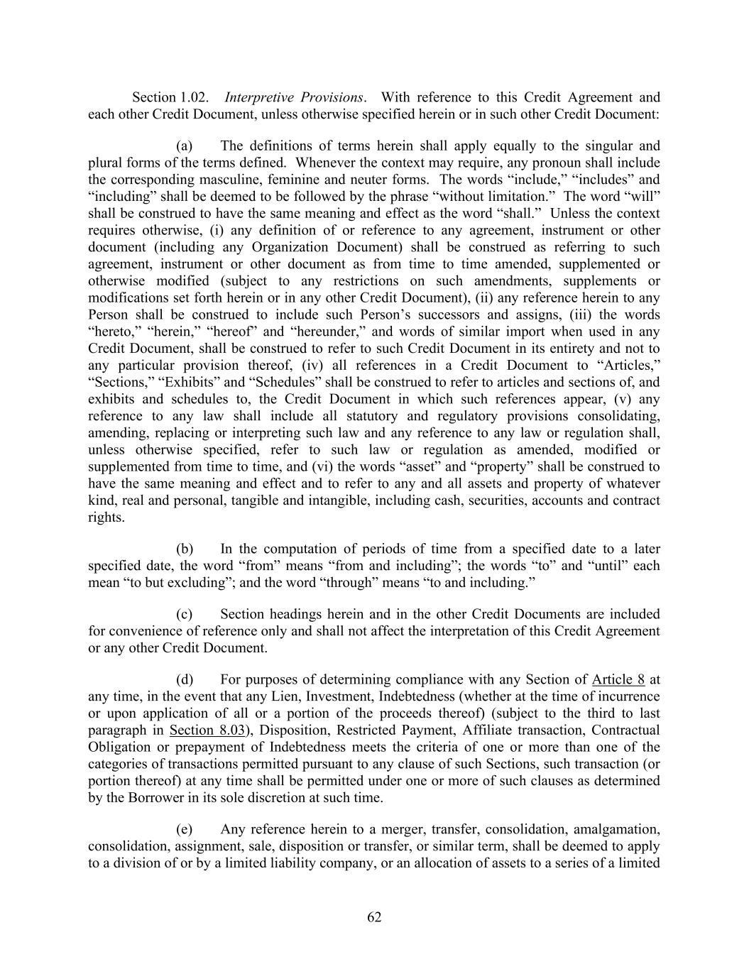 62 Section 1.02. Interpretive Provisions. With reference to this Credit Agreement and each other Credit Document, unless otherwise specified herein or in such other Credit Document: (a) The definitions of terms herein shall apply equally to the singular and plural forms of the terms defined. Whenever the context may require, any pronoun shall include the corresponding masculine, feminine and neuter forms. The words “include,” “includes” and “including” shall be deemed to be followed by the phrase “without limitation.” The word “will” shall be construed to have the same meaning and effect as the word “shall.” Unless the context requires otherwise, (i) any definition of or reference to any agreement, instrument or other document (including any Organization Document) shall be construed as referring to such agreement, instrument or other document as from time to time amended, supplemented or otherwise modified (subject to any restrictions on such amendments, supplements or modifications set forth herein or in any other Credit Document), (ii) any reference herein to any Person shall be construed to include such Person’s successors and assigns, (iii) the words “hereto,” “herein,” “hereof” and “hereunder,” and words of similar import when used in any Credit Document, shall be construed to refer to such Credit Document in its entirety and not to any particular provision thereof, (iv) all references in a Credit Document to “Articles,” “Sections,” “Exhibits” and “Schedules” shall be construed to refer to articles and sections of, and exhibits and schedules to, the Credit Document in which such references appear, (v) any reference to any law shall include all statutory and regulatory provisions consolidating, amending, replacing or interpreting such law and any reference to any law or regulation shall, unless otherwise specified, refer to such law or regulation as amended, modified or supplemented from time to time, and (vi) the words “asset” and “property” shall be construed to have the same meaning and effect and to refer to any and all assets and property of whatever kind, real and personal, tangible and intangible, including cash, securities, accounts and contract rights. (b) In the computation of periods of time from a specified date to a later specified date, the word “from” means “from and including”; the words “to” and “until” each mean “to but excluding”; and the word “through” means “to and including.” (c) Section headings herein and in the other Credit Documents are included for convenience of reference only and shall not affect the interpretation of this Credit Agreement or any other Credit Document. (d) For purposes of determining compliance with any Section of Article 8 at any time, in the event that any Lien, Investment, Indebtedness (whether at the time of incurrence or upon application of all or a portion of the proceeds thereof) (subject to the third to last paragraph in Section 8.03), Disposition, Restricted Payment, Affiliate transaction, Contractual Obligation or prepayment of Indebtedness meets the criteria of one or more than one of the categories of transactions permitted pursuant to any clause of such Sections, such transaction (or portion thereof) at any time shall be permitted under one or more of such clauses as determined by the Borrower in its sole discretion at such time. (e) Any reference herein to a merger, transfer, consolidation, amalgamation, consolidation, assignment, sale, disposition or transfer, or similar term, shall be deemed to apply to a division of or by a limited liability company, or an allocation of assets to a series of a limited