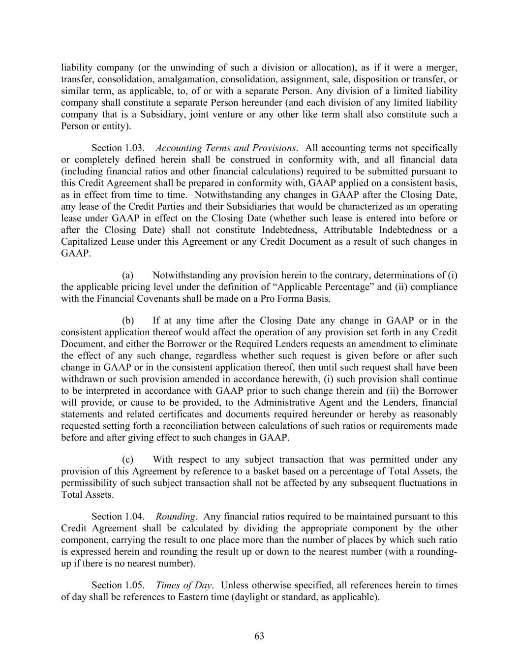 63 liability company (or the unwinding of such a division or allocation), as if it were a merger, transfer, consolidation, amalgamation, consolidation, assignment, sale, disposition or transfer, or similar term, as applicable, to, of or with a separate Person. Any division of a limited liability company shall constitute a separate Person hereunder (and each division of any limited liability company that is a Subsidiary, joint venture or any other like term shall also constitute such a Person or entity). Section 1.03. Accounting Terms and Provisions. All accounting terms not specifically or completely defined herein shall be construed in conformity with, and all financial data (including financial ratios and other financial calculations) required to be submitted pursuant to this Credit Agreement shall be prepared in conformity with, GAAP applied on a consistent basis, as in effect from time to time. Notwithstanding any changes in GAAP after the Closing Date, any lease of the Credit Parties and their Subsidiaries that would be characterized as an operating lease under GAAP in effect on the Closing Date (whether such lease is entered into before or after the Closing Date) shall not constitute Indebtedness, Attributable Indebtedness or a Capitalized Lease under this Agreement or any Credit Document as a result of such changes in GAAP. (a) Notwithstanding any provision herein to the contrary, determinations of (i) the applicable pricing level under the definition of “Applicable Percentage” and (ii) compliance with the Financial Covenants shall be made on a Pro Forma Basis. (b) If at any time after the Closing Date any change in GAAP or in the consistent application thereof would affect the operation of any provision set forth in any Credit Document, and either the Borrower or the Required Lenders requests an amendment to eliminate the effect of any such change, regardless whether such request is given before or after such change in GAAP or in the consistent application thereof, then until such request shall have been withdrawn or such provision amended in accordance herewith, (i) such provision shall continue to be interpreted in accordance with GAAP prior to such change therein and (ii) the Borrower will provide, or cause to be provided, to the Administrative Agent and the Lenders, financial statements and related certificates and documents required hereunder or hereby as reasonably requested setting forth a reconciliation between calculations of such ratios or requirements made before and after giving effect to such changes in GAAP. (c) With respect to any subject transaction that was permitted under any provision of this Agreement by reference to a basket based on a percentage of Total Assets, the permissibility of such subject transaction shall not be affected by any subsequent fluctuations in Total Assets. Section 1.04. Rounding. Any financial ratios required to be maintained pursuant to this Credit Agreement shall be calculated by dividing the appropriate component by the other component, carrying the result to one place more than the number of places by which such ratio is expressed herein and rounding the result up or down to the nearest number (with a rounding- up if there is no nearest number). Section 1.05. Times of Day. Unless otherwise specified, all references herein to times of day shall be references to Eastern time (daylight or standard, as applicable).
