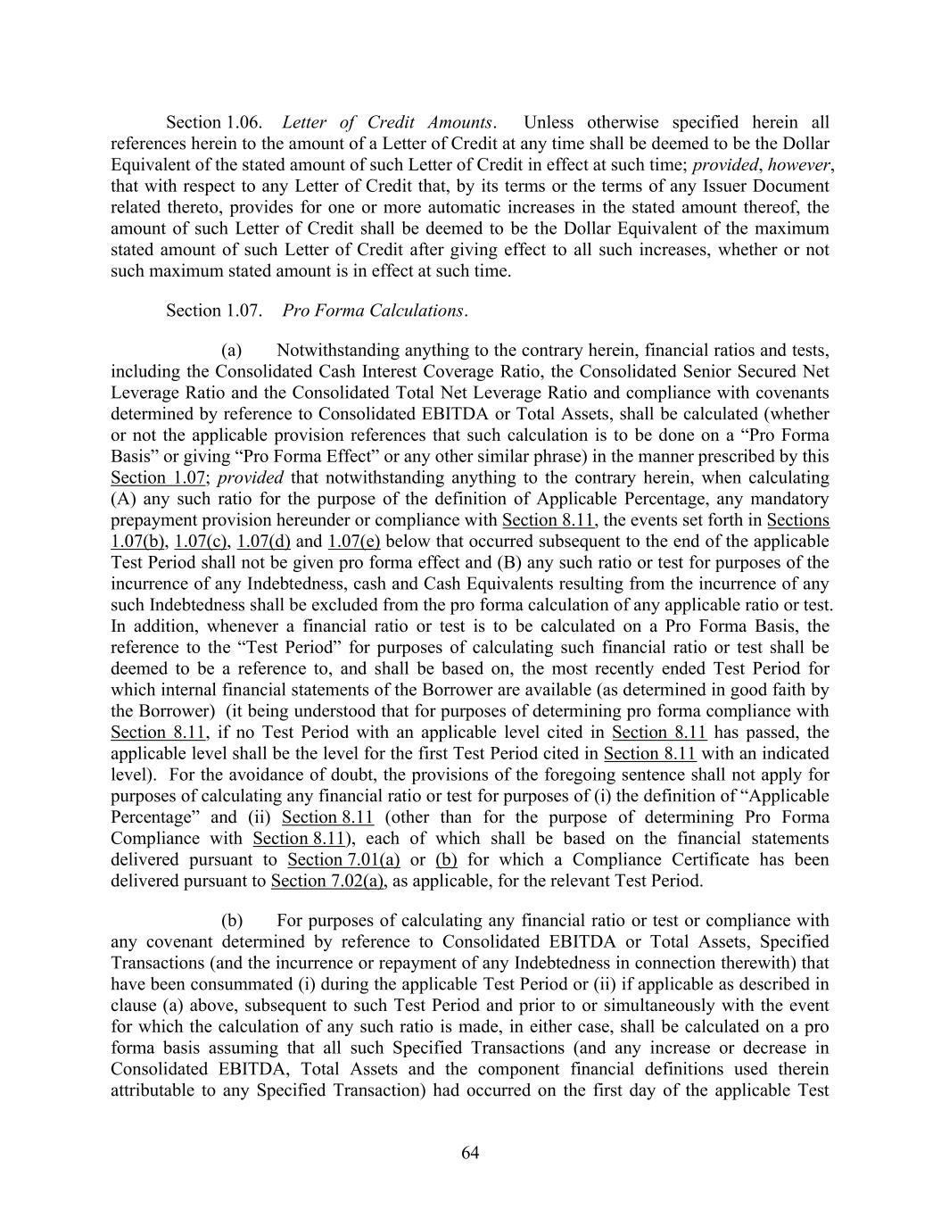 64 Section 1.06. Letter of Credit Amounts. Unless otherwise specified herein all references herein to the amount of a Letter of Credit at any time shall be deemed to be the Dollar Equivalent of the stated amount of such Letter of Credit in effect at such time; provided, however, that with respect to any Letter of Credit that, by its terms or the terms of any Issuer Document related thereto, provides for one or more automatic increases in the stated amount thereof, the amount of such Letter of Credit shall be deemed to be the Dollar Equivalent of the maximum stated amount of such Letter of Credit after giving effect to all such increases, whether or not such maximum stated amount is in effect at such time. Section 1.07. Pro Forma Calculations. (a) Notwithstanding anything to the contrary herein, financial ratios and tests, including the Consolidated Cash Interest Coverage Ratio, the Consolidated Senior Secured Net Leverage Ratio and the Consolidated Total Net Leverage Ratio and compliance with covenants determined by reference to Consolidated EBITDA or Total Assets, shall be calculated (whether or not the applicable provision references that such calculation is to be done on a “Pro Forma Basis” or giving “Pro Forma Effect” or any other similar phrase) in the manner prescribed by this Section 1.07; provided that notwithstanding anything to the contrary herein, when calculating (A) any such ratio for the purpose of the definition of Applicable Percentage, any mandatory prepayment provision hereunder or compliance with Section 8.11, the events set forth in Sections 1.07(b), 1.07(c), 1.07(d) and 1.07(e) below that occurred subsequent to the end of the applicable Test Period shall not be given pro forma effect and (B) any such ratio or test for purposes of the incurrence of any Indebtedness, cash and Cash Equivalents resulting from the incurrence of any such Indebtedness shall be excluded from the pro forma calculation of any applicable ratio or test. In addition, whenever a financial ratio or test is to be calculated on a Pro Forma Basis, the reference to the “Test Period” for purposes of calculating such financial ratio or test shall be deemed to be a reference to, and shall be based on, the most recently ended Test Period for which internal financial statements of the Borrower are available (as determined in good faith by the Borrower) (it being understood that for purposes of determining pro forma compliance with Section 8.11, if no Test Period with an applicable level cited in Section 8.11 has passed, the applicable level shall be the level for the first Test Period cited in Section 8.11 with an indicated level). For the avoidance of doubt, the provisions of the foregoing sentence shall not apply for purposes of calculating any financial ratio or test for purposes of (i) the definition of “Applicable Percentage” and (ii) Section 8.11 (other than for the purpose of determining Pro Forma Compliance with Section 8.11), each of which shall be based on the financial statements delivered pursuant to Section 7.01(a) or (b) for which a Compliance Certificate has been delivered pursuant to Section 7.02(a), as applicable, for the relevant Test Period. (b) For purposes of calculating any financial ratio or test or compliance with any covenant determined by reference to Consolidated EBITDA or Total Assets, Specified Transactions (and the incurrence or repayment of any Indebtedness in connection therewith) that have been consummated (i) during the applicable Test Period or (ii) if applicable as described in clause (a) above, subsequent to such Test Period and prior to or simultaneously with the event for which the calculation of any such ratio is made, in either case, shall be calculated on a pro forma basis assuming that all such Specified Transactions (and any increase or decrease in Consolidated EBITDA, Total Assets and the component financial definitions used therein attributable to any Specified Transaction) had occurred on the first day of the applicable Test