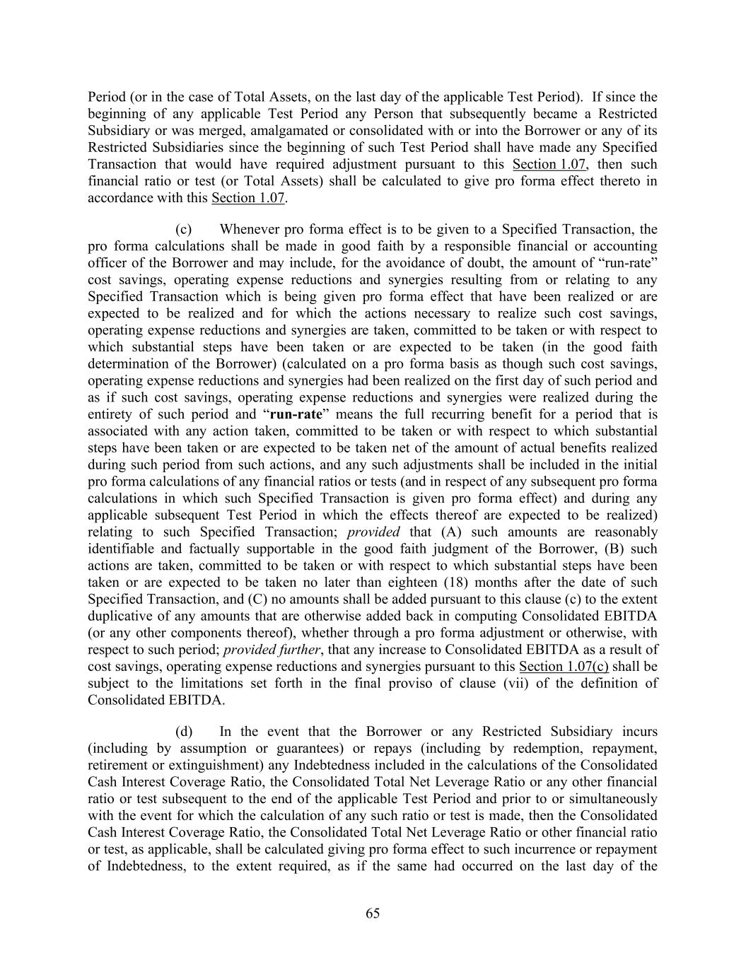 65 Period (or in the case of Total Assets, on the last day of the applicable Test Period). If since the beginning of any applicable Test Period any Person that subsequently became a Restricted Subsidiary or was merged, amalgamated or consolidated with or into the Borrower or any of its Restricted Subsidiaries since the beginning of such Test Period shall have made any Specified Transaction that would have required adjustment pursuant to this Section 1.07, then such financial ratio or test (or Total Assets) shall be calculated to give pro forma effect thereto in accordance with this Section 1.07. (c) Whenever pro forma effect is to be given to a Specified Transaction, the pro forma calculations shall be made in good faith by a responsible financial or accounting officer of the Borrower and may include, for the avoidance of doubt, the amount of “run-rate” cost savings, operating expense reductions and synergies resulting from or relating to any Specified Transaction which is being given pro forma effect that have been realized or are expected to be realized and for which the actions necessary to realize such cost savings, operating expense reductions and synergies are taken, committed to be taken or with respect to which substantial steps have been taken or are expected to be taken (in the good faith determination of the Borrower) (calculated on a pro forma basis as though such cost savings, operating expense reductions and synergies had been realized on the first day of such period and as if such cost savings, operating expense reductions and synergies were realized during the entirety of such period and “run-rate” means the full recurring benefit for a period that is associated with any action taken, committed to be taken or with respect to which substantial steps have been taken or are expected to be taken net of the amount of actual benefits realized during such period from such actions, and any such adjustments shall be included in the initial pro forma calculations of any financial ratios or tests (and in respect of any subsequent pro forma calculations in which such Specified Transaction is given pro forma effect) and during any applicable subsequent Test Period in which the effects thereof are expected to be realized) relating to such Specified Transaction; provided that (A) such amounts are reasonably identifiable and factually supportable in the good faith judgment of the Borrower, (B) such actions are taken, committed to be taken or with respect to which substantial steps have been taken or are expected to be taken no later than eighteen (18) months after the date of such Specified Transaction, and (C) no amounts shall be added pursuant to this clause (c) to the extent duplicative of any amounts that are otherwise added back in computing Consolidated EBITDA (or any other components thereof), whether through a pro forma adjustment or otherwise, with respect to such period; provided further, that any increase to Consolidated EBITDA as a result of cost savings, operating expense reductions and synergies pursuant to this Section 1.07(c) shall be subject to the limitations set forth in the final proviso of clause (vii) of the definition of Consolidated EBITDA. (d) In the event that the Borrower or any Restricted Subsidiary incurs (including by assumption or guarantees) or repays (including by redemption, repayment, retirement or extinguishment) any Indebtedness included in the calculations of the Consolidated Cash Interest Coverage Ratio, the Consolidated Total Net Leverage Ratio or any other financial ratio or test subsequent to the end of the applicable Test Period and prior to or simultaneously with the event for which the calculation of any such ratio or test is made, then the Consolidated Cash Interest Coverage Ratio, the Consolidated Total Net Leverage Ratio or other financial ratio or test, as applicable, shall be calculated giving pro forma effect to such incurrence or repayment of Indebtedness, to the extent required, as if the same had occurred on the last day of the