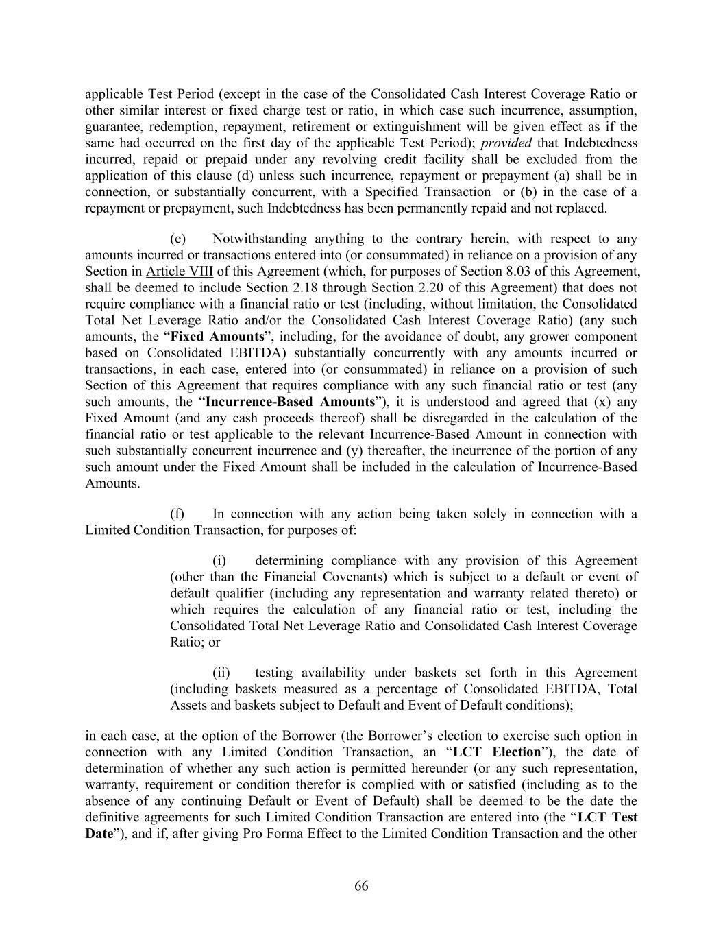 66 applicable Test Period (except in the case of the Consolidated Cash Interest Coverage Ratio or other similar interest or fixed charge test or ratio, in which case such incurrence, assumption, guarantee, redemption, repayment, retirement or extinguishment will be given effect as if the same had occurred on the first day of the applicable Test Period); provided that Indebtedness incurred, repaid or prepaid under any revolving credit facility shall be excluded from the application of this clause (d) unless such incurrence, repayment or prepayment (a) shall be in connection, or substantially concurrent, with a Specified Transaction or (b) in the case of a repayment or prepayment, such Indebtedness has been permanently repaid and not replaced. (e) Notwithstanding anything to the contrary herein, with respect to any amounts incurred or transactions entered into (or consummated) in reliance on a provision of any Section in Article VIII of this Agreement (which, for purposes of Section 8.03 of this Agreement, shall be deemed to include Section 2.18 through Section 2.20 of this Agreement) that does not require compliance with a financial ratio or test (including, without limitation, the Consolidated Total Net Leverage Ratio and/or the Consolidated Cash Interest Coverage Ratio) (any such amounts, the “Fixed Amounts”, including, for the avoidance of doubt, any grower component based on Consolidated EBITDA) substantially concurrently with any amounts incurred or transactions, in each case, entered into (or consummated) in reliance on a provision of such Section of this Agreement that requires compliance with any such financial ratio or test (any such amounts, the “Incurrence-Based Amounts”), it is understood and agreed that (x) any Fixed Amount (and any cash proceeds thereof) shall be disregarded in the calculation of the financial ratio or test applicable to the relevant Incurrence-Based Amount in connection with such substantially concurrent incurrence and (y) thereafter, the incurrence of the portion of any such amount under the Fixed Amount shall be included in the calculation of Incurrence-Based Amounts. (f) In connection with any action being taken solely in connection with a Limited Condition Transaction, for purposes of: (i) determining compliance with any provision of this Agreement (other than the Financial Covenants) which is subject to a default or event of default qualifier (including any representation and warranty related thereto) or which requires the calculation of any financial ratio or test, including the Consolidated Total Net Leverage Ratio and Consolidated Cash Interest Coverage Ratio; or (ii) testing availability under baskets set forth in this Agreement (including baskets measured as a percentage of Consolidated EBITDA, Total Assets and baskets subject to Default and Event of Default conditions); in each case, at the option of the Borrower (the Borrower’s election to exercise such option in connection with any Limited Condition Transaction, an “LCT Election”), the date of determination of whether any such action is permitted hereunder (or any such representation, warranty, requirement or condition therefor is complied with or satisfied (including as to the absence of any continuing Default or Event of Default) shall be deemed to be the date the definitive agreements for such Limited Condition Transaction are entered into (the “LCT Test Date”), and if, after giving Pro Forma Effect to the Limited Condition Transaction and the other