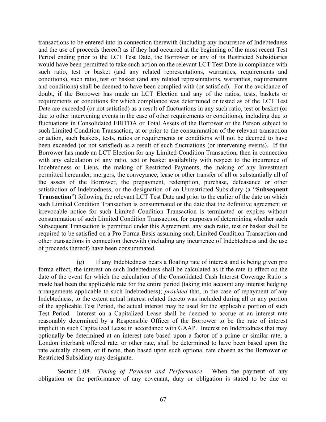 67 transactions to be entered into in connection therewith (including any incurrence of Indebtedness and the use of proceeds thereof) as if they had occurred at the beginning of the most recent Test Period ending prior to the LCT Test Date, the Borrower or any of its Restricted Subsidiaries would have been permitted to take such action on the relevant LCT Test Date in compliance with such ratio, test or basket (and any related representations, warranties, requirements and conditions), such ratio, test or basket (and any related representations, warranties, requirements and conditions) shall be deemed to have been complied with (or satisfied). For the avoidance of doubt, if the Borrower has made an LCT Election and any of the ratios, tests, baskets or requirements or conditions for which compliance was determined or tested as of the LCT Test Date are exceeded (or not satisfied) as a result of fluctuations in any such ratio, test or basket (or due to other intervening events in the case of other requirements or conditions), including due to fluctuations in Consolidated EBITDA or Total Assets of the Borrower or the Person subject to such Limited Condition Transaction, at or prior to the consummation of the relevant transaction or action, such baskets, tests, ratios or requirements or conditions will not be deemed to have been exceeded (or not satisfied) as a result of such fluctuations (or intervening events). If the Borrower has made an LCT Election for any Limited Condition Transaction, then in connection with any calculation of any ratio, test or basket availability with respect to the incurrence of Indebtedness or Liens, the making of Restricted Payments, the making of any Investment permitted hereunder, mergers, the conveyance, lease or other transfer of all or substantially all of the assets of the Borrower, the prepayment, redemption, purchase, defeasance or other satisfaction of Indebtedness, or the designation of an Unrestricted Subsidiary (a “Subsequent Transaction”) following the relevant LCT Test Date and prior to the earlier of the date on which such Limited Condition Transaction is consummated or the date that the definitive agreement or irrevocable notice for such Limited Condition Transaction is terminated or expires without consummation of such Limited Condition Transaction, for purposes of determining whether such Subsequent Transaction is permitted under this Agreement, any such ratio, test or basket shall be required to be satisfied on a Pro Forma Basis assuming such Limited Condition Transaction and other transactions in connection therewith (including any incurrence of Indebtedness and the use of proceeds thereof) have been consummated. (g) If any Indebtedness bears a floating rate of interest and is being given pro forma effect, the interest on such Indebtedness shall be calculated as if the rate in effect on the date of the event for which the calculation of the Consolidated Cash Interest Coverage Ratio is made had been the applicable rate for the entire period (taking into account any interest hedging arrangements applicable to such Indebtedness); provided that, in the case of repayment of any Indebtedness, to the extent actual interest related thereto was included during all or any portion of the applicable Test Period, the actual interest may be used for the applicable portion of such Test Period. Interest on a Capitalized Lease shall be deemed to accrue at an interest rate reasonably determined by a Responsible Officer of the Borrower to be the rate of interest implicit in such Capitalized Lease in accordance with GAAP. Interest on Indebtedness that may optionally be determined at an interest rate based upon a factor of a prime or similar rate, a London interbank offered rate, or other rate, shall be determined to have been based upon the rate actually chosen, or if none, then based upon such optional rate chosen as the Borrower or Restricted Subsidiary may designate. Section 1.08. Timing of Payment and Performance. When the payment of any obligation or the performance of any covenant, duty or obligation is stated to be due or