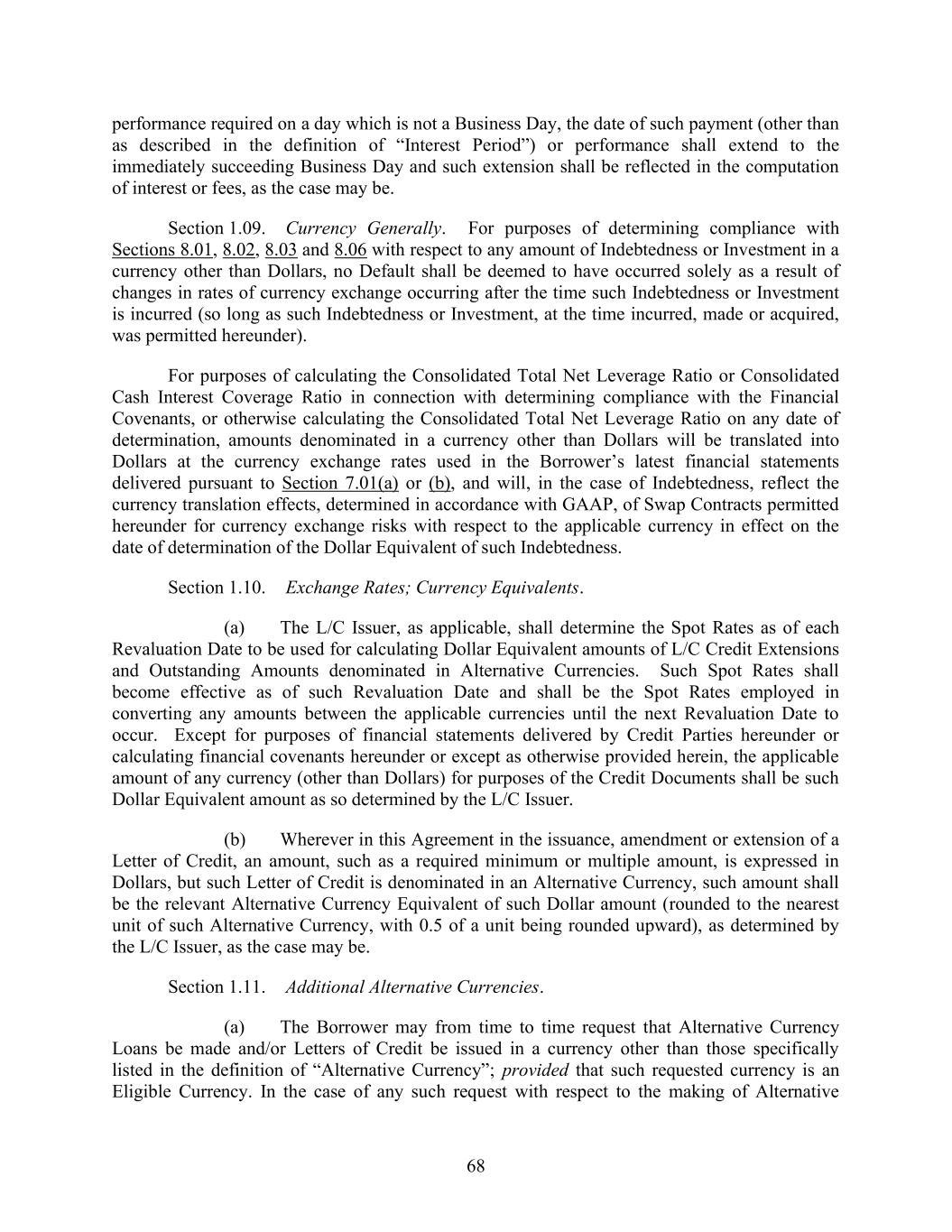 68 performance required on a day which is not a Business Day, the date of such payment (other than as described in the definition of “Interest Period”) or performance shall extend to the immediately succeeding Business Day and such extension shall be reflected in the computation of interest or fees, as the case may be. Section 1.09. Currency Generally. For purposes of determining compliance with Sections 8.01, 8.02, 8.03 and 8.06 with respect to any amount of Indebtedness or Investment in a currency other than Dollars, no Default shall be deemed to have occurred solely as a result of changes in rates of currency exchange occurring after the time such Indebtedness or Investment is incurred (so long as such Indebtedness or Investment, at the time incurred, made or acquired, was permitted hereunder). For purposes of calculating the Consolidated Total Net Leverage Ratio or Consolidated Cash Interest Coverage Ratio in connection with determining compliance with the Financial Covenants, or otherwise calculating the Consolidated Total Net Leverage Ratio on any date of determination, amounts denominated in a currency other than Dollars will be translated into Dollars at the currency exchange rates used in the Borrower’s latest financial statements delivered pursuant to Section 7.01(a) or (b), and will, in the case of Indebtedness, reflect the currency translation effects, determined in accordance with GAAP, of Swap Contracts permitted hereunder for currency exchange risks with respect to the applicable currency in effect on the date of determination of the Dollar Equivalent of such Indebtedness. Section 1.10. Exchange Rates; Currency Equivalents. (a) The L/C Issuer, as applicable, shall determine the Spot Rates as of each Revaluation Date to be used for calculating Dollar Equivalent amounts of L/C Credit Extensions and Outstanding Amounts denominated in Alternative Currencies. Such Spot Rates shall become effective as of such Revaluation Date and shall be the Spot Rates employed in converting any amounts between the applicable currencies until the next Revaluation Date to occur. Except for purposes of financial statements delivered by Credit Parties hereunder or calculating financial covenants hereunder or except as otherwise provided herein, the applicable amount of any currency (other than Dollars) for purposes of the Credit Documents shall be such Dollar Equivalent amount as so determined by the L/C Issuer. (b) Wherever in this Agreement in the issuance, amendment or extension of a Letter of Credit, an amount, such as a required minimum or multiple amount, is expressed in Dollars, but such Letter of Credit is denominated in an Alternative Currency, such amount shall be the relevant Alternative Currency Equivalent of such Dollar amount (rounded to the nearest unit of such Alternative Currency, with 0.5 of a unit being rounded upward), as determined by the L/C Issuer, as the case may be. Section 1.11. Additional Alternative Currencies. (a) The Borrower may from time to time request that Alternative Currency Loans be made and/or Letters of Credit be issued in a currency other than those specifically listed in the definition of “Alternative Currency”; provided that such requested currency is an Eligible Currency. In the case of any such request with respect to the making of Alternative