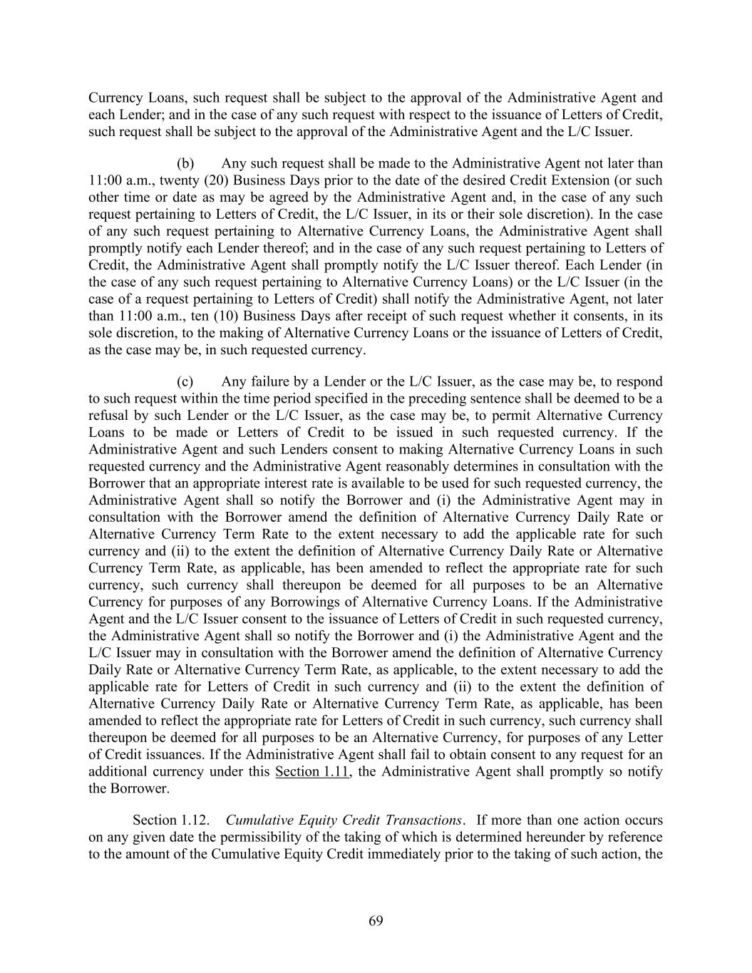 69 Currency Loans, such request shall be subject to the approval of the Administrative Agent and each Lender; and in the case of any such request with respect to the issuance of Letters of Credit, such request shall be subject to the approval of the Administrative Agent and the L/C Issuer. (b) Any such request shall be made to the Administrative Agent not later than 11:00 a.m., twenty (20) Business Days prior to the date of the desired Credit Extension (or such other time or date as may be agreed by the Administrative Agent and, in the case of any such request pertaining to Letters of Credit, the L/C Issuer, in its or their sole discretion). In the case of any such request pertaining to Alternative Currency Loans, the Administrative Agent shall promptly notify each Lender thereof; and in the case of any such request pertaining to Letters of Credit, the Administrative Agent shall promptly notify the L/C Issuer thereof. Each Lender (in the case of any such request pertaining to Alternative Currency Loans) or the L/C Issuer (in the case of a request pertaining to Letters of Credit) shall notify the Administrative Agent, not later than 11:00 a.m., ten (10) Business Days after receipt of such request whether it consents, in its sole discretion, to the making of Alternative Currency Loans or the issuance of Letters of Credit, as the case may be, in such requested currency. (c) Any failure by a Lender or the L/C Issuer, as the case may be, to respond to such request within the time period specified in the preceding sentence shall be deemed to be a refusal by such Lender or the L/C Issuer, as the case may be, to permit Alternative Currency Loans to be made or Letters of Credit to be issued in such requested currency. If the Administrative Agent and such Lenders consent to making Alternative Currency Loans in such requested currency and the Administrative Agent reasonably determines in consultation with the Borrower that an appropriate interest rate is available to be used for such requested currency, the Administrative Agent shall so notify the Borrower and (i) the Administrative Agent may in consultation with the Borrower amend the definition of Alternative Currency Daily Rate or Alternative Currency Term Rate to the extent necessary to add the applicable rate for such currency and (ii) to the extent the definition of Alternative Currency Daily Rate or Alternative Currency Term Rate, as applicable, has been amended to reflect the appropriate rate for such currency, such currency shall thereupon be deemed for all purposes to be an Alternative Currency for purposes of any Borrowings of Alternative Currency Loans. If the Administrative Agent and the L/C Issuer consent to the issuance of Letters of Credit in such requested currency, the Administrative Agent shall so notify the Borrower and (i) the Administrative Agent and the L/C Issuer may in consultation with the Borrower amend the definition of Alternative Currency Daily Rate or Alternative Currency Term Rate, as applicable, to the extent necessary to add the applicable rate for Letters of Credit in such currency and (ii) to the extent the definition of Alternative Currency Daily Rate or Alternative Currency Term Rate, as applicable, has been amended to reflect the appropriate rate for Letters of Credit in such currency, such currency shall thereupon be deemed for all purposes to be an Alternative Currency, for purposes of any Letter of Credit issuances. If the Administrative Agent shall fail to obtain consent to any request for an additional currency under this Section 1.11, the Administrative Agent shall promptly so notify the Borrower. Section 1.12. Cumulative Equity Credit Transactions. If more than one action occurs on any given date the permissibility of the taking of which is determined hereunder by reference to the amount of the Cumulative Equity Credit immediately prior to the taking of such action, the