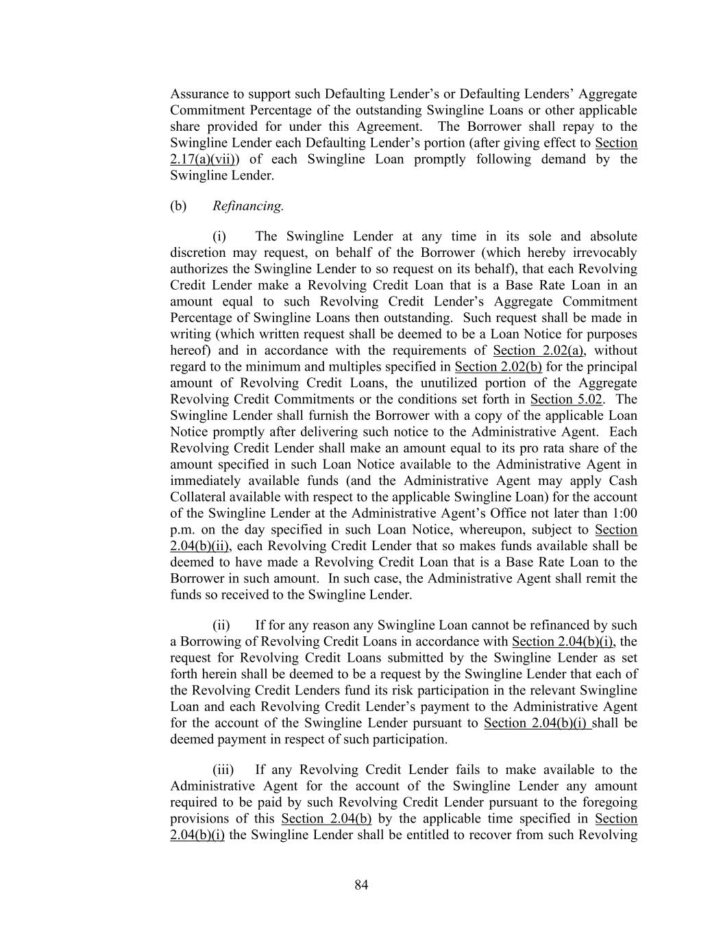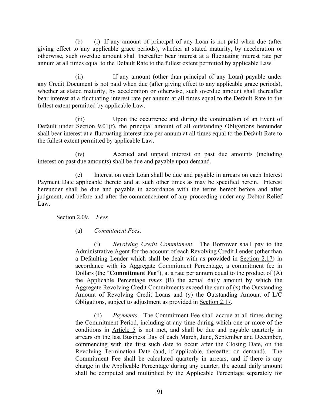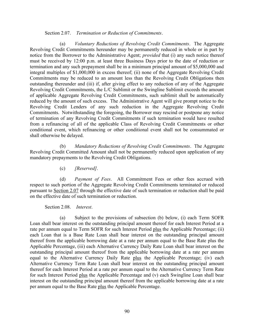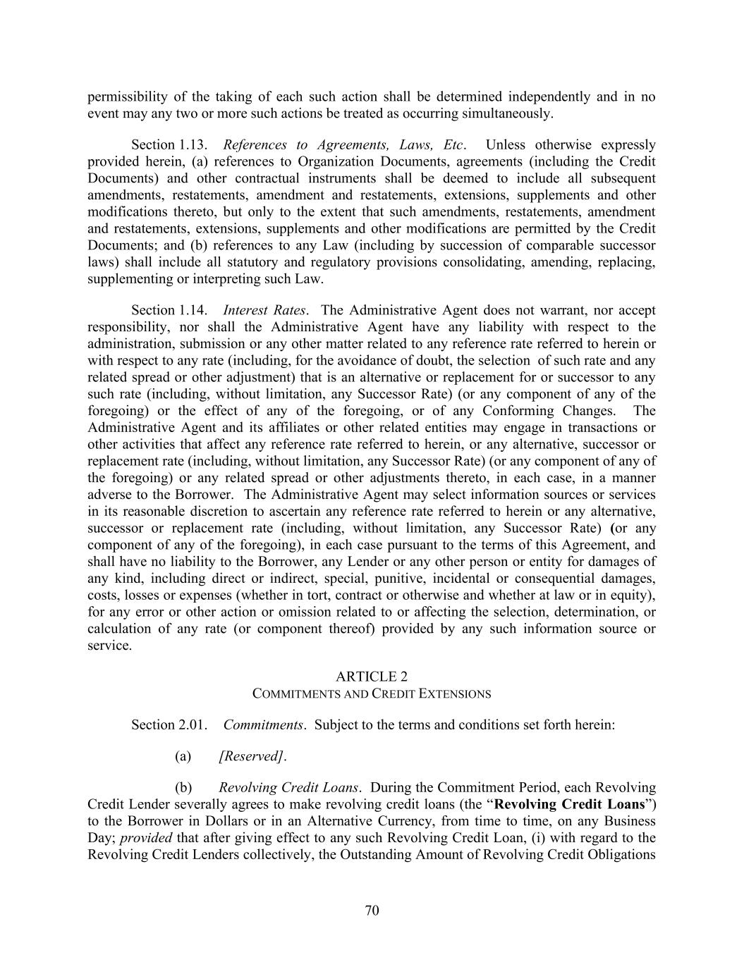 70 permissibility of the taking of each such action shall be determined independently and in no event may any two or more such actions be treated as occurring simultaneously. Section 1.13. References to Agreements, Laws, Etc. Unless otherwise expressly provided herein, (a) references to Organization Documents, agreements (including the Credit Documents) and other contractual instruments shall be deemed to include all subsequent amendments, restatements, amendment and restatements, extensions, supplements and other modifications thereto, but only to the extent that such amendments, restatements, amendment and restatements, extensions, supplements and other modifications are permitted by the Credit Documents; and (b) references to any Law (including by succession of comparable successor laws) shall include all statutory and regulatory provisions consolidating, amending, replacing, supplementing or interpreting such Law. Section 1.14. Interest Rates. The Administrative Agent does not warrant, nor accept responsibility, nor shall the Administrative Agent have any liability with respect to the administration, submission or any other matter related to any reference rate referred to herein or with respect to any rate (including, for the avoidance of doubt, the selection of such rate and any related spread or other adjustment) that is an alternative or replacement for or successor to any such rate (including, without limitation, any Successor Rate) (or any component of any of the foregoing) or the effect of any of the foregoing, or of any Conforming Changes. The Administrative Agent and its affiliates or other related entities may engage in transactions or other activities that affect any reference rate referred to herein, or any alternative, successor or replacement rate (including, without limitation, any Successor Rate) (or any component of any of the foregoing) or any related spread or other adjustments thereto, in each case, in a manner adverse to the Borrower. The Administrative Agent may select information sources or services in its reasonable discretion to ascertain any reference rate referred to herein or any alternative, successor or replacement rate (including, without limitation, any Successor Rate) (or any component of any of the foregoing), in each case pursuant to the terms of this Agreement, and shall have no liability to the Borrower, any Lender or any other person or entity for damages of any kind, including direct or indirect, special, punitive, incidental or consequential damages, costs, losses or expenses (whether in tort, contract or otherwise and whether at law or in equity), for any error or other action or omission related to or affecting the selection, determination, or calculation of any rate (or component thereof) provided by any such information source or service. ARTICLE 2 COMMITMENTS AND CREDIT EXTENSIONS Section 2.01. Commitments. Subject to the terms and conditions set forth herein: (a) [Reserved]. (b) Revolving Credit Loans. During the Commitment Period, each Revolving Credit Lender severally agrees to make revolving credit loans (the “Revolving Credit Loans”) to the Borrower in Dollars or in an Alternative Currency, from time to time, on any Business Day; provided that after giving effect to any such Revolving Credit Loan, (i) with regard to the Revolving Credit Lenders collectively, the Outstanding Amount of Revolving Credit Obligations