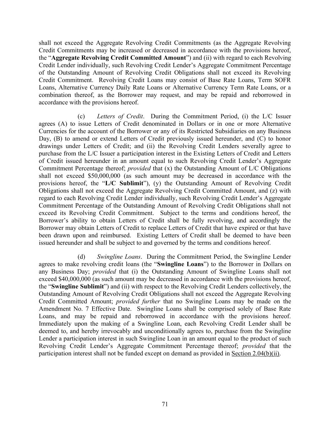 71 shall not exceed the Aggregate Revolving Credit Commitments (as the Aggregate Revolving Credit Commitments may be increased or decreased in accordance with the provisions hereof, the “Aggregate Revolving Credit Committed Amount”) and (ii) with regard to each Revolving Credit Lender individually, such Revolving Credit Lender’s Aggregate Commitment Percentage of the Outstanding Amount of Revolving Credit Obligations shall not exceed its Revolving Credit Commitment. Revolving Credit Loans may consist of Base Rate Loans, Term SOFR Loans, Alternative Currency Daily Rate Loans or Alternative Currency Term Rate Loans, or a combination thereof, as the Borrower may request, and may be repaid and reborrowed in accordance with the provisions hereof. (c) Letters of Credit. During the Commitment Period, (i) the L/C Issuer agrees (A) to issue Letters of Credit denominated in Dollars or in one or more Alternative Currencies for the account of the Borrower or any of its Restricted Subsidiaries on any Business Day, (B) to amend or extend Letters of Credit previously issued hereunder, and (C) to honor drawings under Letters of Credit; and (ii) the Revolving Credit Lenders severally agree to purchase from the L/C Issuer a participation interest in the Existing Letters of Credit and Letters of Credit issued hereunder in an amount equal to such Revolving Credit Lender’s Aggregate Commitment Percentage thereof; provided that (x) the Outstanding Amount of L/C Obligations shall not exceed $50,000,000 (as such amount may be decreased in accordance with the provisions hereof, the “L/C Sublimit”), (y) the Outstanding Amount of Revolving Credit Obligations shall not exceed the Aggregate Revolving Credit Committed Amount, and (z) with regard to each Revolving Credit Lender individually, such Revolving Credit Lender’s Aggregate Commitment Percentage of the Outstanding Amount of Revolving Credit Obligations shall not exceed its Revolving Credit Commitment. Subject to the terms and conditions hereof, the Borrower’s ability to obtain Letters of Credit shall be fully revolving, and accordingly the Borrower may obtain Letters of Credit to replace Letters of Credit that have expired or that have been drawn upon and reimbursed. Existing Letters of Credit shall be deemed to have been issued hereunder and shall be subject to and governed by the terms and conditions hereof. (d) Swingline Loans. During the Commitment Period, the Swingline Lender agrees to make revolving credit loans (the “Swingline Loans”) to the Borrower in Dollars on any Business Day; provided that (i) the Outstanding Amount of Swingline Loans shall not exceed $40,000,000 (as such amount may be decreased in accordance with the provisions hereof, the “Swingline Sublimit”) and (ii) with respect to the Revolving Credit Lenders collectively, the Outstanding Amount of Revolving Credit Obligations shall not exceed the Aggregate Revolving Credit Committed Amount; provided further that no Swingline Loans may be made on the Amendment No. 7 Effective Date. Swingline Loans shall be comprised solely of Base Rate Loans, and may be repaid and reborrowed in accordance with the provisions hereof. Immediately upon the making of a Swingline Loan, each Revolving Credit Lender shall be deemed to, and hereby irrevocably and unconditionally agrees to, purchase from the Swingline Lender a participation interest in such Swingline Loan in an amount equal to the product of such Revolving Credit Lender’s Aggregate Commitment Percentage thereof; provided that the participation interest shall not be funded except on demand as provided in Section 2.04(b)(ii).