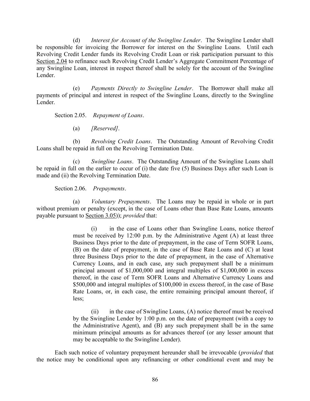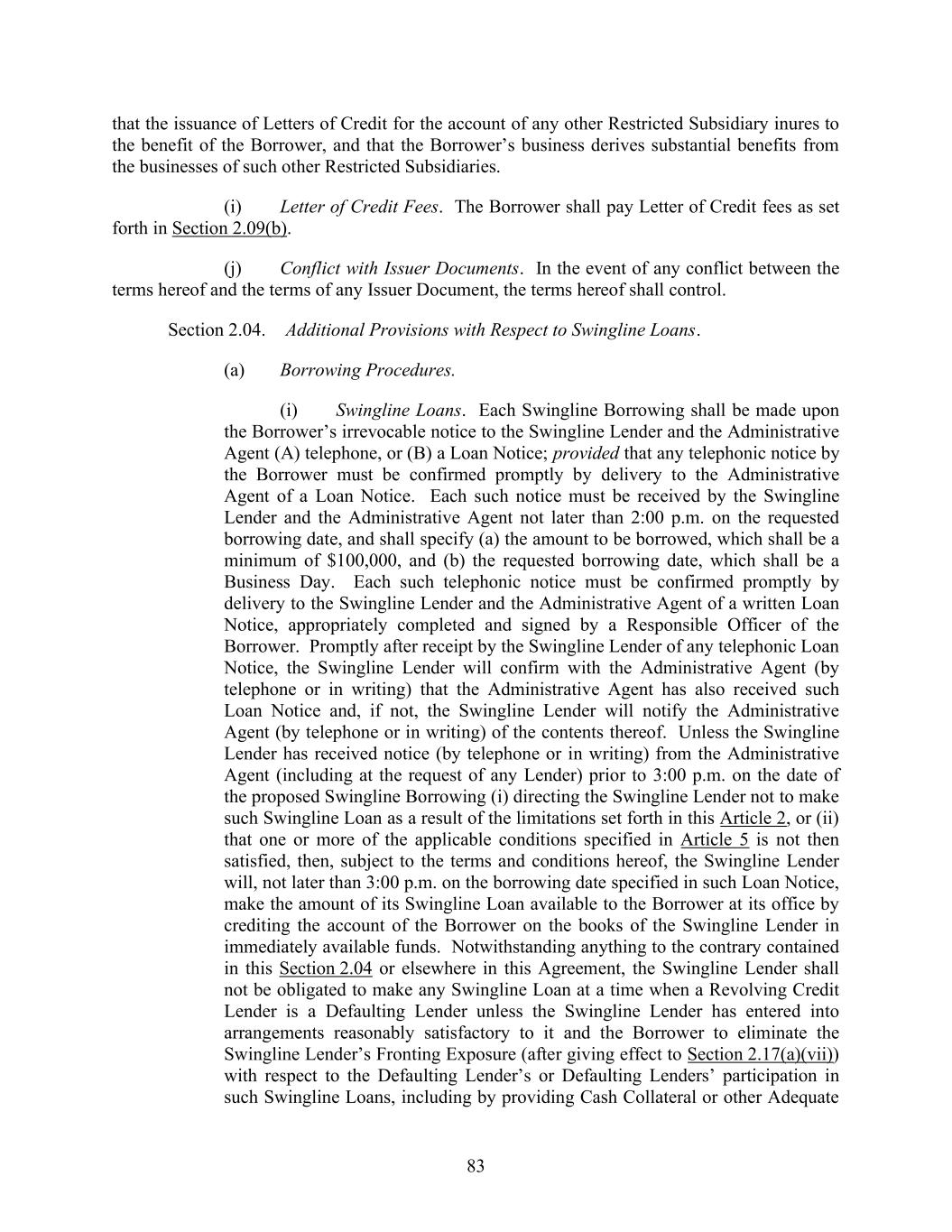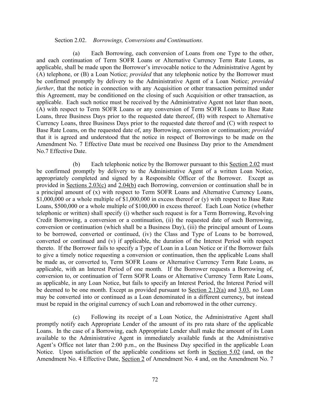 72 Section 2.02. Borrowings, Conversions and Continuations. (a) Each Borrowing, each conversion of Loans from one Type to the other, and each continuation of Term SOFR Loans or Alternative Currency Term Rate Loans, as applicable, shall be made upon the Borrower’s irrevocable notice to the Administrative Agent by (A) telephone, or (B) a Loan Notice; provided that any telephonic notice by the Borrower must be confirmed promptly by delivery to the Administrative Agent of a Loan Notice; provided further, that the notice in connection with any Acquisition or other transaction permitted under this Agreement, may be conditioned on the closing of such Acquisition or other transaction, as applicable. Each such notice must be received by the Administrative Agent not later than noon, (A) with respect to Term SOFR Loans or any conversion of Term SOFR Loans to Base Rate Loans, three Business Days prior to the requested date thereof, (B) with respect to Alternative Currency Loans, three Business Days prior to the requested date thereof and (C) with respect to Base Rate Loans, on the requested date of, any Borrowing, conversion or continuation; provided that it is agreed and understood that the notice in respect of Borrowings to be made on the Amendment No. 7 Effective Date must be received one Business Day prior to the Amendment No.7 Effective Date. (b) Each telephonic notice by the Borrower pursuant to this Section 2.02 must be confirmed promptly by delivery to the Administrative Agent of a written Loan Notice, appropriately completed and signed by a Responsible Officer of the Borrower. Except as provided in Sections 2.03(c) and 2.04(b) each Borrowing, conversion or continuation shall be in a principal amount of (x) with respect to Term SOFR Loans and Alternative Currency Loans, $1,000,000 or a whole multiple of $1,000,000 in excess thereof or (y) with respect to Base Rate Loans, $500,000 or a whole multiple of $100,000 in excess thereof. Each Loan Notice (whether telephonic or written) shall specify (i) whether such request is for a Term Borrowing, Revolving Credit Borrowing, a conversion or a continuation, (ii) the requested date of such Borrowing, conversion or continuation (which shall be a Business Day), (iii) the principal amount of Loans to be borrowed, converted or continued, (iv) the Class and Type of Loans to be borrowed, converted or continued and (v) if applicable, the duration of the Interest Period with respect thereto. If the Borrower fails to specify a Type of Loan in a Loan Notice or if the Borrower fails to give a timely notice requesting a conversion or continuation, then the applicable Loans shall be made as, or converted to, Term SOFR Loans or Alternative Currency Term Rate Loans, as applicable, with an Interest Period of one month. If the Borrower requests a Borrowing of, conversion to, or continuation of Term SOFR Loans or Alternative Currency Term Rate Loans, as applicable, in any Loan Notice, but fails to specify an Interest Period, the Interest Period will be deemed to be one month. Except as provided pursuant to Section 2.12(a) and 3.03, no Loan may be converted into or continued as a Loan denominated in a different currency, but instead must be repaid in the original currency of such Loan and reborrowed in the other currency. (c) Following its receipt of a Loan Notice, the Administrative Agent shall promptly notify each Appropriate Lender of the amount of its pro rata share of the applicable Loans. In the case of a Borrowing, each Appropriate Lender shall make the amount of its Loan available to the Administrative Agent in immediately available funds at the Administrative Agent’s Office not later than 2:00 p.m., on the Business Day specified in the applicable Loan Notice. Upon satisfaction of the applicable conditions set forth in Section 5.02 (and, on the Amendment No. 4 Effective Date, Section 2 of Amendment No. 4 and, on the Amendment No. 7