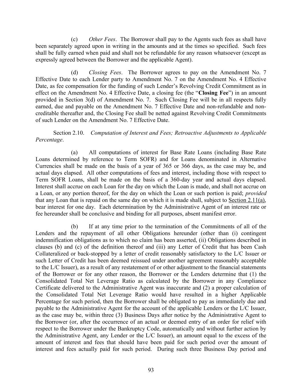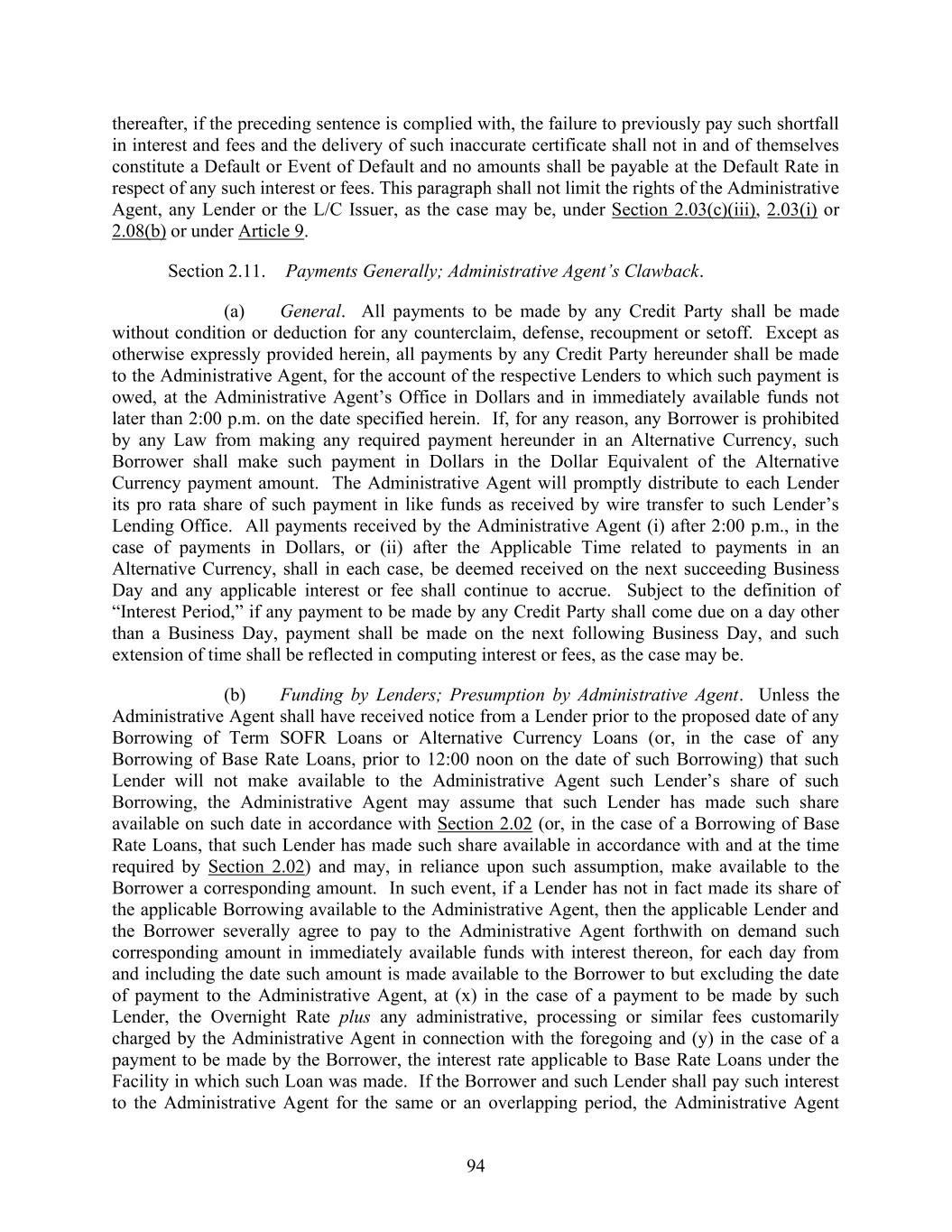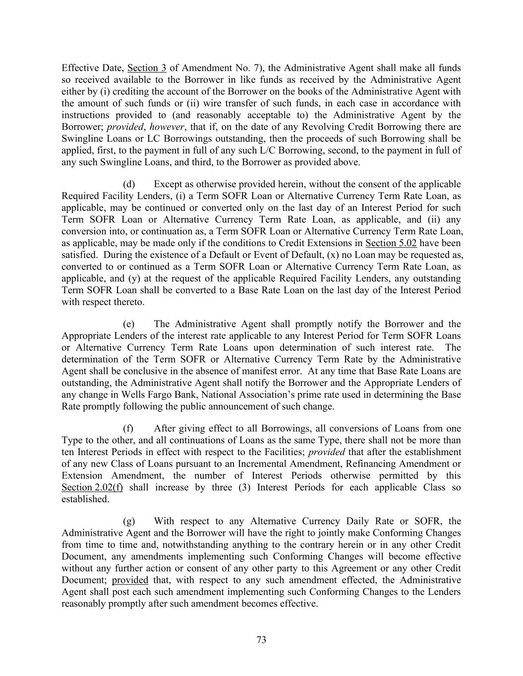 73 Effective Date, Section 3 of Amendment No. 7), the Administrative Agent shall make all funds so received available to the Borrower in like funds as received by the Administrative Agent either by (i) crediting the account of the Borrower on the books of the Administrative Agent with the amount of such funds or (ii) wire transfer of such funds, in each case in accordance with instructions provided to (and reasonably acceptable to) the Administrative Agent by the Borrower; provided, however, that if, on the date of any Revolving Credit Borrowing there are Swingline Loans or LC Borrowings outstanding, then the proceeds of such Borrowing shall be applied, first, to the payment in full of any such L/C Borrowing, second, to the payment in full of any such Swingline Loans, and third, to the Borrower as provided above. (d) Except as otherwise provided herein, without the consent of the applicable Required Facility Lenders, (i) a Term SOFR Loan or Alternative Currency Term Rate Loan, as applicable, may be continued or converted only on the last day of an Interest Period for such Term SOFR Loan or Alternative Currency Term Rate Loan, as applicable, and (ii) any conversion into, or continuation as, a Term SOFR Loan or Alternative Currency Term Rate Loan, as applicable, may be made only if the conditions to Credit Extensions in Section 5.02 have been satisfied. During the existence of a Default or Event of Default, (x) no Loan may be requested as, converted to or continued as a Term SOFR Loan or Alternative Currency Term Rate Loan, as applicable, and (y) at the request of the applicable Required Facility Lenders, any outstanding Term SOFR Loan shall be converted to a Base Rate Loan on the last day of the Interest Period with respect thereto. (e) The Administrative Agent shall promptly notify the Borrower and the Appropriate Lenders of the interest rate applicable to any Interest Period for Term SOFR Loans or Alternative Currency Term Rate Loans upon determination of such interest rate. The determination of the Term SOFR or Alternative Currency Term Rate by the Administrative Agent shall be conclusive in the absence of manifest error. At any time that Base Rate Loans are outstanding, the Administrative Agent shall notify the Borrower and the Appropriate Lenders of any change in Wells Fargo Bank, National Association’s prime rate used in determining the Base Rate promptly following the public announcement of such change. (f) After giving effect to all Borrowings, all conversions of Loans from one Type to the other, and all continuations of Loans as the same Type, there shall not be more than ten Interest Periods in effect with respect to the Facilities; provided that after the establishment of any new Class of Loans pursuant to an Incremental Amendment, Refinancing Amendment or Extension Amendment, the number of Interest Periods otherwise permitted by this Section 2.02(f) shall increase by three (3) Interest Periods for each applicable Class so established. (g) With respect to any Alternative Currency Daily Rate or SOFR, the Administrative Agent and the Borrower will have the right to jointly make Conforming Changes from time to time and, notwithstanding anything to the contrary herein or in any other Credit Document, any amendments implementing such Conforming Changes will become effective without any further action or consent of any other party to this Agreement or any other Credit Document; provided that, with respect to any such amendment effected, the Administrative Agent shall post each such amendment implementing such Conforming Changes to the Lenders reasonably promptly after such amendment becomes effective.