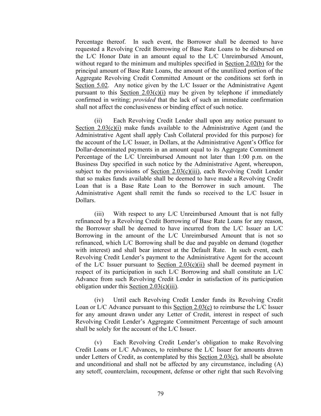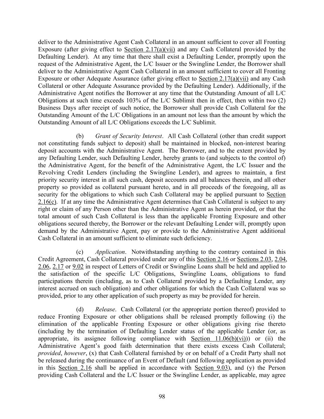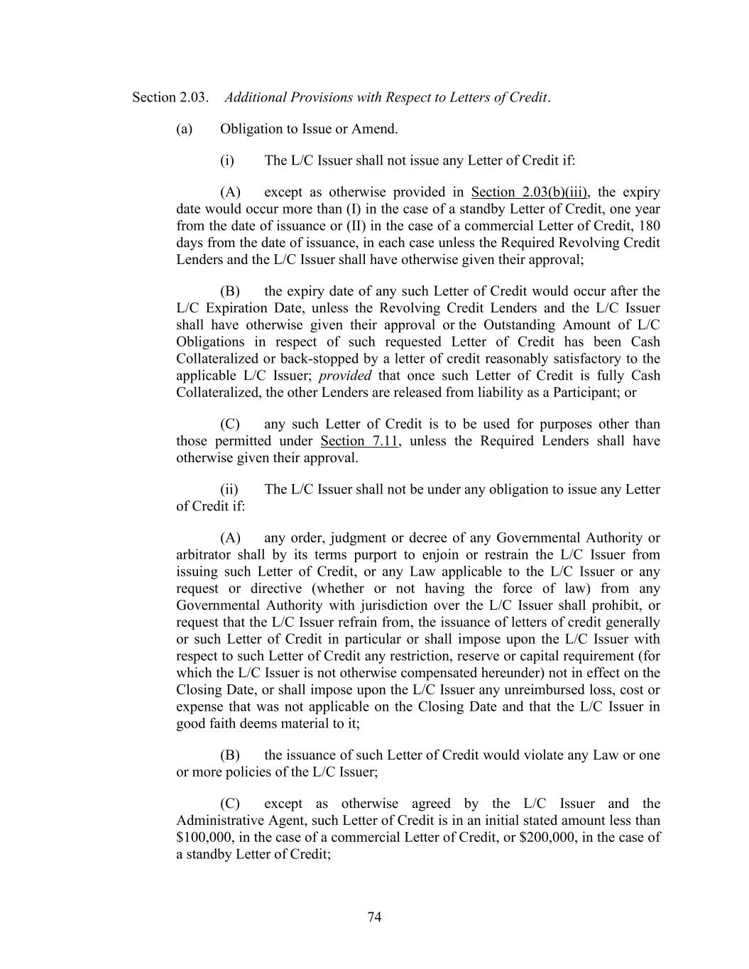 74 Section 2.03. Additional Provisions with Respect to Letters of Credit. (a) Obligation to Issue or Amend. (i) The L/C Issuer shall not issue any Letter of Credit if: (A) except as otherwise provided in Section 2.03(b)(iii), the expiry date would occur more than (I) in the case of a standby Letter of Credit, one year from the date of issuance or (II) in the case of a commercial Letter of Credit, 180 days from the date of issuance, in each case unless the Required Revolving Credit Lenders and the L/C Issuer shall have otherwise given their approval; (B) the expiry date of any such Letter of Credit would occur after the L/C Expiration Date, unless the Revolving Credit Lenders and the L/C Issuer shall have otherwise given their approval or the Outstanding Amount of L/C Obligations in respect of such requested Letter of Credit has been Cash Collateralized or back-stopped by a letter of credit reasonably satisfactory to the applicable L/C Issuer; provided that once such Letter of Credit is fully Cash Collateralized, the other Lenders are released from liability as a Participant; or (C) any such Letter of Credit is to be used for purposes other than those permitted under Section 7.11, unless the Required Lenders shall have otherwise given their approval. (ii) The L/C Issuer shall not be under any obligation to issue any Letter of Credit if: (A) any order, judgment or decree of any Governmental Authority or arbitrator shall by its terms purport to enjoin or restrain the L/C Issuer from issuing such Letter of Credit, or any Law applicable to the L/C Issuer or any request or directive (whether or not having the force of law) from any Governmental Authority with jurisdiction over the L/C Issuer shall prohibit, or request that the L/C Issuer refrain from, the issuance of letters of credit generally or such Letter of Credit in particular or shall impose upon the L/C Issuer with respect to such Letter of Credit any restriction, reserve or capital requirement (for which the L/C Issuer is not otherwise compensated hereunder) not in effect on the Closing Date, or shall impose upon the L/C Issuer any unreimbursed loss, cost or expense that was not applicable on the Closing Date and that the L/C Issuer in good faith deems material to it; (B) the issuance of such Letter of Credit would violate any Law or one or more policies of the L/C Issuer; (C) except as otherwise agreed by the L/C Issuer and the Administrative Agent, such Letter of Credit is in an initial stated amount less than $100,000, in the case of a commercial Letter of Credit, or $200,000, in the case of a standby Letter of Credit;