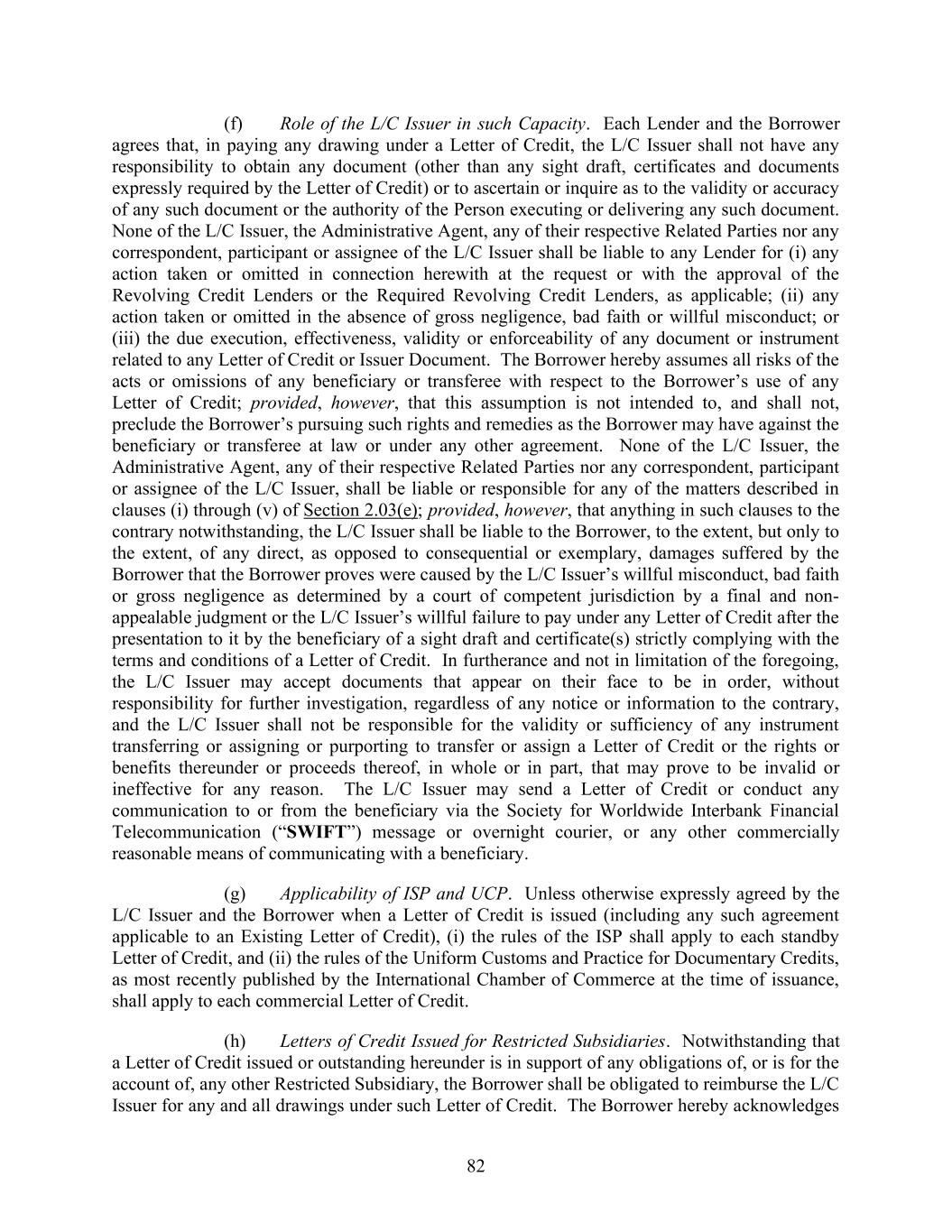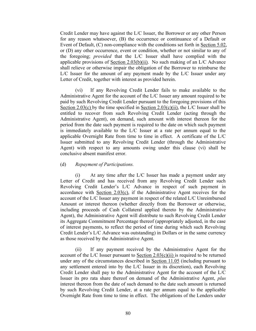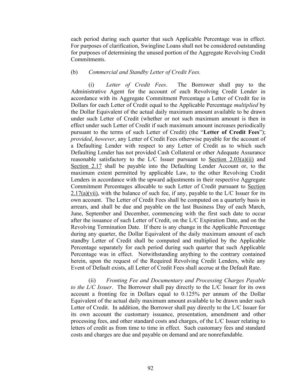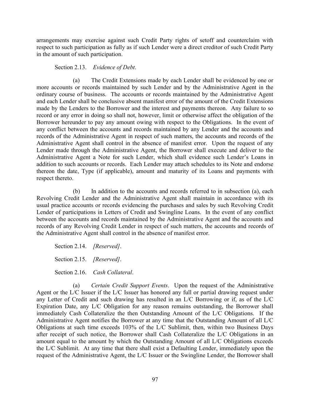 74 Section 2.03. Additional Provisions with Respect to Letters of Credit. (a) Obligation to Issue or Amend. (i) The L/C Issuer shall not issue any Letter of Credit if: (A) except as otherwise provided in Section 2.03(b)(iii), the expiry date would occur more than (I) in the case of a standby Letter of Credit, one year from the date of issuance or (II) in the case of a commercial Letter of Credit, 180 days from the date of issuance, in each case unless the Required Revolving Credit Lenders and the L/C Issuer shall have otherwise given their approval; (B) the expiry date of any such Letter of Credit would occur after the L/C Expiration Date, unless the Revolving Credit Lenders and the L/C Issuer shall have otherwise given their approval or the Outstanding Amount of L/C Obligations in respect of such requested Letter of Credit has been Cash Collateralized or back-stopped by a letter of credit reasonably satisfactory to the applicable L/C Issuer; provided that once such Letter of Credit is fully Cash Collateralized, the other Lenders are released from liability as a Participant; or (C) any such Letter of Credit is to be used for purposes other than those permitted under Section 7.11, unless the Required Lenders shall have otherwise given their approval. (ii) The L/C Issuer shall not be under any obligation to issue any Letter of Credit if: (A) any order, judgment or decree of any Governmental Authority or arbitrator shall by its terms purport to enjoin or restrain the L/C Issuer from issuing such Letter of Credit, or any Law applicable to the L/C Issuer or any request or directive (whether or not having the force of law) from any Governmental Authority with jurisdiction over the L/C Issuer shall prohibit, or request that the L/C Issuer refrain from, the issuance of letters of credit generally or such Letter of Credit in particular or shall impose upon the L/C Issuer with respect to such Letter of Credit any restriction, reserve or capital requirement (for which the L/C Issuer is not otherwise compensated hereunder) not in effect on the Closing Date, or shall impose upon the L/C Issuer any unreimbursed loss, cost or expense that was not applicable on the Closing Date and that the L/C Issuer in good faith deems material to it; (B) the issuance of such Letter of Credit would violate any Law or one or more policies of the L/C Issuer; (C) except as otherwise agreed by the L/C Issuer and the Administrative Agent, such Letter of Credit is in an initial stated amount less than $100,000, in the case of a commercial Letter of Credit, or $200,000, in the case of a standby Letter of Credit;