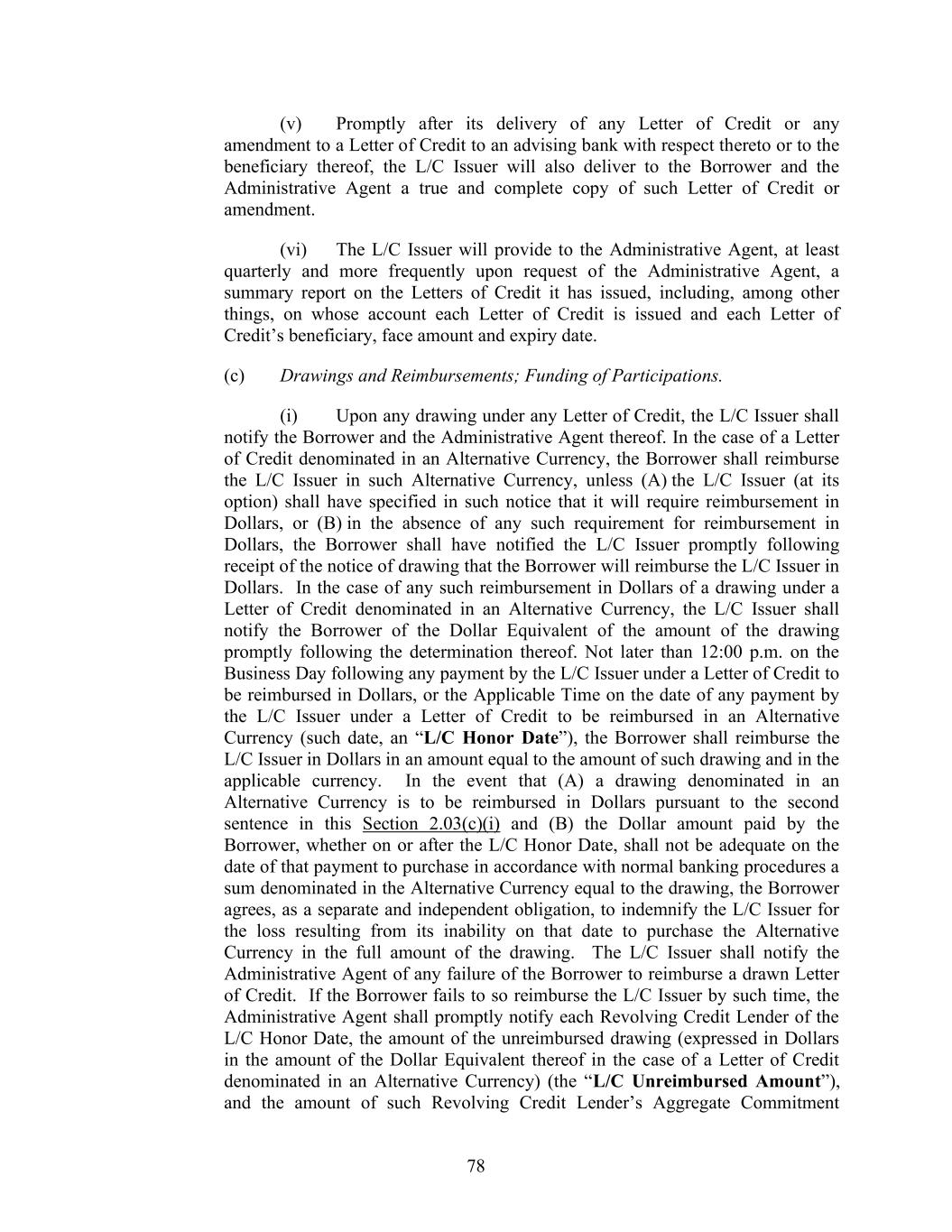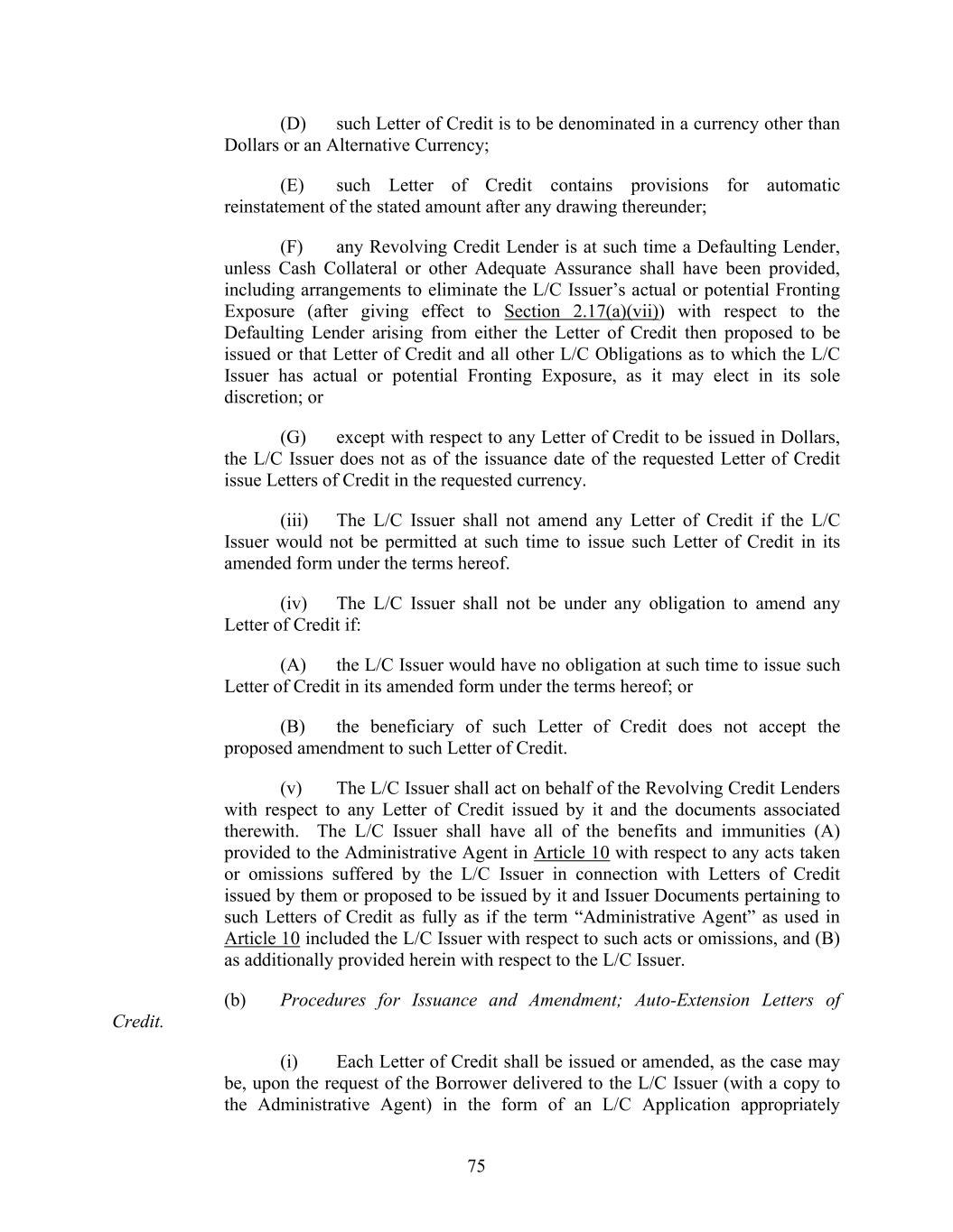 75 (D) such Letter of Credit is to be denominated in a currency other than Dollars or an Alternative Currency; (E) such Letter of Credit contains provisions for automatic reinstatement of the stated amount after any drawing thereunder; (F) any Revolving Credit Lender is at such time a Defaulting Lender, unless Cash Collateral or other Adequate Assurance shall have been provided, including arrangements to eliminate the L/C Issuer’s actual or potential Fronting Exposure (after giving effect to Section 2.17(a)(vii)) with respect to the Defaulting Lender arising from either the Letter of Credit then proposed to be issued or that Letter of Credit and all other L/C Obligations as to which the L/C Issuer has actual or potential Fronting Exposure, as it may elect in its sole discretion; or (G) except with respect to any Letter of Credit to be issued in Dollars, the L/C Issuer does not as of the issuance date of the requested Letter of Credit issue Letters of Credit in the requested currency. (iii) The L/C Issuer shall not amend any Letter of Credit if the L/C Issuer would not be permitted at such time to issue such Letter of Credit in its amended form under the terms hereof. (iv) The L/C Issuer shall not be under any obligation to amend any Letter of Credit if: (A) the L/C Issuer would have no obligation at such time to issue such Letter of Credit in its amended form under the terms hereof; or (B) the beneficiary of such Letter of Credit does not accept the proposed amendment to such Letter of Credit. (v) The L/C Issuer shall act on behalf of the Revolving Credit Lenders with respect to any Letter of Credit issued by it and the documents associated therewith. The L/C Issuer shall have all of the benefits and immunities (A) provided to the Administrative Agent in Article 10 with respect to any acts taken or omissions suffered by the L/C Issuer in connection with Letters of Credit issued by them or proposed to be issued by it and Issuer Documents pertaining to such Letters of Credit as fully as if the term “Administrative Agent” as used in Article 10 included the L/C Issuer with respect to such acts or omissions, and (B) as additionally provided herein with respect to the L/C Issuer. (b) Procedures for Issuance and Amendment; Auto-Extension Letters of Credit. (i) Each Letter of Credit shall be issued or amended, as the case may be, upon the request of the Borrower delivered to the L/C Issuer (with a copy to the Administrative Agent) in the form of an L/C Application appropriately