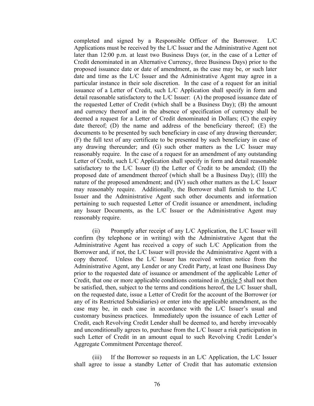 76 completed and signed by a Responsible Officer of the Borrower. L/C Applications must be received by the L/C Issuer and the Administrative Agent not later than 12:00 p.m. at least two Business Days (or, in the case of a Letter of Credit denominated in an Alternative Currency, three Business Days) prior to the proposed issuance date or date of amendment, as the case may be, or such later date and time as the L/C Issuer and the Administrative Agent may agree in a particular instance in their sole discretion. In the case of a request for an initial issuance of a Letter of Credit, such L/C Application shall specify in form and detail reasonable satisfactory to the L/C Issuer: (A) the proposed issuance date of the requested Letter of Credit (which shall be a Business Day); (B) the amount and currency thereof and in the absence of specification of currency shall be deemed a request for a Letter of Credit denominated in Dollars; (C) the expiry date thereof; (D) the name and address of the beneficiary thereof; (E) the documents to be presented by such beneficiary in case of any drawing thereunder; (F) the full text of any certificate to be presented by such beneficiary in case of any drawing thereunder; and (G) such other matters as the L/C Issuer may reasonably require. In the case of a request for an amendment of any outstanding Letter of Credit, such L/C Application shall specify in form and detail reasonable satisfactory to the L/C Issuer (I) the Letter of Credit to be amended; (II) the proposed date of amendment thereof (which shall be a Business Day); (III) the nature of the proposed amendment; and (IV) such other matters as the L/C Issuer may reasonably require. Additionally, the Borrower shall furnish to the L/C Issuer and the Administrative Agent such other documents and information pertaining to such requested Letter of Credit issuance or amendment, including any Issuer Documents, as the L/C Issuer or the Administrative Agent may reasonably require. (ii) Promptly after receipt of any L/C Application, the L/C Issuer will confirm (by telephone or in writing) with the Administrative Agent that the Administrative Agent has received a copy of such L/C Application from the Borrower and, if not, the L/C Issuer will provide the Administrative Agent with a copy thereof. Unless the L/C Issuer has received written notice from the Administrative Agent, any Lender or any Credit Party, at least one Business Day prior to the requested date of issuance or amendment of the applicable Letter of Credit, that one or more applicable conditions contained in Article 5 shall not then be satisfied, then, subject to the terms and conditions hereof, the L/C Issuer shall, on the requested date, issue a Letter of Credit for the account of the Borrower (or any of its Restricted Subsidiaries) or enter into the applicable amendment, as the case may be, in each case in accordance with the L/C Issuer’s usual and customary business practices. Immediately upon the issuance of each Letter of Credit, each Revolving Credit Lender shall be deemed to, and hereby irrevocably and unconditionally agrees to, purchase from the L/C Issuer a risk participation in such Letter of Credit in an amount equal to such Revolving Credit Lender’s Aggregate Commitment Percentage thereof. (iii) If the Borrower so requests in an L/C Application, the L/C Issuer shall agree to issue a standby Letter of Credit that has automatic extension