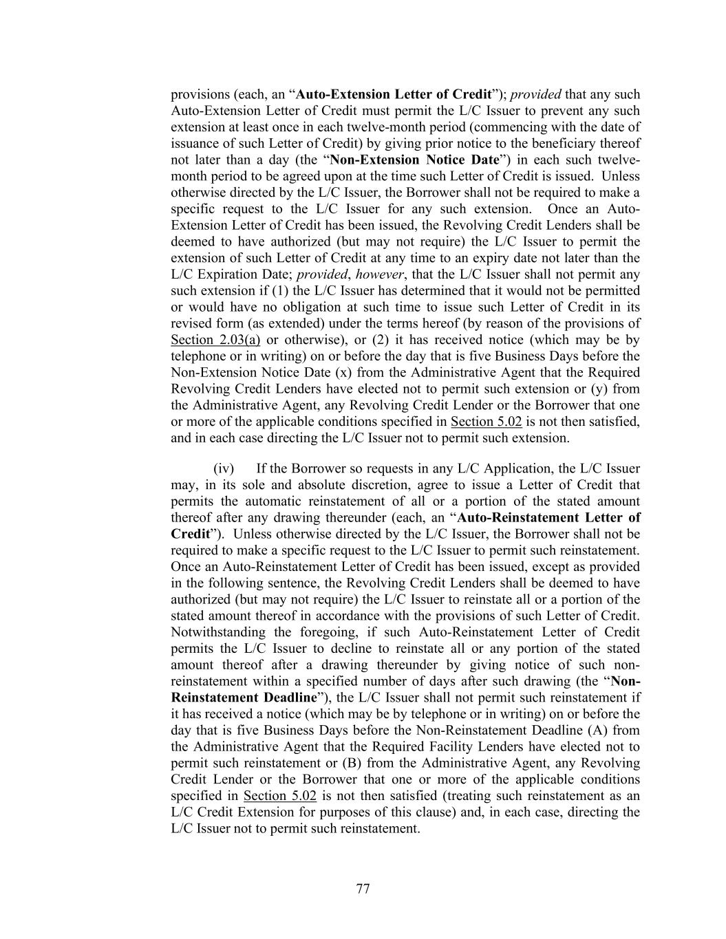 77 provisions (each, an “Auto-Extension Letter of Credit”); provided that any such Auto-Extension Letter of Credit must permit the L/C Issuer to prevent any such extension at least once in each twelve-month period (commencing with the date of issuance of such Letter of Credit) by giving prior notice to the beneficiary thereof not later than a day (the “Non-Extension Notice Date”) in each such twelve- month period to be agreed upon at the time such Letter of Credit is issued. Unless otherwise directed by the L/C Issuer, the Borrower shall not be required to make a specific request to the L/C Issuer for any such extension. Once an Auto- Extension Letter of Credit has been issued, the Revolving Credit Lenders shall be deemed to have authorized (but may not require) the L/C Issuer to permit the extension of such Letter of Credit at any time to an expiry date not later than the L/C Expiration Date; provided, however, that the L/C Issuer shall not permit any such extension if (1) the L/C Issuer has determined that it would not be permitted or would have no obligation at such time to issue such Letter of Credit in its revised form (as extended) under the terms hereof (by reason of the provisions of Section 2.03(a) or otherwise), or (2) it has received notice (which may be by telephone or in writing) on or before the day that is five Business Days before the Non-Extension Notice Date (x) from the Administrative Agent that the Required Revolving Credit Lenders have elected not to permit such extension or (y) from the Administrative Agent, any Revolving Credit Lender or the Borrower that one or more of the applicable conditions specified in Section 5.02 is not then satisfied, and in each case directing the L/C Issuer not to permit such extension. (iv) If the Borrower so requests in any L/C Application, the L/C Issuer may, in its sole and absolute discretion, agree to issue a Letter of Credit that permits the automatic reinstatement of all or a portion of the stated amount thereof after any drawing thereunder (each, an “Auto-Reinstatement Letter of Credit”). Unless otherwise directed by the L/C Issuer, the Borrower shall not be required to make a specific request to the L/C Issuer to permit such reinstatement. Once an Auto-Reinstatement Letter of Credit has been issued, except as provided in the following sentence, the Revolving Credit Lenders shall be deemed to have authorized (but may not require) the L/C Issuer to reinstate all or a portion of the stated amount thereof in accordance with the provisions of such Letter of Credit. Notwithstanding the foregoing, if such Auto-Reinstatement Letter of Credit permits the L/C Issuer to decline to reinstate all or any portion of the stated amount thereof after a drawing thereunder by giving notice of such non- reinstatement within a specified number of days after such drawing (the “Non- Reinstatement Deadline”), the L/C Issuer shall not permit such reinstatement if it has received a notice (which may be by telephone or in writing) on or before the day that is five Business Days before the Non-Reinstatement Deadline (A) from the Administrative Agent that the Required Facility Lenders have elected not to permit such reinstatement or (B) from the Administrative Agent, any Revolving Credit Lender or the Borrower that one or more of the applicable conditions specified in Section 5.02 is not then satisfied (treating such reinstatement as an L/C Credit Extension for purposes of this clause) and, in each case, directing the L/C Issuer not to permit such reinstatement.