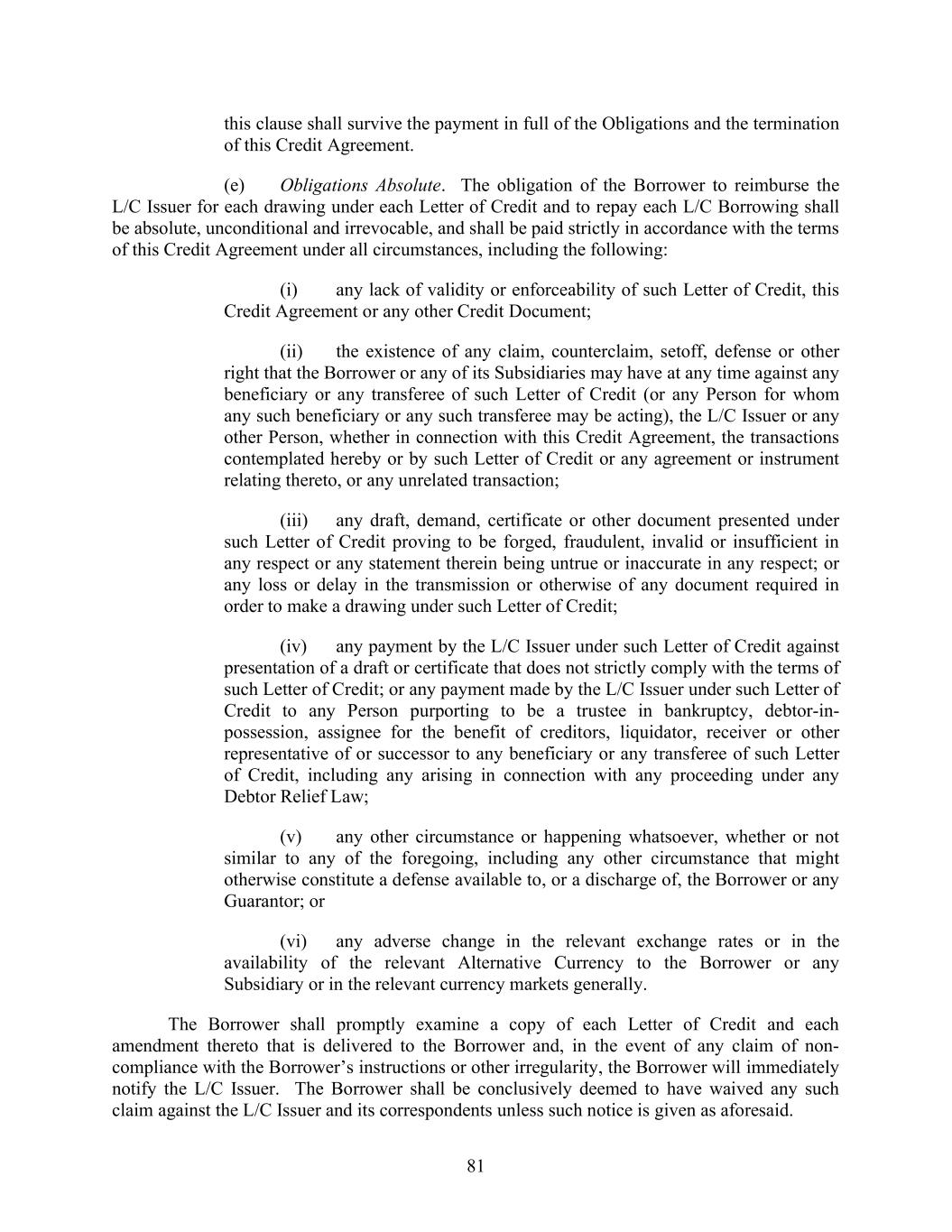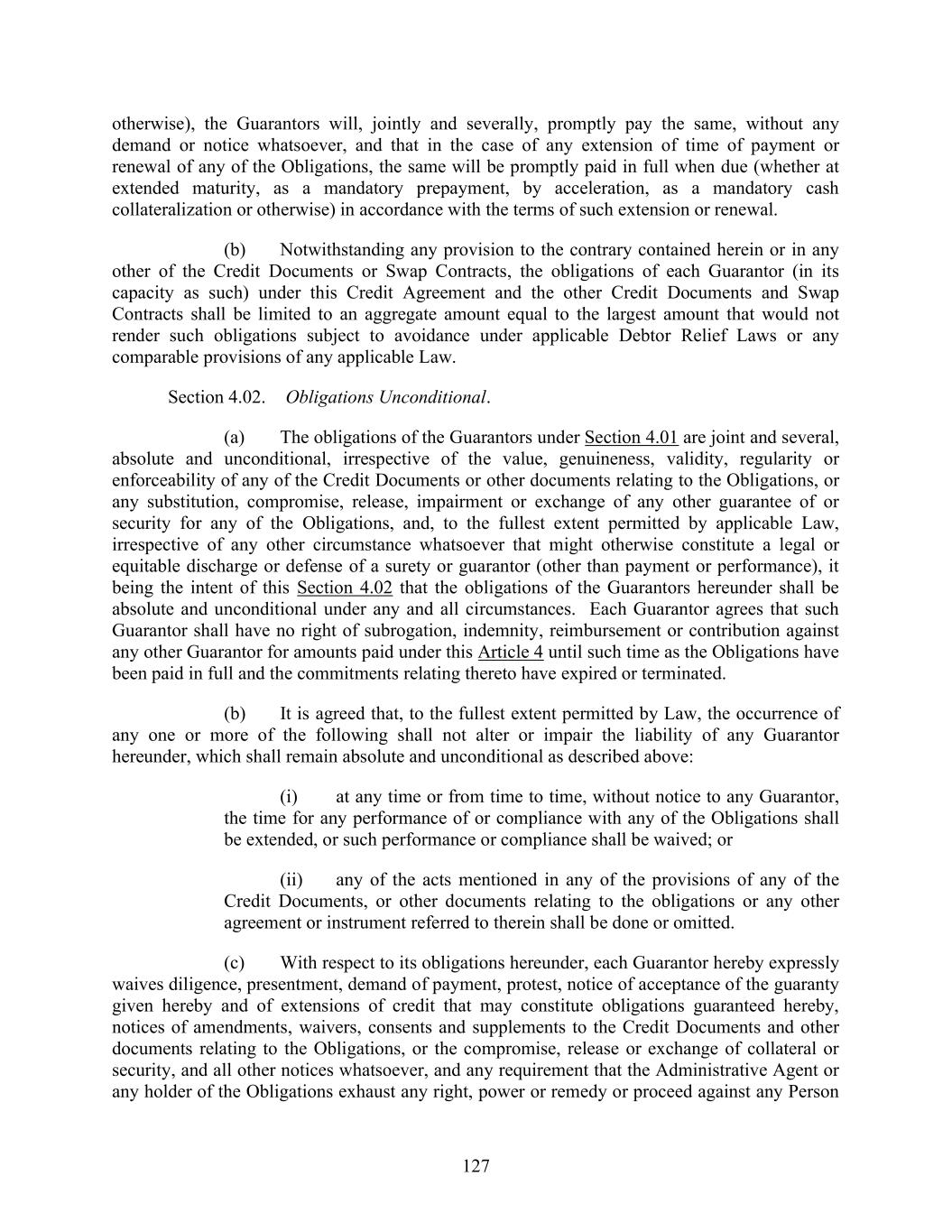 127 otherwise), the Guarantors will, jointly and severally, promptly pay the same, without any demand or notice whatsoever, and that in the case of any extension of time of payment or renewal of any of the Obligations, the same will be promptly paid in full when due (whether at extended maturity, as a mandatory prepayment, by acceleration, as a mandatory cash collateralization or otherwise) in accordance with the terms of such extension or renewal. (b) Notwithstanding any provision to the contrary contained herein or in any other of the Credit Documents or Swap Contracts, the obligations of each Guarantor (in its capacity as such) under this Credit Agreement and the other Credit Documents and Swap Contracts shall be limited to an aggregate amount equal to the largest amount that would not render such obligations subject to avoidance under applicable Debtor Relief Laws or any comparable provisions of any applicable Law. Section 4.02. Obligations Unconditional. (a) The obligations of the Guarantors under Section 4.01 are joint and several, absolute and unconditional, irrespective of the value, genuineness, validity, regularity or enforceability of any of the Credit Documents or other documents relating to the Obligations, or any substitution, compromise, release, impairment or exchange of any other guarantee of or security for any of the Obligations, and, to the fullest extent permitted by applicable Law, irrespective of any other circumstance whatsoever that might otherwise constitute a legal or equitable discharge or defense of a surety or guarantor (other than payment or performance), it being the intent of this Section 4.02 that the obligations of the Guarantors hereunder shall be absolute and unconditional under any and all circumstances. Each Guarantor agrees that such Guarantor shall have no right of subrogation, indemnity, reimbursement or contribution against any other Guarantor for amounts paid under this Article 4 until such time as the Obligations have been paid in full and the commitments relating thereto have expired or terminated. (b) It is agreed that, to the fullest extent permitted by Law, the occurrence of any one or more of the following shall not alter or impair the liability of any Guarantor hereunder, which shall remain absolute and unconditional as described above: (i) at any time or from time to time, without notice to any Guarantor, the time for any performance of or compliance with any of the Obligations shall be extended, or such performance or compliance shall be waived; or (ii) any of the acts mentioned in any of the provisions of any of the Credit Documents, or other documents relating to the obligations or any other agreement or instrument referred to therein shall be done or omitted. (c) With respect to its obligations hereunder, each Guarantor hereby expressly waives diligence, presentment, demand of payment, protest, notice of acceptance of the guaranty given hereby and of extensions of credit that may constitute obligations guaranteed hereby, notices of amendments, waivers, consents and supplements to the Credit Documents and other documents relating to the Obligations, or the compromise, release or exchange of collateral or security, and all other notices whatsoever, and any requirement that the Administrative Agent or any holder of the Obligations exhaust any right, power or remedy or proceed against any Person