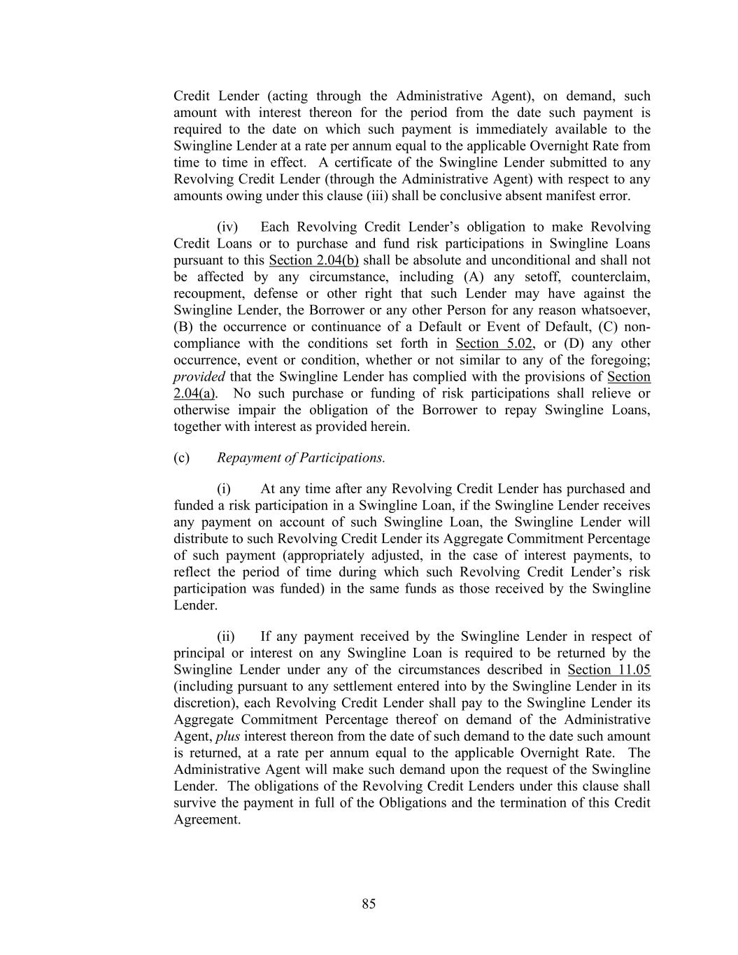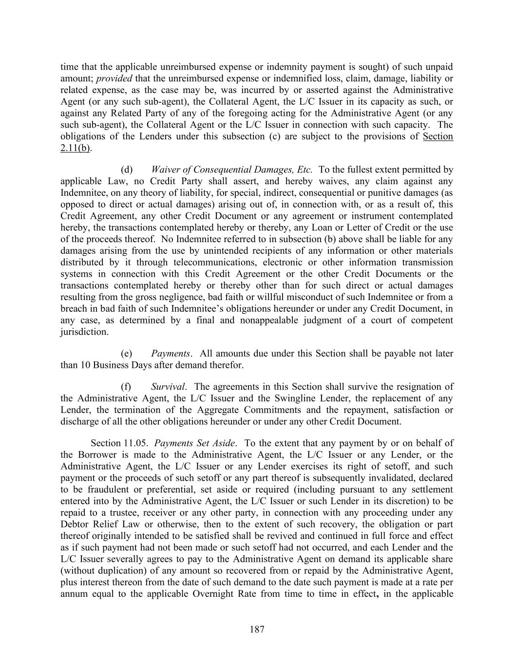 187 time that the applicable unreimbursed expense or indemnity payment is sought) of such unpaid amount; provided that the unreimbursed expense or indemnified loss, claim, damage, liability or related expense, as the case may be, was incurred by or asserted against the Administrative Agent (or any such sub-agent), the Collateral Agent, the L/C Issuer in its capacity as such, or against any Related Party of any of the foregoing acting for the Administrative Agent (or any such sub-agent), the Collateral Agent or the L/C Issuer in connection with such capacity. The obligations of the Lenders under this subsection (c) are subject to the provisions of Section 2.11(b). (d) Waiver of Consequential Damages, Etc. To the fullest extent permitted by applicable Law, no Credit Party shall assert, and hereby waives, any claim against any Indemnitee, on any theory of liability, for special, indirect, consequential or punitive damages (as opposed to direct or actual damages) arising out of, in connection with, or as a result of, this Credit Agreement, any other Credit Document or any agreement or instrument contemplated hereby, the transactions contemplated hereby or thereby, any Loan or Letter of Credit or the use of the proceeds thereof. No Indemnitee referred to in subsection (b) above shall be liable for any damages arising from the use by unintended recipients of any information or other materials distributed by it through telecommunications, electronic or other information transmission systems in connection with this Credit Agreement or the other Credit Documents or the transactions contemplated hereby or thereby other than for such direct or actual damages resulting from the gross negligence, bad faith or willful misconduct of such Indemnitee or from a breach in bad faith of such Indemnitee’s obligations hereunder or under any Credit Document, in any case, as determined by a final and nonappealable judgment of a court of competent jurisdiction. (e) Payments. All amounts due under this Section shall be payable not later than 10 Business Days after demand therefor. (f) Survival. The agreements in this Section shall survive the resignation of the Administrative Agent, the L/C Issuer and the Swingline Lender, the replacement of any Lender, the termination of the Aggregate Commitments and the repayment, satisfaction or discharge of all the other obligations hereunder or under any other Credit Document. Section 11.05. Payments Set Aside. To the extent that any payment by or on behalf of the Borrower is made to the Administrative Agent, the L/C Issuer or any Lender, or the Administrative Agent, the L/C Issuer or any Lender exercises its right of setoff, and such payment or the proceeds of such setoff or any part thereof is subsequently invalidated, declared to be fraudulent or preferential, set aside or required (including pursuant to any settlement entered into by the Administrative Agent, the L/C Issuer or such Lender in its discretion) to be repaid to a trustee, receiver or any other party, in connection with any proceeding under any Debtor Relief Law or otherwise, then to the extent of such recovery, the obligation or part thereof originally intended to be satisfied shall be revived and continued in full force and effect as if such payment had not been made or such setoff had not occurred, and each Lender and the L/C Issuer severally agrees to pay to the Administrative Agent on demand its applicable share (without duplication) of any amount so recovered from or repaid by the Administrative Agent, plus interest thereon from the date of such demand to the date such payment is made at a rate per annum equal to the applicable Overnight Rate from time to time in effect, in the applicable