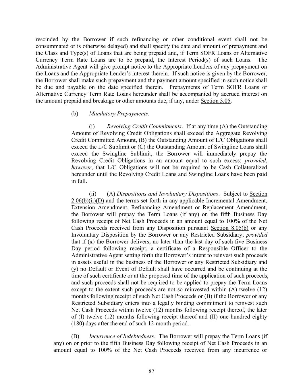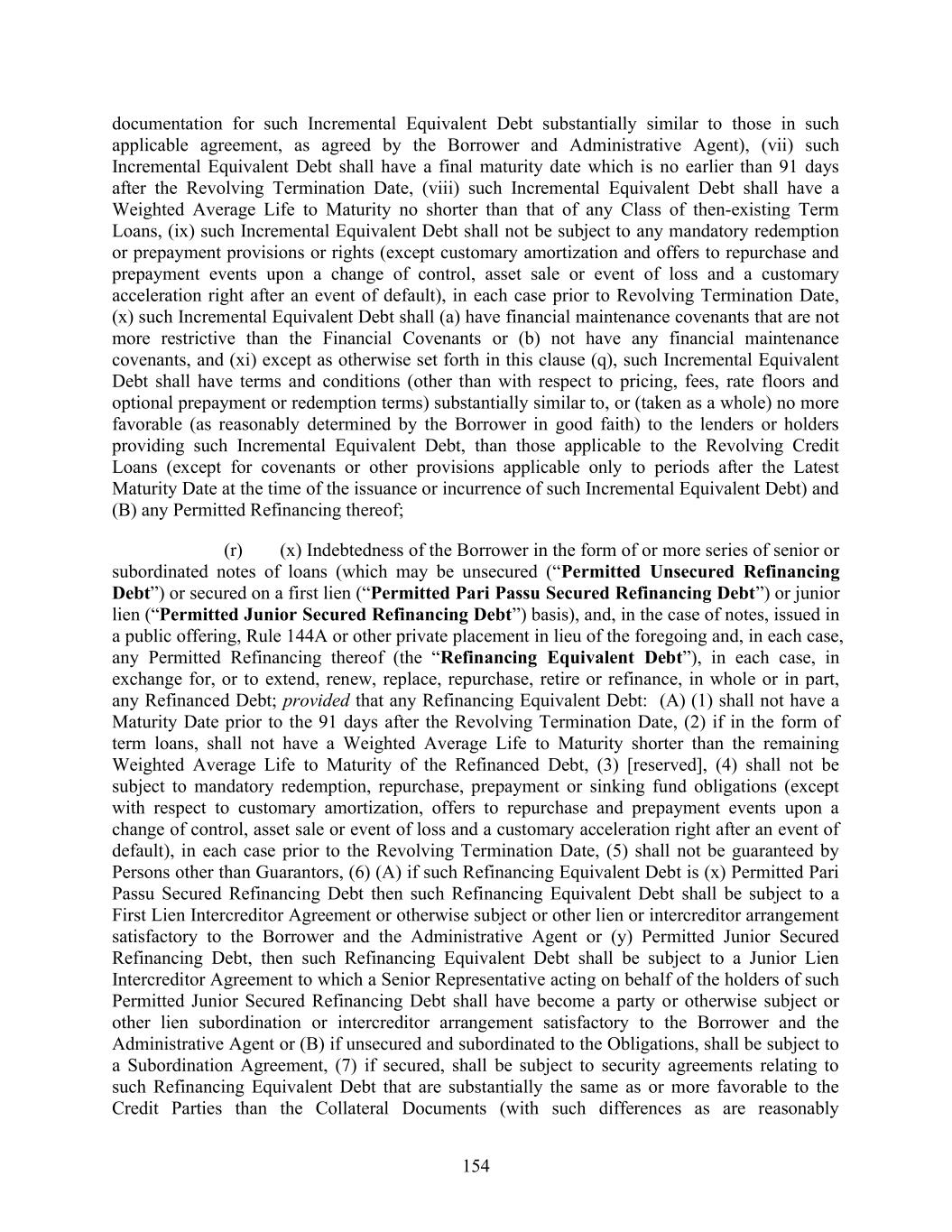 154 documentation for such Incremental Equivalent Debt substantially similar to those in such applicable agreement, as agreed by the Borrower and Administrative Agent), (vii) such Incremental Equivalent Debt shall have a final maturity date which is no earlier than 91 days after the Revolving Termination Date, (viii) such Incremental Equivalent Debt shall have a Weighted Average Life to Maturity no shorter than that of any Class of then-existing Term Loans, (ix) such Incremental Equivalent Debt shall not be subject to any mandatory redemption or prepayment provisions or rights (except customary amortization and offers to repurchase and prepayment events upon a change of control, asset sale or event of loss and a customary acceleration right after an event of default), in each case prior to Revolving Termination Date, (x) such Incremental Equivalent Debt shall (a) have financial maintenance covenants that are not more restrictive than the Financial Covenants or (b) not have any financial maintenance covenants, and (xi) except as otherwise set forth in this clause (q), such Incremental Equivalent Debt shall have terms and conditions (other than with respect to pricing, fees, rate floors and optional prepayment or redemption terms) substantially similar to, or (taken as a whole) no more favorable (as reasonably determined by the Borrower in good faith) to the lenders or holders providing such Incremental Equivalent Debt, than those applicable to the Revolving Credit Loans (except for covenants or other provisions applicable only to periods after the Latest Maturity Date at the time of the issuance or incurrence of such Incremental Equivalent Debt) and (B) any Permitted Refinancing thereof; (r) (x) Indebtedness of the Borrower in the form of or more series of senior or subordinated notes of loans (which may be unsecured (“Permitted Unsecured Refinancing Debt”) or secured on a first lien (“Permitted Pari Passu Secured Refinancing Debt”) or junior lien (“Permitted Junior Secured Refinancing Debt”) basis), and, in the case of notes, issued in a public offering, Rule 144A or other private placement in lieu of the foregoing and, in each case, any Permitted Refinancing thereof (the “Refinancing Equivalent Debt”), in each case, in exchange for, or to extend, renew, replace, repurchase, retire or refinance, in whole or in part, any Refinanced Debt; provided that any Refinancing Equivalent Debt: (A) (1) shall not have a Maturity Date prior to the 91 days after the Revolving Termination Date, (2) if in the form of term loans, shall not have a Weighted Average Life to Maturity shorter than the remaining Weighted Average Life to Maturity of the Refinanced Debt, (3) [reserved], (4) shall not be subject to mandatory redemption, repurchase, prepayment or sinking fund obligations (except with respect to customary amortization, offers to repurchase and prepayment events upon a change of control, asset sale or event of loss and a customary acceleration right after an event of default), in each case prior to the Revolving Termination Date, (5) shall not be guaranteed by Persons other than Guarantors, (6) (A) if such Refinancing Equivalent Debt is (x) Permitted Pari Passu Secured Refinancing Debt then such Refinancing Equivalent Debt shall be subject to a First Lien Intercreditor Agreement or otherwise subject or other lien or intercreditor arrangement satisfactory to the Borrower and the Administrative Agent or (y) Permitted Junior Secured Refinancing Debt, then such Refinancing Equivalent Debt shall be subject to a Junior Lien Intercreditor Agreement to which a Senior Representative acting on behalf of the holders of such Permitted Junior Secured Refinancing Debt shall have become a party or otherwise subject or other lien subordination or intercreditor arrangement satisfactory to the Borrower and the Administrative Agent or (B) if unsecured and subordinated to the Obligations, shall be subject to a Subordination Agreement, (7) if secured, shall be subject to security agreements relating to such Refinancing Equivalent Debt that are substantially the same as or more favorable to the Credit Parties than the Collateral Documents (with such differences as are reasonably