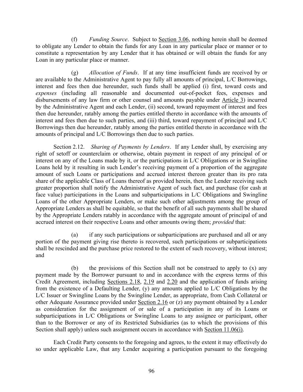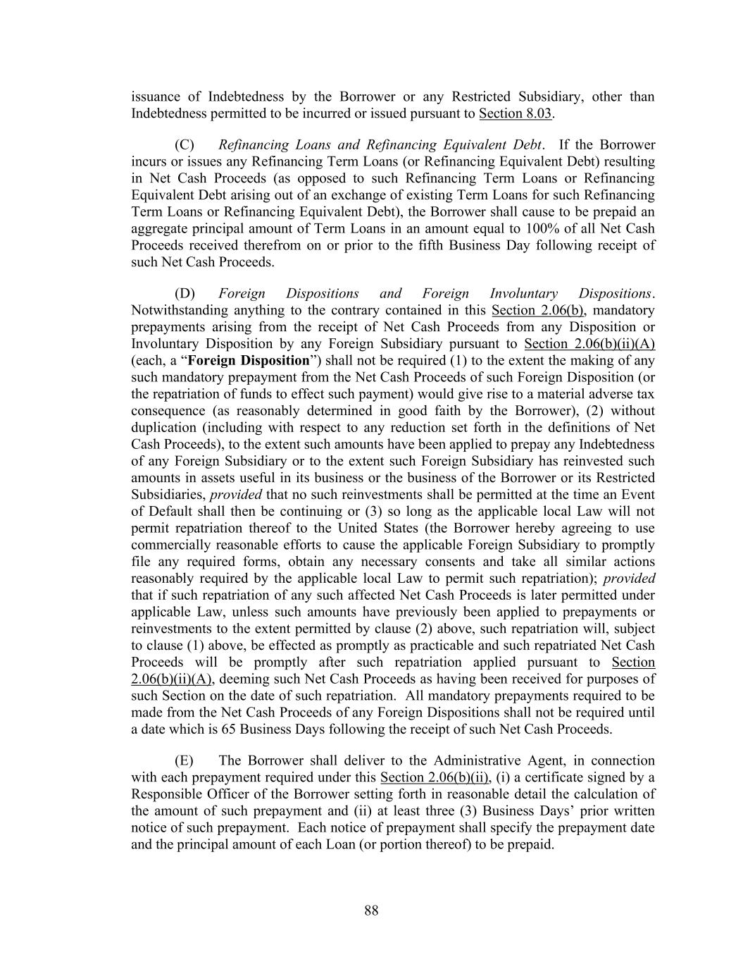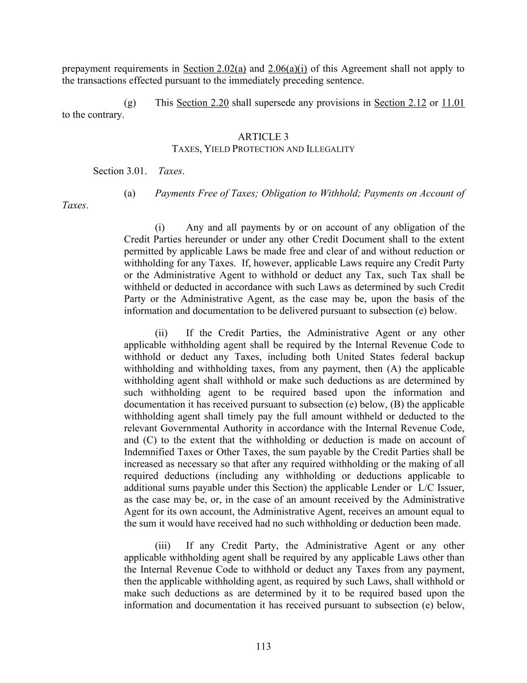 113 prepayment requirements in Section 2.02(a) and 2.06(a)(i) of this Agreement shall not apply to the transactions effected pursuant to the immediately preceding sentence. (g) This Section 2.20 shall supersede any provisions in Section 2.12 or 11.01 to the contrary. ARTICLE 3 TAXES, YIELD PROTECTION AND ILLEGALITY Section 3.01. Taxes. (a) Payments Free of Taxes; Obligation to Withhold; Payments on Account of Taxes. (i) Any and all payments by or on account of any obligation of the Credit Parties hereunder or under any other Credit Document shall to the extent permitted by applicable Laws be made free and clear of and without reduction or withholding for any Taxes. If, however, applicable Laws require any Credit Party or the Administrative Agent to withhold or deduct any Tax, such Tax shall be withheld or deducted in accordance with such Laws as determined by such Credit Party or the Administrative Agent, as the case may be, upon the basis of the information and documentation to be delivered pursuant to subsection (e) below. (ii) If the Credit Parties, the Administrative Agent or any other applicable withholding agent shall be required by the Internal Revenue Code to withhold or deduct any Taxes, including both United States federal backup withholding and withholding taxes, from any payment, then (A) the applicable withholding agent shall withhold or make such deductions as are determined by such withholding agent to be required based upon the information and documentation it has received pursuant to subsection (e) below, (B) the applicable withholding agent shall timely pay the full amount withheld or deducted to the relevant Governmental Authority in accordance with the Internal Revenue Code, and (C) to the extent that the withholding or deduction is made on account of Indemnified Taxes or Other Taxes, the sum payable by the Credit Parties shall be increased as necessary so that after any required withholding or the making of all required deductions (including any withholding or deductions applicable to additional sums payable under this Section) the applicable Lender or L/C Issuer, as the case may be, or, in the case of an amount received by the Administrative Agent for its own account, the Administrative Agent, receives an amount equal to the sum it would have received had no such withholding or deduction been made. (iii) If any Credit Party, the Administrative Agent or any other applicable withholding agent shall be required by any applicable Laws other than the Internal Revenue Code to withhold or deduct any Taxes from any payment, then the applicable withholding agent, as required by such Laws, shall withhold or make such deductions as are determined by it to be required based upon the information and documentation it has received pursuant to subsection (e) below,