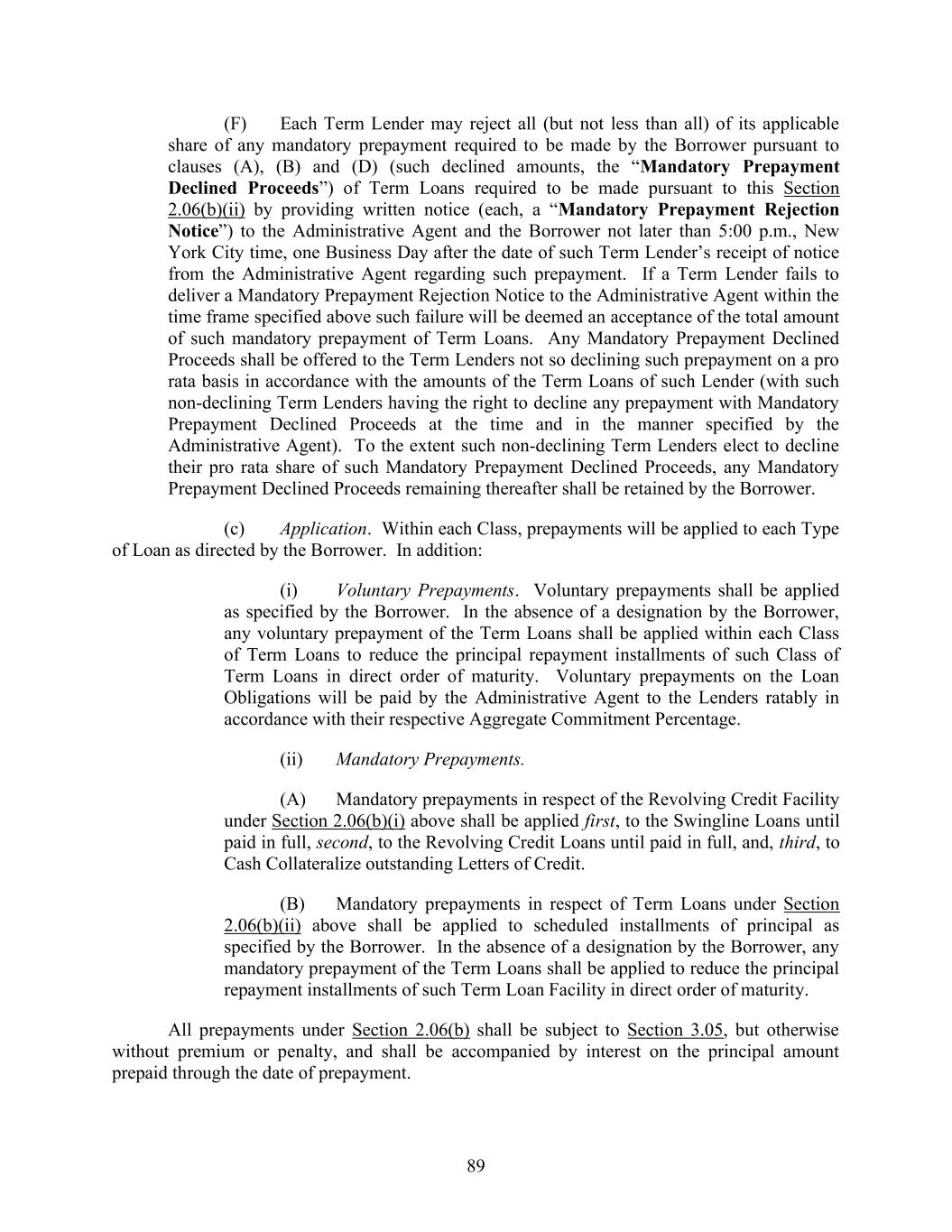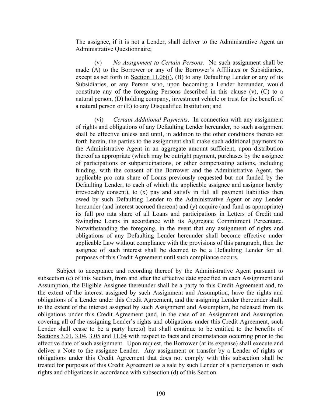 190 The assignee, if it is not a Lender, shall deliver to the Administrative Agent an Administrative Questionnaire; (v) No Assignment to Certain Persons. No such assignment shall be made (A) to the Borrower or any of the Borrower’s Affiliates or Subsidiaries, except as set forth in Section 11.06(i), (B) to any Defaulting Lender or any of its Subsidiaries, or any Person who, upon becoming a Lender hereunder, would constitute any of the foregoing Persons described in this clause (v), (C) to a natural person, (D) holding company, investment vehicle or trust for the benefit of a natural person or (E) to any Disqualified Institution; and (vi) Certain Additional Payments. In connection with any assignment of rights and obligations of any Defaulting Lender hereunder, no such assignment shall be effective unless and until, in addition to the other conditions thereto set forth herein, the parties to the assignment shall make such additional payments to the Administrative Agent in an aggregate amount sufficient, upon distribution thereof as appropriate (which may be outright payment, purchases by the assignee of participations or subparticipations, or other compensating actions, including funding, with the consent of the Borrower and the Administrative Agent, the applicable pro rata share of Loans previously requested but not funded by the Defaulting Lender, to each of which the applicable assignee and assignor hereby irrevocably consent), to (x) pay and satisfy in full all payment liabilities then owed by such Defaulting Lender to the Administrative Agent or any Lender hereunder (and interest accrued thereon) and (y) acquire (and fund as appropriate) its full pro rata share of all Loans and participations in Letters of Credit and Swingline Loans in accordance with its Aggregate Commitment Percentage. Notwithstanding the foregoing, in the event that any assignment of rights and obligations of any Defaulting Lender hereunder shall become effective under applicable Law without compliance with the provisions of this paragraph, then the assignee of such interest shall be deemed to be a Defaulting Lender for all purposes of this Credit Agreement until such compliance occurs. Subject to acceptance and recording thereof by the Administrative Agent pursuant to subsection (c) of this Section, from and after the effective date specified in each Assignment and Assumption, the Eligible Assignee thereunder shall be a party to this Credit Agreement and, to the extent of the interest assigned by such Assignment and Assumption, have the rights and obligations of a Lender under this Credit Agreement, and the assigning Lender thereunder shall, to the extent of the interest assigned by such Assignment and Assumption, be released from its obligations under this Credit Agreement (and, in the case of an Assignment and Assumption covering all of the assigning Lender’s rights and obligations under this Credit Agreement, such Lender shall cease to be a party hereto) but shall continue to be entitled to the benefits of Sections 3.01, 3.04, 3.05 and 11.04 with respect to facts and circumstances occurring prior to the effective date of such assignment. Upon request, the Borrower (at its expense) shall execute and deliver a Note to the assignee Lender. Any assignment or transfer by a Lender of rights or obligations under this Credit Agreement that does not comply with this subsection shall be treated for purposes of this Credit Agreement as a sale by such Lender of a participation in such rights and obligations in accordance with subsection (d) of this Section.