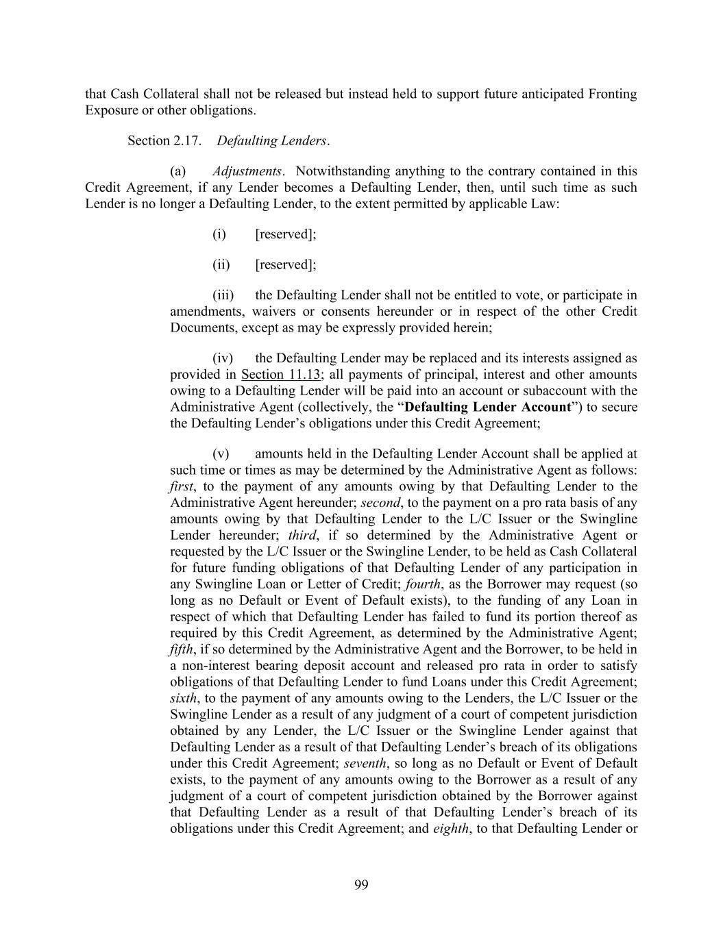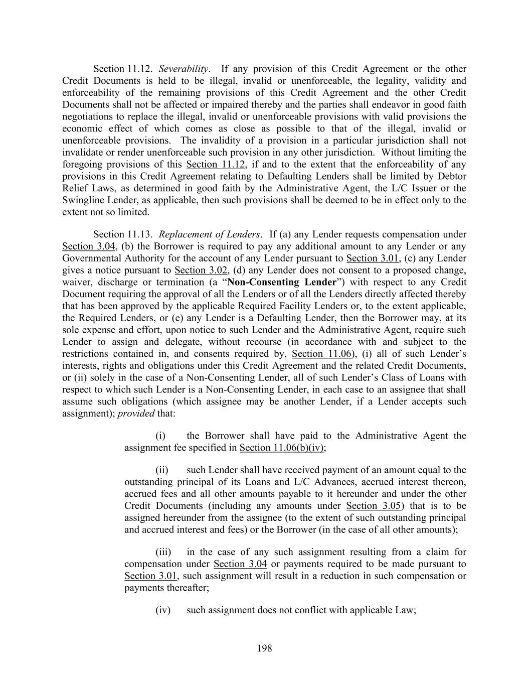 198 Section 11.12. Severability. If any provision of this Credit Agreement or the other Credit Documents is held to be illegal, invalid or unenforceable, the legality, validity and enforceability of the remaining provisions of this Credit Agreement and the other Credit Documents shall not be affected or impaired thereby and the parties shall endeavor in good faith negotiations to replace the illegal, invalid or unenforceable provisions with valid provisions the economic effect of which comes as close as possible to that of the illegal, invalid or unenforceable provisions. The invalidity of a provision in a particular jurisdiction shall not invalidate or render unenforceable such provision in any other jurisdiction. Without limiting the foregoing provisions of this Section 11.12, if and to the extent that the enforceability of any provisions in this Credit Agreement relating to Defaulting Lenders shall be limited by Debtor Relief Laws, as determined in good faith by the Administrative Agent, the L/C Issuer or the Swingline Lender, as applicable, then such provisions shall be deemed to be in effect only to the extent not so limited. Section 11.13. Replacement of Lenders. If (a) any Lender requests compensation under Section 3.04, (b) the Borrower is required to pay any additional amount to any Lender or any Governmental Authority for the account of any Lender pursuant to Section 3.01, (c) any Lender gives a notice pursuant to Section 3.02, (d) any Lender does not consent to a proposed change, waiver, discharge or termination (a “Non-Consenting Lender”) with respect to any Credit Document requiring the approval of all the Lenders or of all the Lenders directly affected thereby that has been approved by the applicable Required Facility Lenders or, to the extent applicable, the Required Lenders, or (e) any Lender is a Defaulting Lender, then the Borrower may, at its sole expense and effort, upon notice to such Lender and the Administrative Agent, require such Lender to assign and delegate, without recourse (in accordance with and subject to the restrictions contained in, and consents required by, Section 11.06), (i) all of such Lender’s interests, rights and obligations under this Credit Agreement and the related Credit Documents, or (ii) solely in the case of a Non-Consenting Lender, all of such Lender’s Class of Loans with respect to which such Lender is a Non-Consenting Lender, in each case to an assignee that shall assume such obligations (which assignee may be another Lender, if a Lender accepts such assignment); provided that: (i) the Borrower shall have paid to the Administrative Agent the assignment fee specified in Section 11.06(b)(iv); (ii) such Lender shall have received payment of an amount equal to the outstanding principal of its Loans and L/C Advances, accrued interest thereon, accrued fees and all other amounts payable to it hereunder and under the other Credit Documents (including any amounts under Section 3.05) that is to be assigned hereunder from the assignee (to the extent of such outstanding principal and accrued interest and fees) or the Borrower (in the case of all other amounts); (iii) in the case of any such assignment resulting from a claim for compensation under Section 3.04 or payments required to be made pursuant to Section 3.01, such assignment will result in a reduction in such compensation or payments thereafter; (iv) such assignment does not conflict with applicable Law;