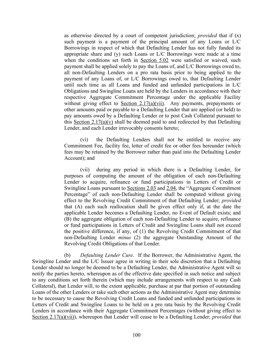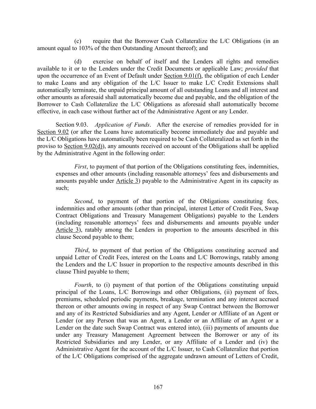 167 (c) require that the Borrower Cash Collateralize the L/C Obligations (in an amount equal to 103% of the then Outstanding Amount thereof); and (d) exercise on behalf of itself and the Lenders all rights and remedies available to it or to the Lenders under the Credit Documents or applicable Law; provided that upon the occurrence of an Event of Default under Section 9.01(f), the obligation of each Lender to make Loans and any obligation of the L/C Issuer to make L/C Credit Extensions shall automatically terminate, the unpaid principal amount of all outstanding Loans and all interest and other amounts as aforesaid shall automatically become due and payable, and the obligation of the Borrower to Cash Collateralize the L/C Obligations as aforesaid shall automatically become effective, in each case without further act of the Administrative Agent or any Lender. Section 9.03. Application of Funds. After the exercise of remedies provided for in Section 9.02 (or after the Loans have automatically become immediately due and payable and the L/C Obligations have automatically been required to be Cash Collateralized as set forth in the proviso to Section 9.02(d)), any amounts received on account of the Obligations shall be applied by the Administrative Agent in the following order: First, to payment of that portion of the Obligations constituting fees, indemnities, expenses and other amounts (including reasonable attorneys’ fees and disbursements and amounts payable under Article 3) payable to the Administrative Agent in its capacity as such; Second, to payment of that portion of the Obligations constituting fees, indemnities and other amounts (other than principal, interest Letter of Credit Fees, Swap Contract Obligations and Treasury Management Obligations) payable to the Lenders (including reasonable attorneys’ fees and disbursements and amounts payable under Article 3), ratably among the Lenders in proportion to the amounts described in this clause Second payable to them; Third, to payment of that portion of the Obligations constituting accrued and unpaid Letter of Credit Fees, interest on the Loans and L/C Borrowings, ratably among the Lenders and the L/C Issuer in proportion to the respective amounts described in this clause Third payable to them; Fourth, to (i) payment of that portion of the Obligations constituting unpaid principal of the Loans, L/C Borrowings and other Obligations, (ii) payment of fees, premiums, scheduled periodic payments, breakage, termination and any interest accrued thereon or other amounts owing in respect of any Swap Contract between the Borrower and any of its Restricted Subsidiaries and any Agent, Lender or Affiliate of an Agent or Lender (or any Person that was an Agent, a Lender or an Affiliate of an Agent or a Lender on the date such Swap Contract was entered into), (iii) payments of amounts due under any Treasury Management Agreement between the Borrower or any of its Restricted Subsidiaries and any Lender, or any Affiliate of a Lender and (iv) the Administrative Agent for the account of the L/C Issuer, to Cash Collateralize that portion of the L/C Obligations comprised of the aggregate undrawn amount of Letters of Credit,