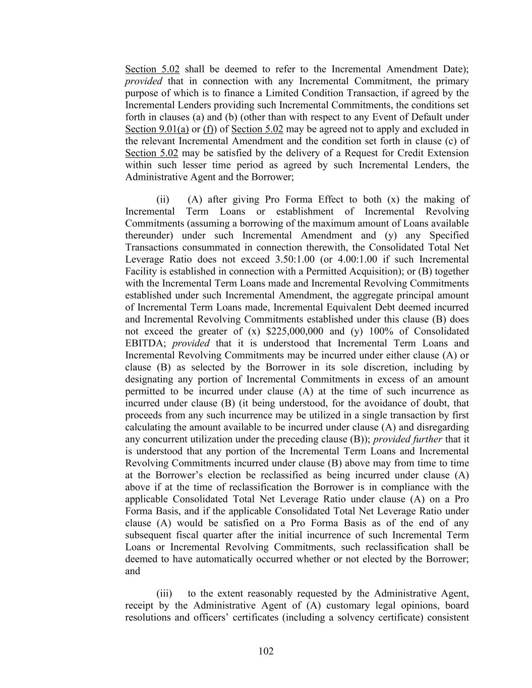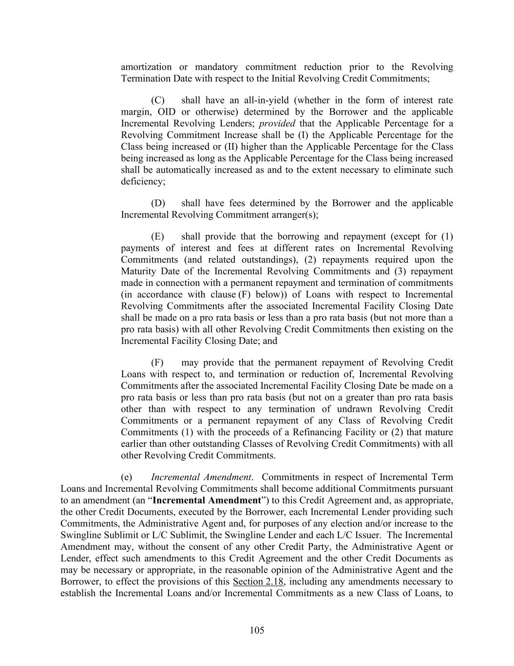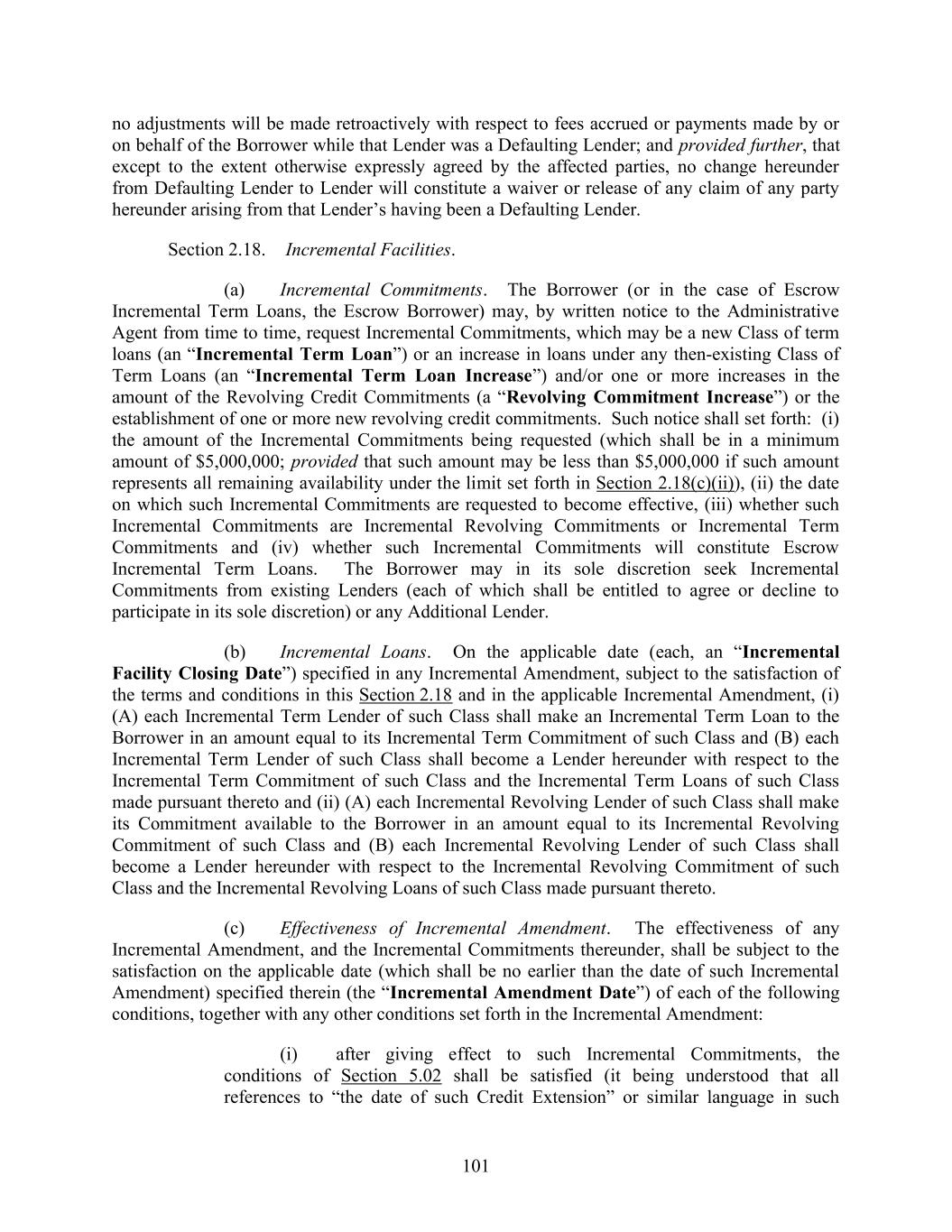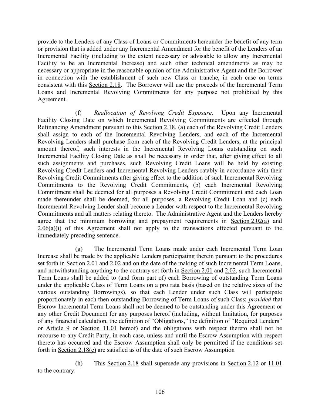 106 provide to the Lenders of any Class of Loans or Commitments hereunder the benefit of any term or provision that is added under any Incremental Amendment for the benefit of the Lenders of an Incremental Facility (including to the extent necessary or advisable to allow any Incremental Facility to be an Incremental Increase) and such other technical amendments as may be necessary or appropriate in the reasonable opinion of the Administrative Agent and the Borrower in connection with the establishment of such new Class or tranche, in each case on terms consistent with this Section 2.18. The Borrower will use the proceeds of the Incremental Term Loans and Incremental Revolving Commitments for any purpose not prohibited by this Agreement. (f) Reallocation of Revolving Credit Exposure. Upon any Incremental Facility Closing Date on which Incremental Revolving Commitments are effected through Refinancing Amendment pursuant to this Section 2.18, (a) each of the Revolving Credit Lenders shall assign to each of the Incremental Revolving Lenders, and each of the Incremental Revolving Lenders shall purchase from each of the Revolving Credit Lenders, at the principal amount thereof, such interests in the Incremental Revolving Loans outstanding on such Incremental Facility Closing Date as shall be necessary in order that, after giving effect to all such assignments and purchases, such Revolving Credit Loans will be held by existing Revolving Credit Lenders and Incremental Revolving Lenders ratably in accordance with their Revolving Credit Commitments after giving effect to the addition of such Incremental Revolving Commitments to the Revolving Credit Commitments, (b) each Incremental Revolving Commitment shall be deemed for all purposes a Revolving Credit Commitment and each Loan made thereunder shall be deemed, for all purposes, a Revolving Credit Loan and (c) each Incremental Revolving Lender shall become a Lender with respect to the Incremental Revolving Commitments and all matters relating thereto. The Administrative Agent and the Lenders hereby agree that the minimum borrowing and prepayment requirements in Section 2.02(a) and 2.06(a)(i) of this Agreement shall not apply to the transactions effected pursuant to the immediately preceding sentence. (g) The Incremental Term Loans made under each Incremental Term Loan Increase shall be made by the applicable Lenders participating therein pursuant to the procedures set forth in Section 2.01 and 2.02 and on the date of the making of such Incremental Term Loans, and notwithstanding anything to the contrary set forth in Section 2.01 and 2.02, such Incremental Term Loans shall be added to (and form part of) each Borrowing of outstanding Term Loans under the applicable Class of Term Loans on a pro rata basis (based on the relative sizes of the various outstanding Borrowings), so that each Lender under such Class will participate proportionately in each then outstanding Borrowing of Term Loans of such Class; provided that Escrow Incremental Term Loans shall not be deemed to be outstanding under this Agreement or any other Credit Document for any purposes hereof (including, without limitation, for purposes of any financial calculation, the definition of “Obligations,” the definition of “Required Lenders” or Article 9 or Section 11.01 hereof) and the obligations with respect thereto shall not be recourse to any Credit Party, in each case, unless and until the Escrow Assumption with respect thereto has occurred and the Escrow Assumption shall only be permitted if the conditions set forth in Section 2.18(c) are satisfied as of the date of such Escrow Assumption (h) This Section 2.18 shall supersede any provisions in Section 2.12 or 11.01 to the contrary.