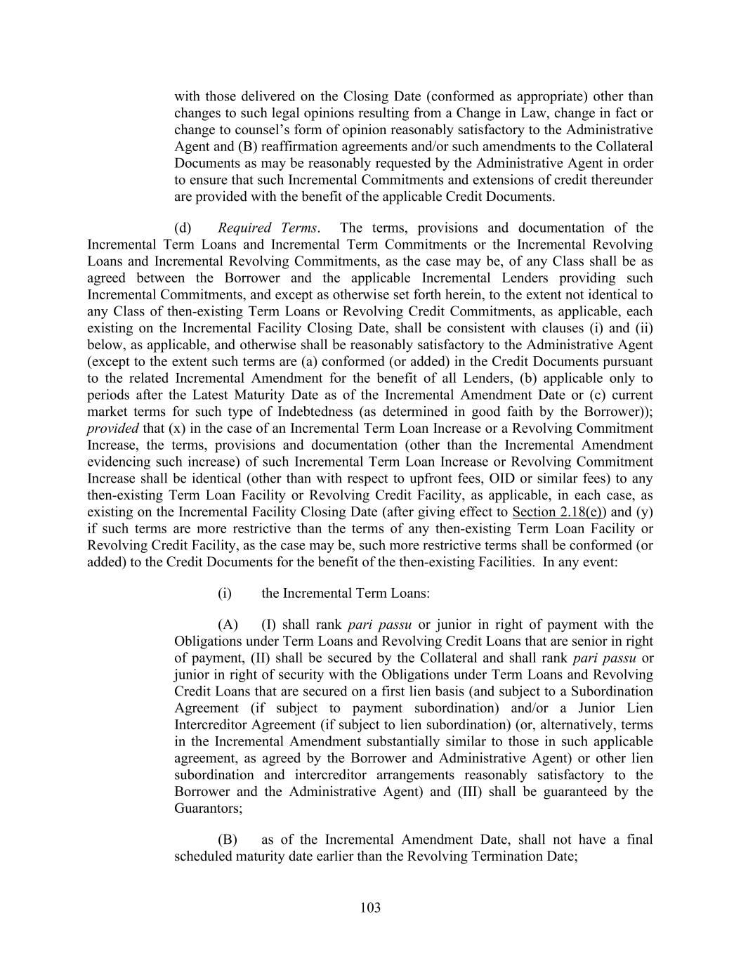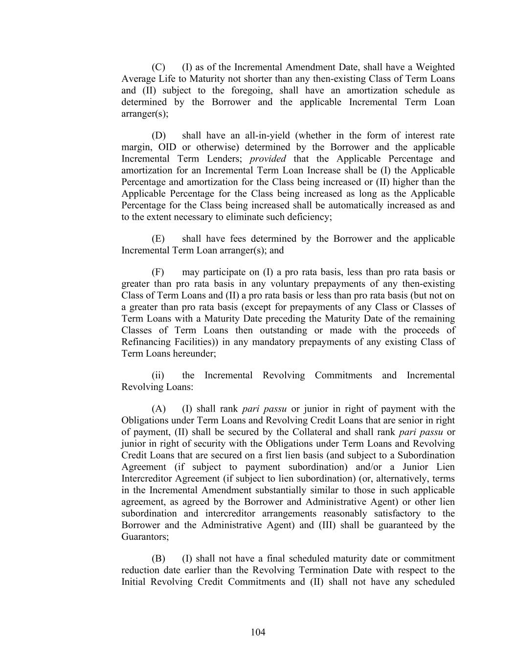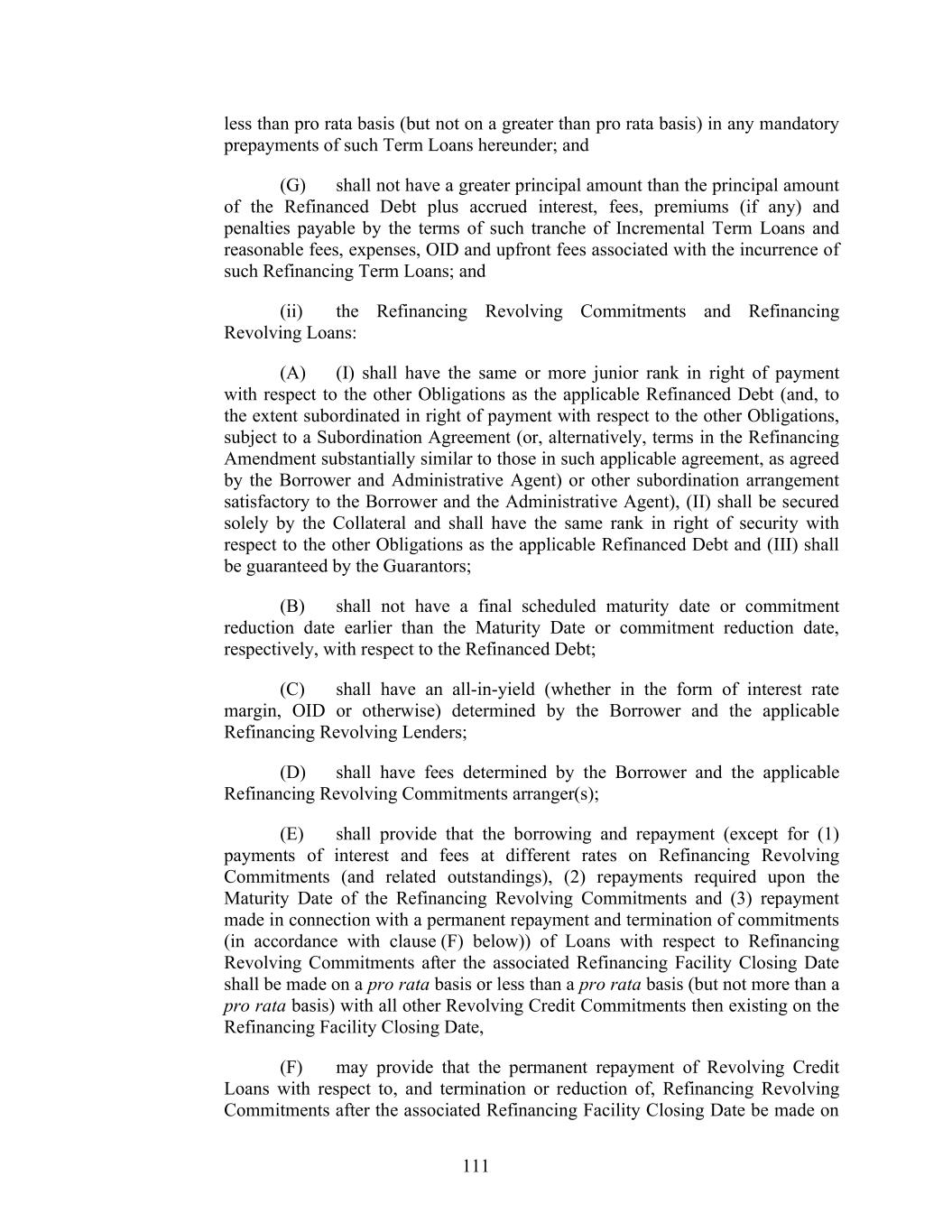 111 less than pro rata basis (but not on a greater than pro rata basis) in any mandatory prepayments of such Term Loans hereunder; and (G) shall not have a greater principal amount than the principal amount of the Refinanced Debt plus accrued interest, fees, premiums (if any) and penalties payable by the terms of such tranche of Incremental Term Loans and reasonable fees, expenses, OID and upfront fees associated with the incurrence of such Refinancing Term Loans; and (ii) the Refinancing Revolving Commitments and Refinancing Revolving Loans: (A) (I) shall have the same or more junior rank in right of payment with respect to the other Obligations as the applicable Refinanced Debt (and, to the extent subordinated in right of payment with respect to the other Obligations, subject to a Subordination Agreement (or, alternatively, terms in the Refinancing Amendment substantially similar to those in such applicable agreement, as agreed by the Borrower and Administrative Agent) or other subordination arrangement satisfactory to the Borrower and the Administrative Agent), (II) shall be secured solely by the Collateral and shall have the same rank in right of security with respect to the other Obligations as the applicable Refinanced Debt and (III) shall be guaranteed by the Guarantors; (B) shall not have a final scheduled maturity date or commitment reduction date earlier than the Maturity Date or commitment reduction date, respectively, with respect to the Refinanced Debt; (C) shall have an all-in-yield (whether in the form of interest rate margin, OID or otherwise) determined by the Borrower and the applicable Refinancing Revolving Lenders; (D) shall have fees determined by the Borrower and the applicable Refinancing Revolving Commitments arranger(s); (E) shall provide that the borrowing and repayment (except for (1) payments of interest and fees at different rates on Refinancing Revolving Commitments (and related outstandings), (2) repayments required upon the Maturity Date of the Refinancing Revolving Commitments and (3) repayment made in connection with a permanent repayment and termination of commitments (in accordance with clause (F) below)) of Loans with respect to Refinancing Revolving Commitments after the associated Refinancing Facility Closing Date shall be made on a pro rata basis or less than a pro rata basis (but not more than a pro rata basis) with all other Revolving Credit Commitments then existing on the Refinancing Facility Closing Date, (F) may provide that the permanent repayment of Revolving Credit Loans with respect to, and termination or reduction of, Refinancing Revolving Commitments after the associated Refinancing Facility Closing Date be made on